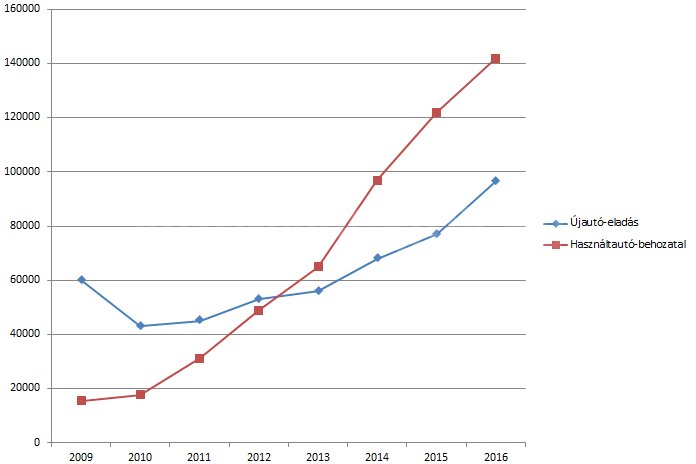 Míg 2015-ben még számain túl növekedésével is jelentősebb volt az új autók piacánál a használtautó-import, utóbbi bővülése lassult, tavaly már csak 15,8 százalékos volt, míg az új autók forgalomba helyezése tavaly is több mint 25 százalékkal bővült. Miként arról múlt héten beszámoltunk, az új személyautók piaca tavaly 25,1%-os növekedéssel 96 555 regisztrációt hozott, míg a használtautó-import 15,8%-os növekedéssel 142 002 autót. A két piac jelentősen eltér egymástól. Míg új autókat a privát kuncsaftok lassú visszatérése ellenére ma is zömében cégek vesznek, zömében cégek tudnak csak megengedni, a használt autók piacán a magánvásárló a domináns. Legyen szó akár itthoni, akár külföldi vásárlásról.