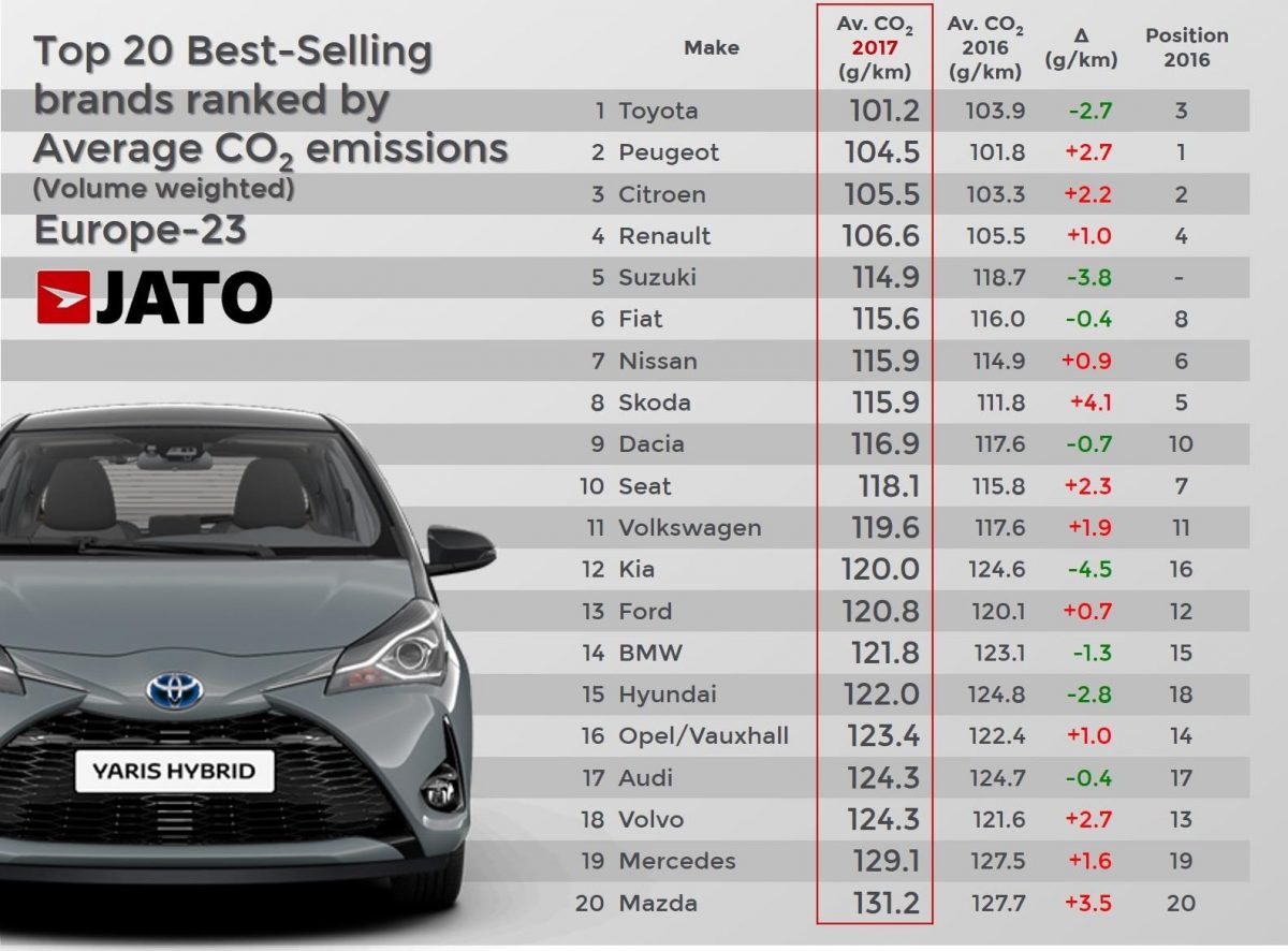 Ami az egyes márkák átlagos CO2-kibocsátását illeti, különösen azokat érintik rosszul a fejlemények, akik az elmúlt években dízeltechnológiájuk fejlesztésével értek el fogyasztás-csökkentést – jellemzően a német és francia tömegpiaci márkák –, érdemi javulást pedig azok a márkák mutathatnak fel, amelyek kínálatában a közelmúltban megjelentek a hibrid technológiák. Közöttük is kimagaslik a Toyota, amely a tavaly előtti harmadik helyéről az elsőre ugrott, méghozzá minden idők legkiválóbb CO2-átlagával: a 2016-os első helyezettnél 0,6 g/km-rel jobb értéket mutathat fel a japán márka.