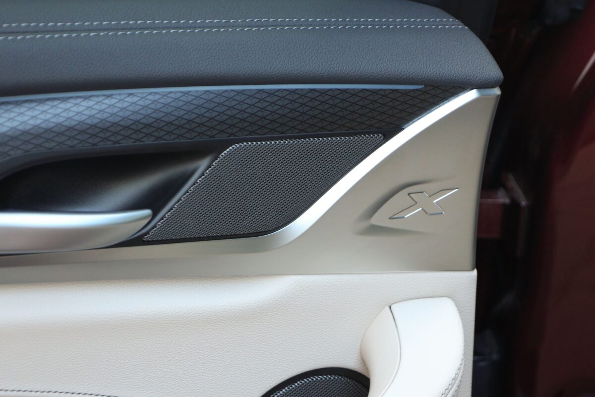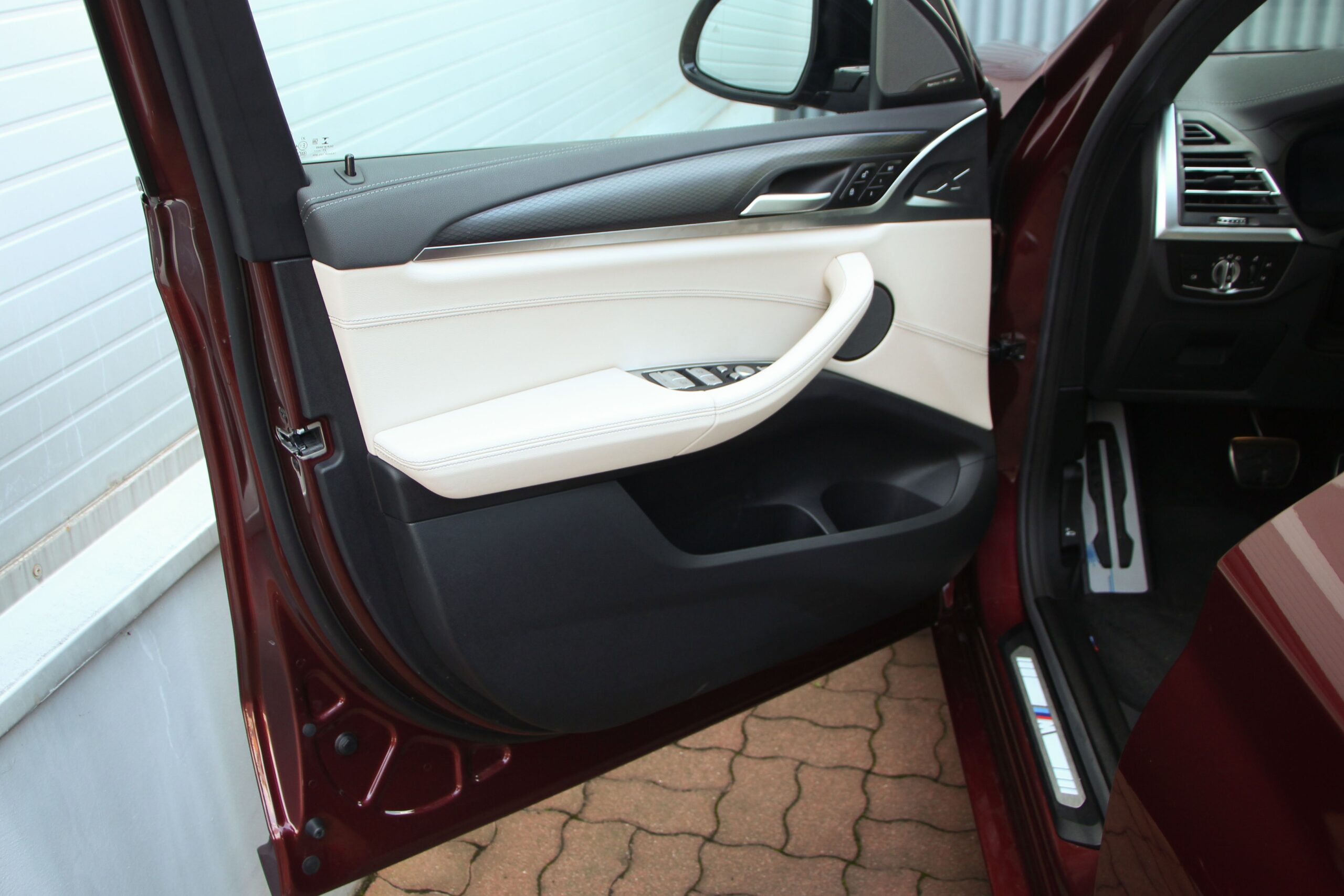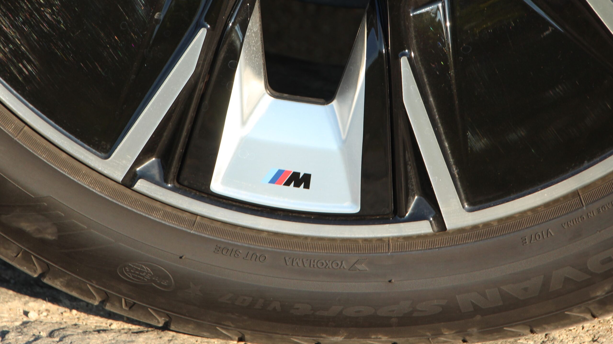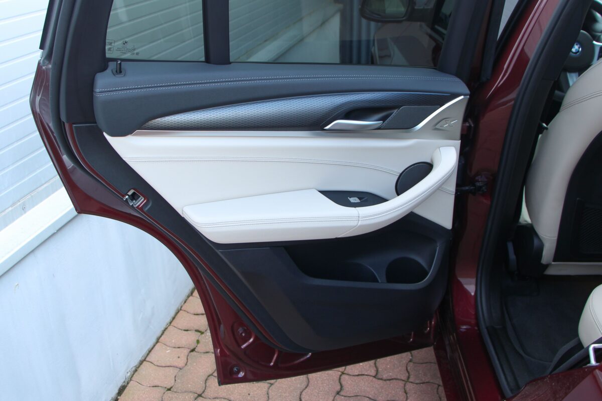 Ugyanúgy, ahogy az X3 és az X4 esetén, itt is a fényszórók változása a legfeltűnőbb, köztük is leginkább a hátsó lámpáké. De átrajzolták kicsit a lökhárítókat is. Megmaradtak a vesék, igaz nőttek is minimálisan, illetve megpróbálták valódi légbeömlőnek álcázni őket a mintázatukkal. Ezt mindig is jó irányvonalnak tartottam, mert így sokkal jobban hasonlít a megszokottra, ezáltal szerintem emészthetőbb, kívánatosabb a forma. Elölről nézve egyébként szélesebbnek is hat az autó a 10 milliméterrel elvékonyított fényszórókkal, és ami még fontosabb, jóval sportosabb az összkép, ami fontos, ha már a BMW a saját maga alkotta kategórianévvel is ezt akarja hangsúlyozni. Hátul a kipufogónyílásokat és diffúzort egyszerre imitáló díszbetét most nem kék, de az nem is illene a hivatalosan vörös, bár fényviszonyoktól függően olykor bordónak tűnő fényezéshez. Természetesen új könnyűfém felnik is megjelentek, a tesztautón a villany-BMW modellekre jellemző, kéttónusú fényezéssel ellátott, 20 colos darabok koronázták meg a dizájnt.