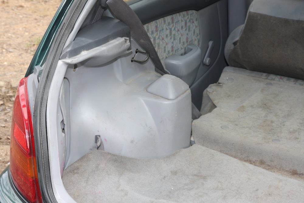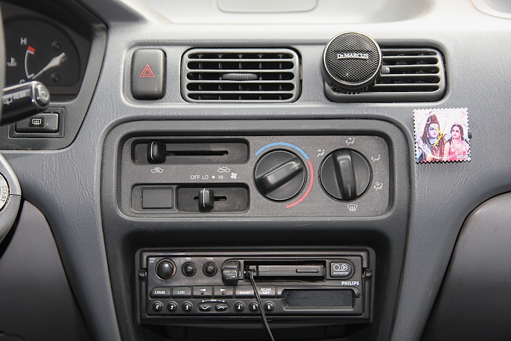 Már elhangzott, hogy nem egy túlextrázott autó, épp ellenkezőleg, úgyhogy műszerfal-középkonzol kombója is puritán, felesleges gomberdőtől mentes. Fűtés, vészvillogó, szivargyújtó, a sofőrüléstől balra a betöltőnyílás és a csomagtérajtó nyitókarjai, utóbbi kulccsal is feltárható. Hátsó üléstámlája osztottan dönthető, előrebucskáztatott ülőlapokkal sík terepet képezve növeli a csomagtartó befogadóképességét. Az ajtózsebeken és az egész tisztességes méretű kesztyűtartón kívül nincs nagyon tárolórekesze, pláne fedett. Kárpitozása bájosan béna, de igen jól tartja magát, és ugyanez jellemző a műanyag részletekre is, semmilyenek, de ellenállóak. Komfortja is hasonló: a székek nem tartják ideális helyzetben a gerincoszlopot, nem lehet magasságot állítani, vagy aláfűteni, de különböző termetek is egész kényelmesen elücsöröghetnek bennük.
