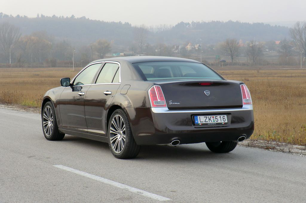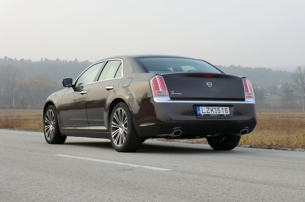 Bár az olaszok ezt nem hangoztatják, a Thema hátsókerékhajtású. Egyértelműen nem sportlimuzin, de azért a műfajt kedvelőknek nyugodtan ajánlható – a kormányon így biztosan nincs semmiféle hajtási befolyás, jól lehet vele kanyarogni országúton. Hogy városban milyen, azt egyelőre nem sikerült megtapasztalnunk – majd később, a teszt során kiderítjük. Vidéken, még a hazai utakon is stabilan fut, ugyanakkor elöl kettős keresztlengőkaros, hátul multilink futóművével még az Exectuvie malomkőnyi, 20 collos kerekeivel is kellemesen ringat a Thema. Az utazóautó-jelleget erősíti a remek belső helykínálat, és némileg csorbítja a még a középkategóriában is szerény méretű, 462 literes csomagtér. A dízelt vezetve elmondható, hogy az halkan duruzsol, rezonanciája tompa és minimális, ötfokozatú automatája finoman kapcsol.