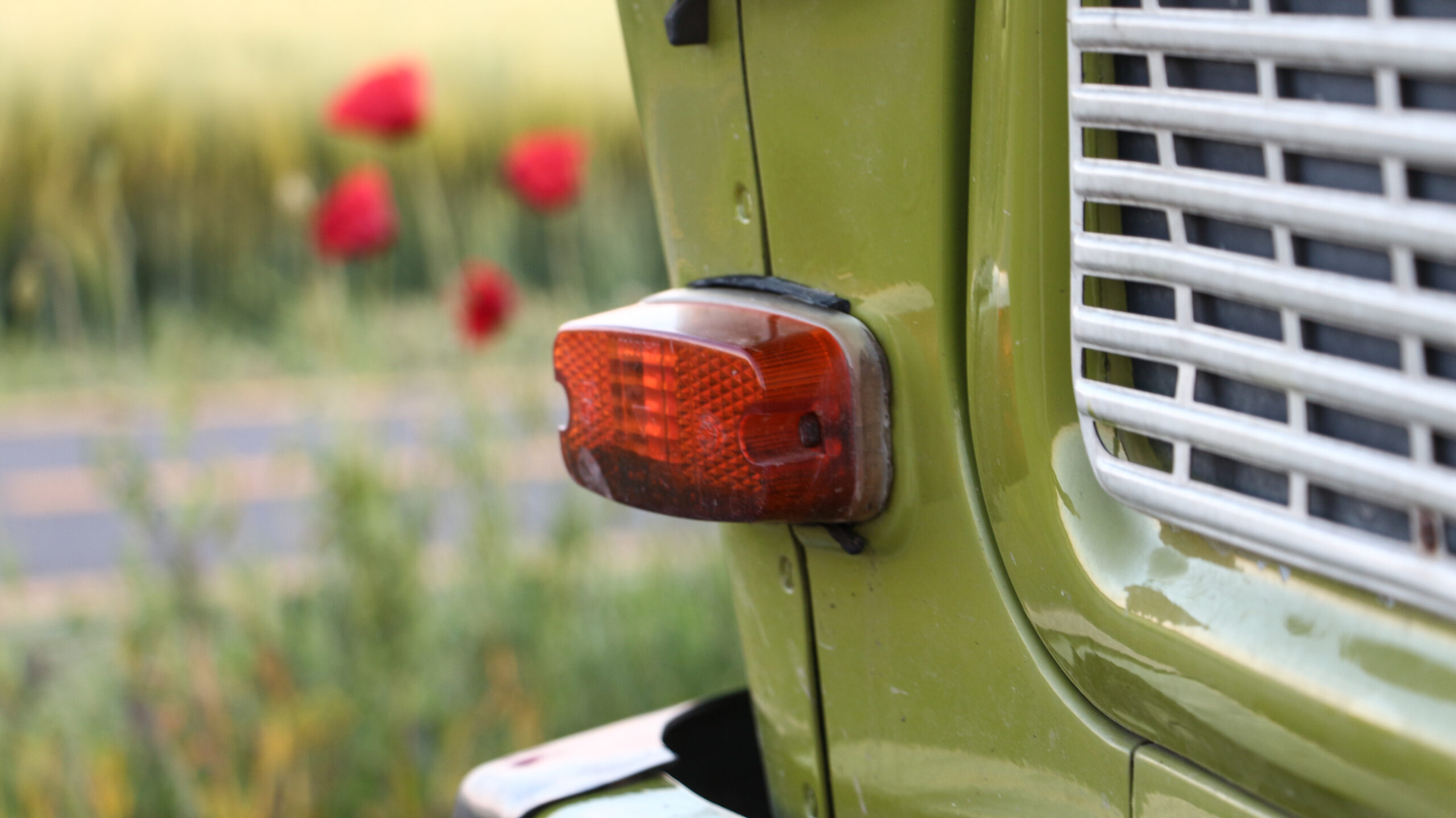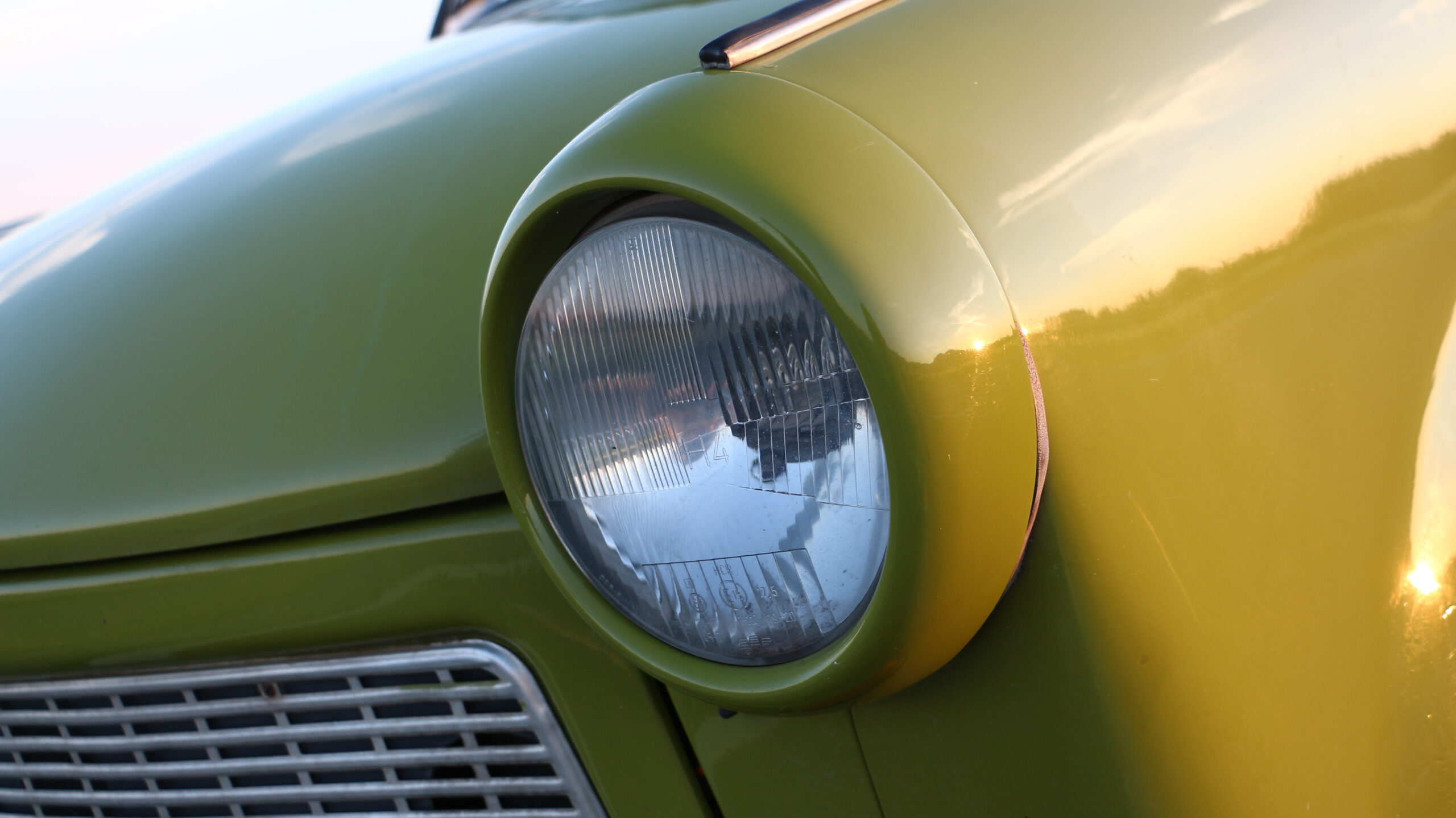 Érdekes részlet a két látható csavarral rögzített, a főfényszórótól különálló indexbúra, és a hírhedt Trabant logó, ami szinte az összesről le van törve, ezen a példányon viszont szerencsére ép