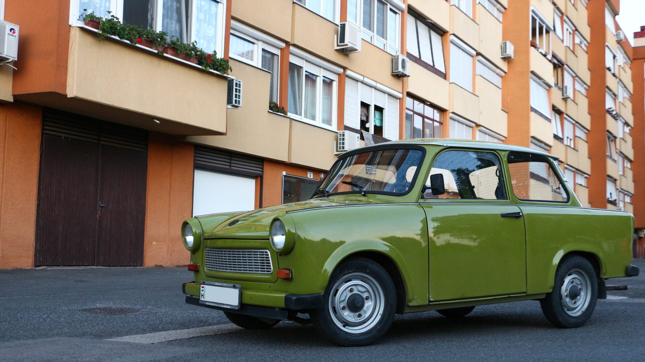 A Trabant, avagy a szocialista megoldás a tömeges mobilitásra, háttérben a korszak tömeges otthonteremtési programjának eredményével, a panelteleppel