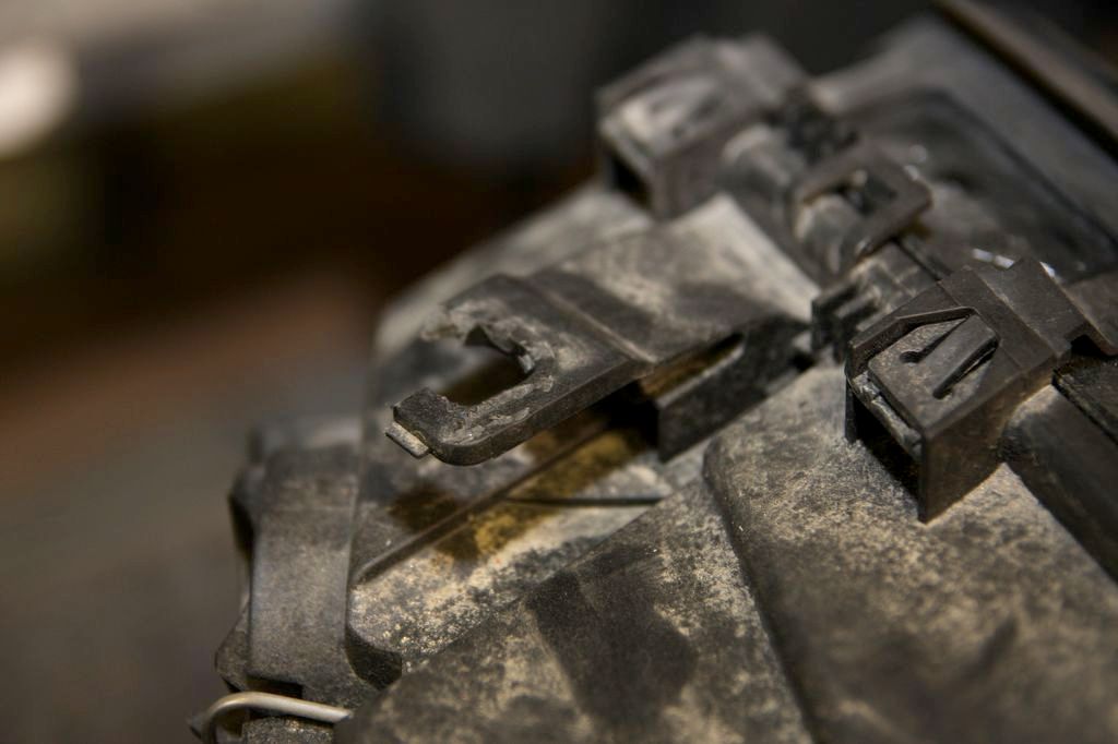 Noha magát a javítási folyamatot nem láttuk, de azt igen, hogy mi minden orvosolható még: egy BMW X6 lökhárítójának alja például magas járdaszegélynél sérült, nem csak a fényezett elemet borító matt betét, hanem maga a főelem is tört. Ez már komplexebb feladat, de szerencsére a betét törött rögzítő elemeit is összegyűjtötte a tulaj, így azokat elég ragasztani és nem kell saját szobrászmutatványként legyártani, mint mondjuk a legtöbb lámparögzítő fül esetében. Azok ugyanis gyakran már rég kihullanak az autóból, mire észrevehető, hogy a lámpa lötyög. A poliuretán, duroplaszt és elasztomer (hőre nem lágyuló, hanem keményedő) műanyagok ragasztásos javítását nem úgy kell elképzelni, ahogyan a mindennapokban szokás, kevés lenne a néhány milliméteres illesztési felület ahhoz, hogy az elemek fixen rögzíthetők legyenek. A ragasztásos javítás első lépése a hegesztésessel azonos: az elemek beállítása, rögzítése, szükség szerint akár pillanatragasztóval egymáshoz illesztése. Mivel itt nem csak a repedések, illetve törések mentén, hanem jóval nagyobb felületen javítanak, a repedés/törésvonal mentén 3-4 centiméter szélességben csiszolják az anyagot, majd a portalanított felületre ilyen szélességben viszik fel a ragasztóanyagot, melybe műgyanta-ragasztóval átitatott üvegszövetet tesznek a kötés erősítéséért. A ragasztásos rögzítés lényegében egy nagy felületű pántolás, melyet rendszerint az anyag belső oldala felől végeznek, a külső, látható oldalon pedig a hegesztéseshez hasonló eljárással kívülről csak kitöltik a repedést, hogy az elem teljesen eredeti formájú legyen.