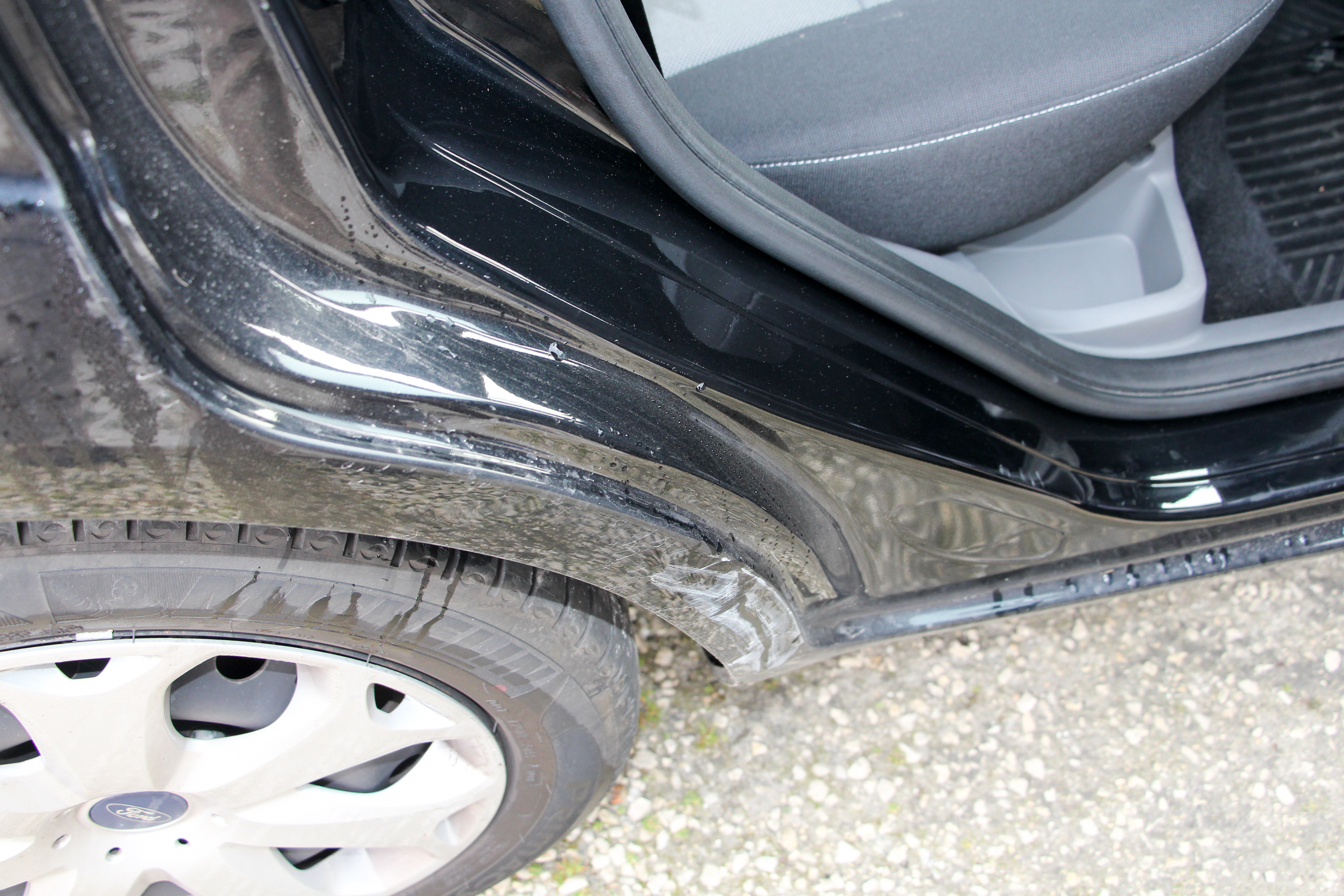 Minimális gyűrődés a sárvédő kerékjárati ívén, viszont épp elegendő ahhoz, hogy belül is megtörjön az üregvédelem. Ha ezt nem bontják le, nem cserélik, az autó záros időn belül rozsdásodni fog