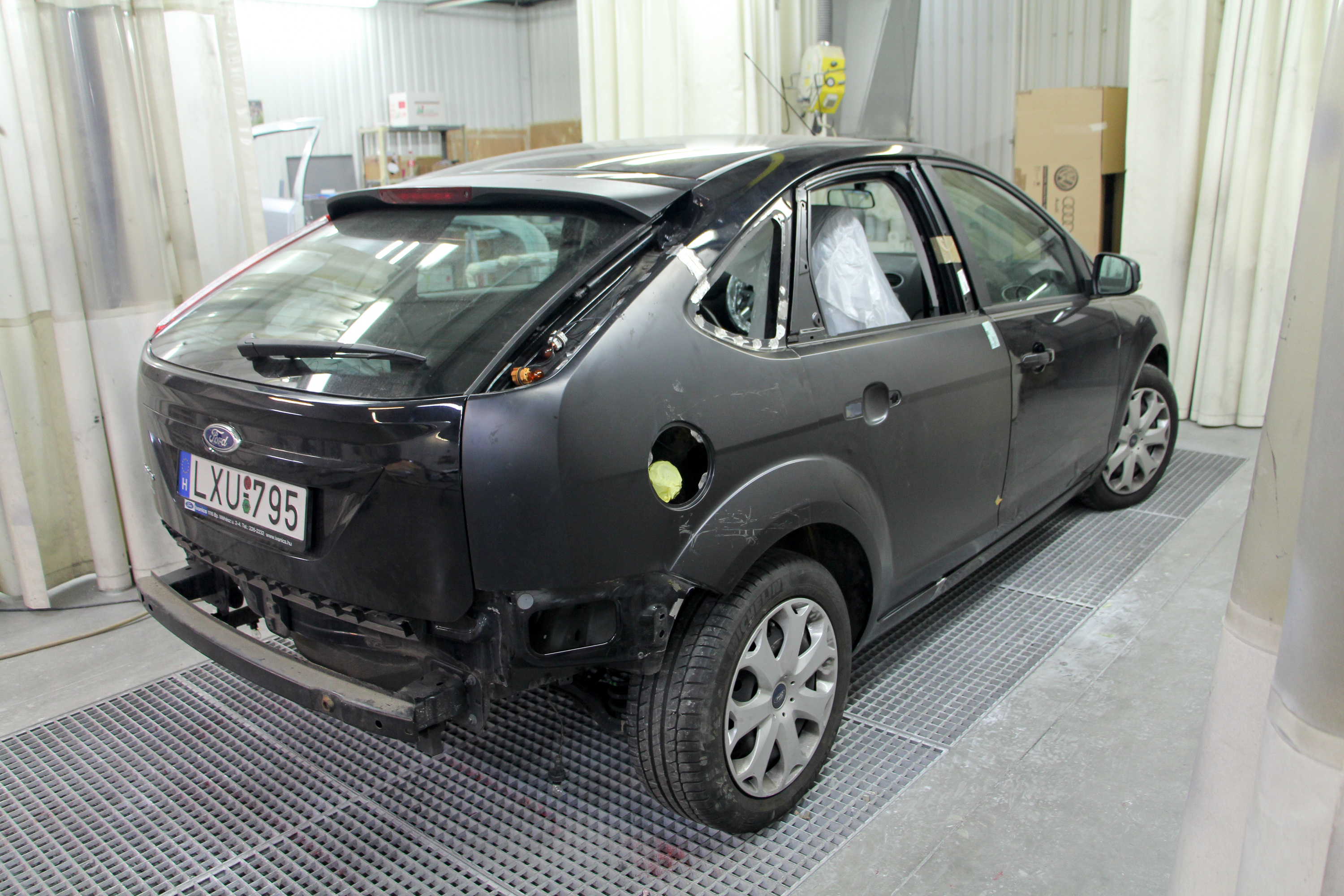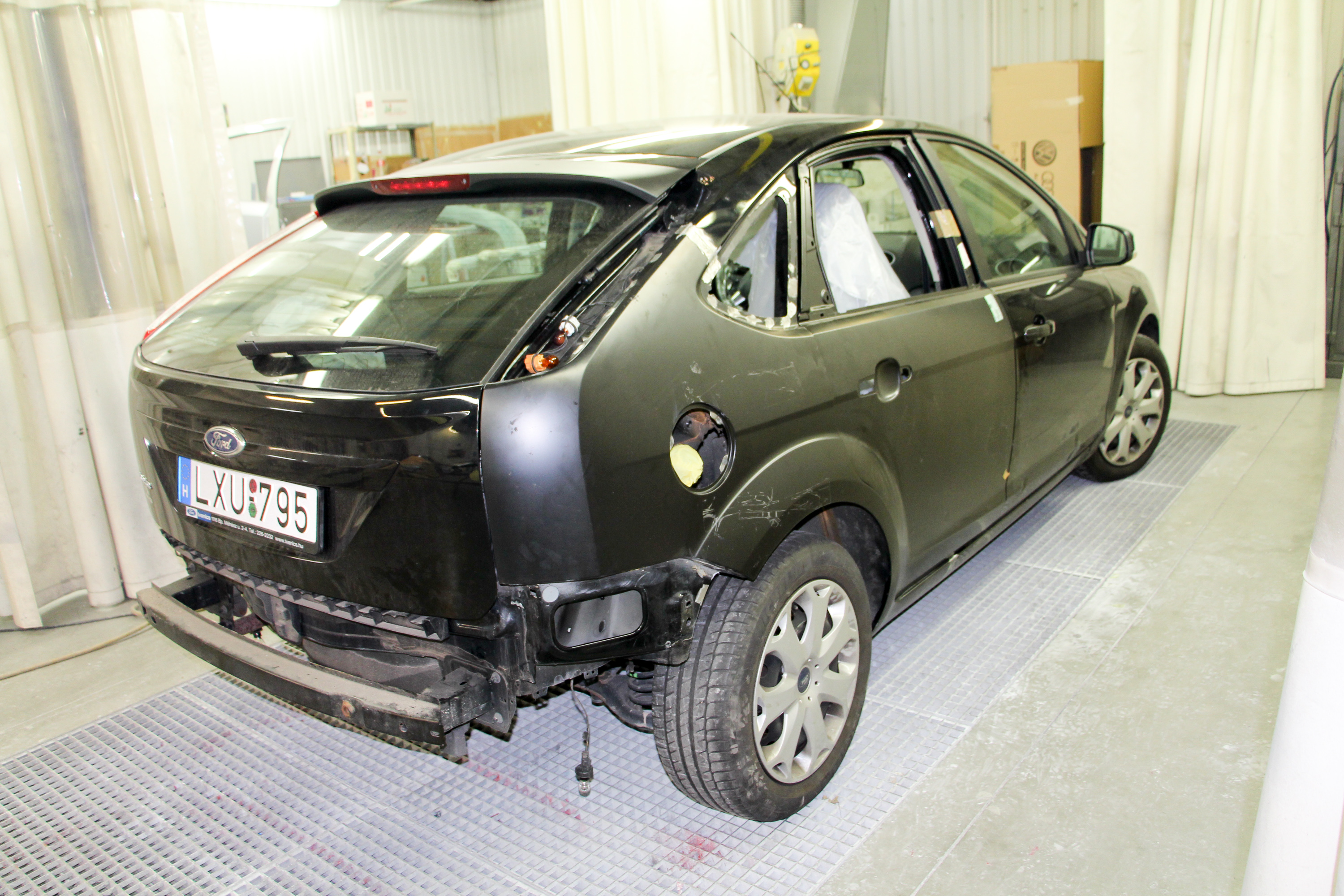 Nem csak az ajtót, a sárvédőt is cserélni kell. Azt pedig a küszöbnél, illetve a hátsó oldalablaknál vágva lehet kivenni, illetve berakni. A Focus jobb hátsó sarkát le kell bontani, az üveget ki kell vágni, szét kell flexelni a lemezeket, lefúrni a ponthegesztéseket, majd az új, a kivágottakkal azonosan méretre vágott elemeket fel kell hegeszteni. Nagy vonalakban lépkedve mindezek után jöhet a fényezés előkészítése. Csiszolás, filler alapozó felfújása, újabb csiszolás, alapozás, hőkamrás fényezés, utána pedig már csak vissza kell rakni a lebontott elemeket, fel kell építeni az autót a pőre lemeztől az utolsó kárpitdarabig, vissza kell ragasztani az oldalüveget, össze kell rakni az új ajtót a régi zárral, kilinccsel, ablakemelővel, minden kárpitelemmel. Itt egyébként új külső kilincs is kellett, az is sérült ugyanis, takarókupakjával együtt. Összességében tucatnyi alkatrész kellett az első pillantásra csak egy új ajtót igénylő javításhoz.