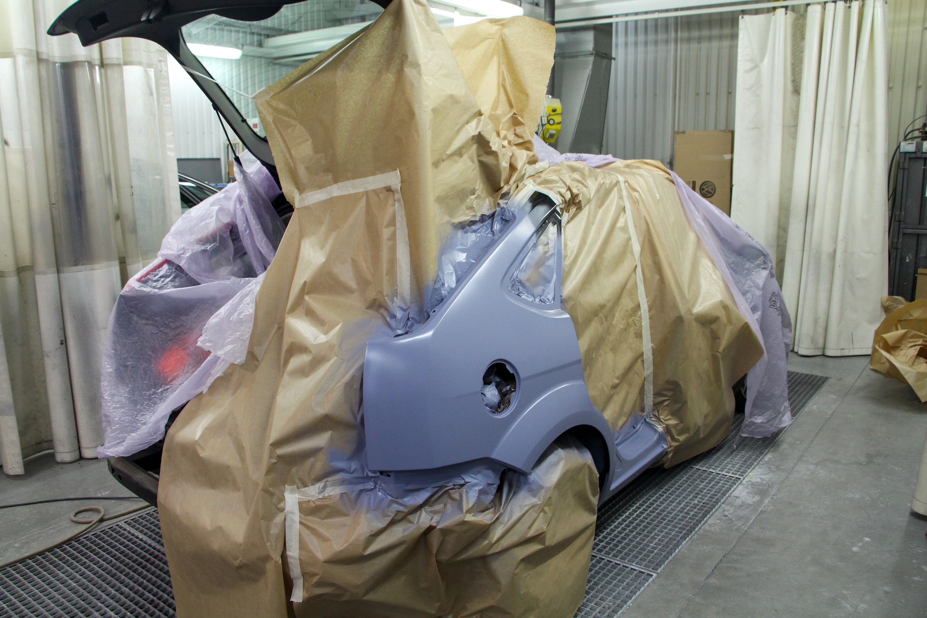 Csiszolás után a filler a karosszérián, csiszolva a gyári új hátsó ajtó is. A fényezőkamerában járunk, ahol 60 Celsius fokon égetik be a festéket