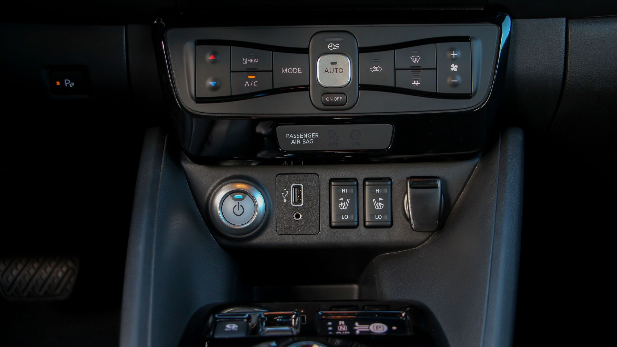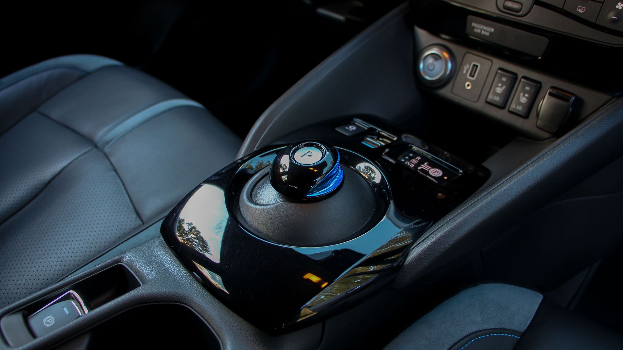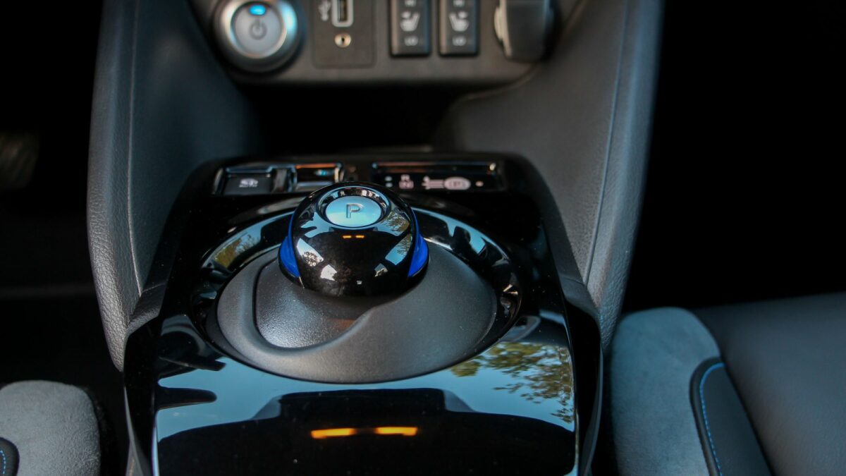A megszokott félgömb kapcsolóval választható a menetirány és a fokozott visszatöltést adó B mód, a rögzítőfék elektronikus és automata, a klíma hőszivattyús, az opciós parkolóasszisztensnek nincs sok értelme, bőven elég segítség a felülnézeti képet adó 360 fokos kamerarendszer