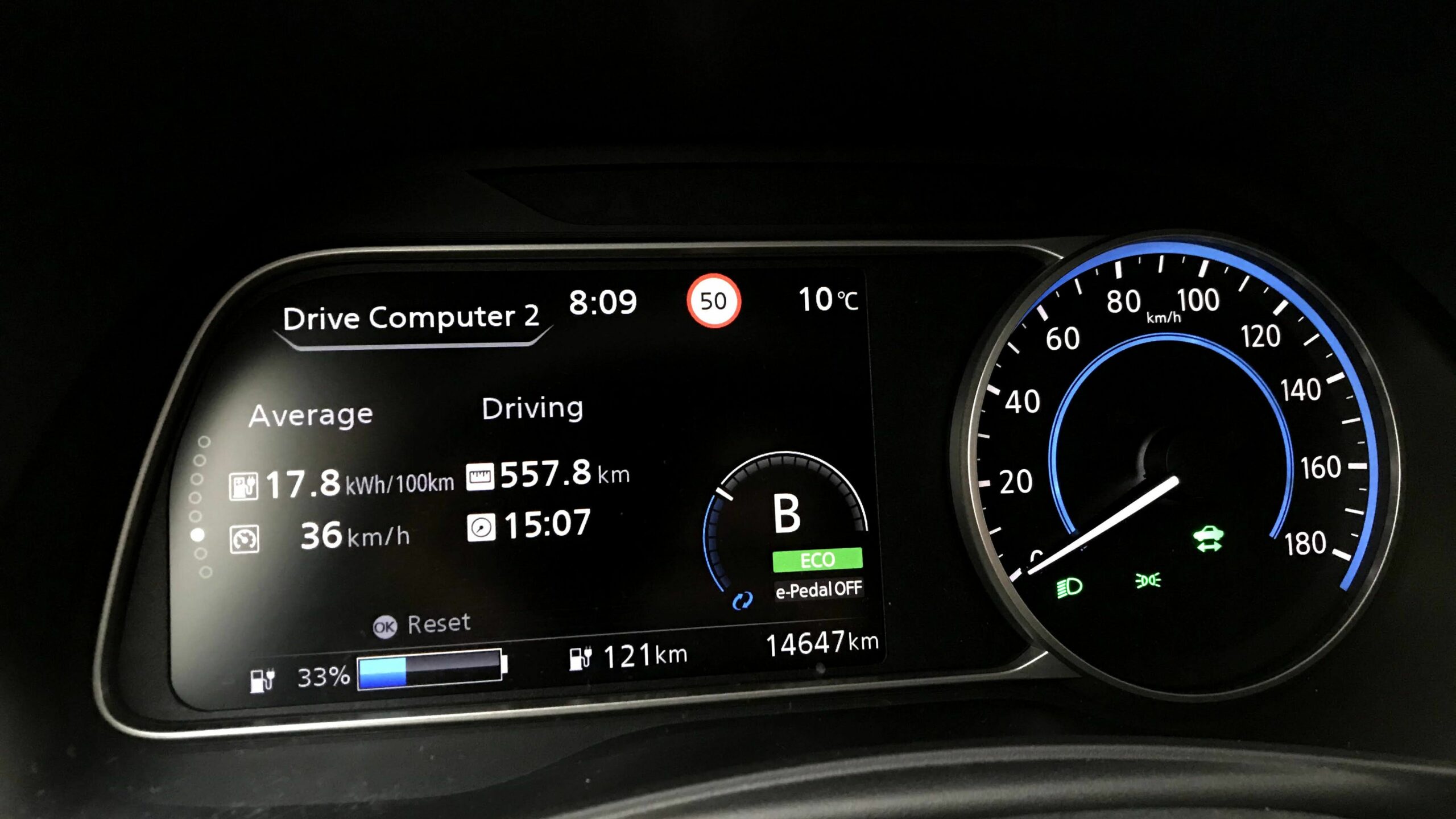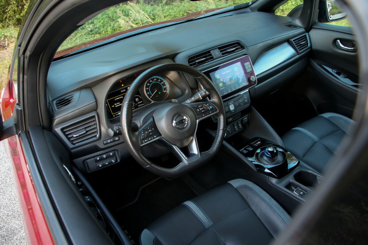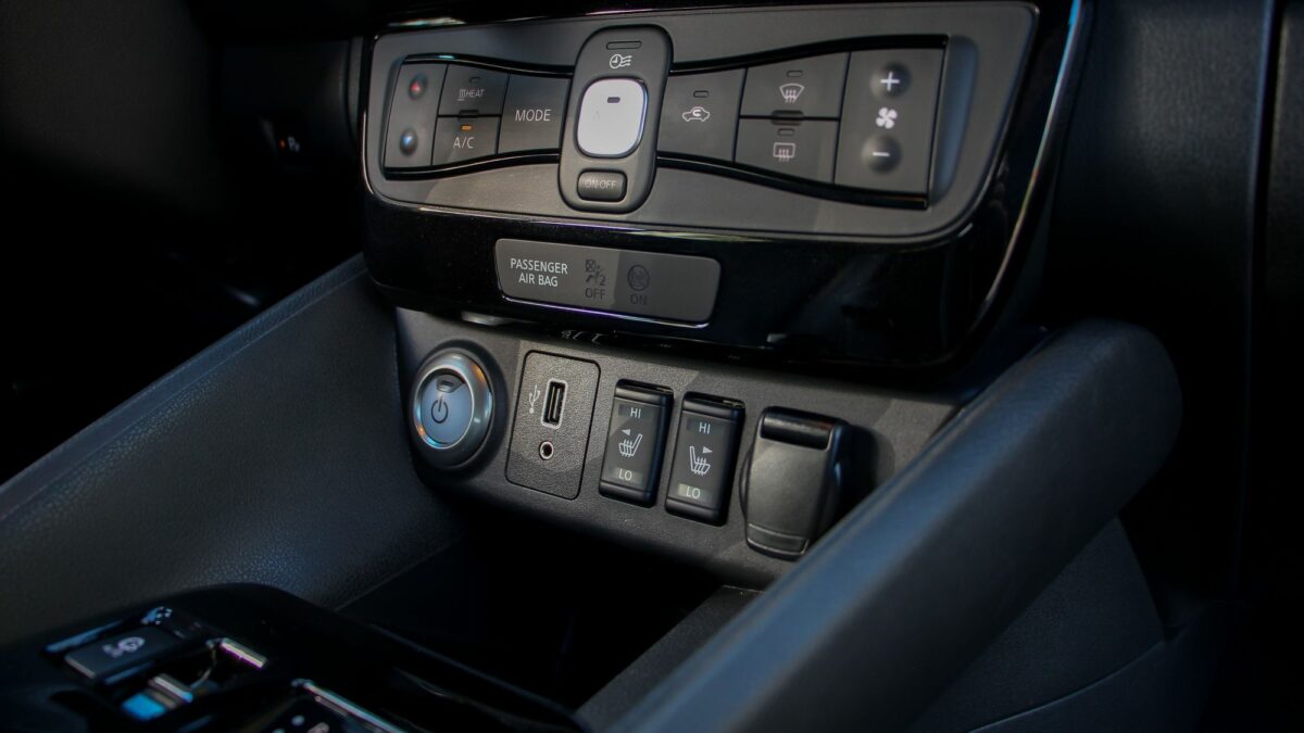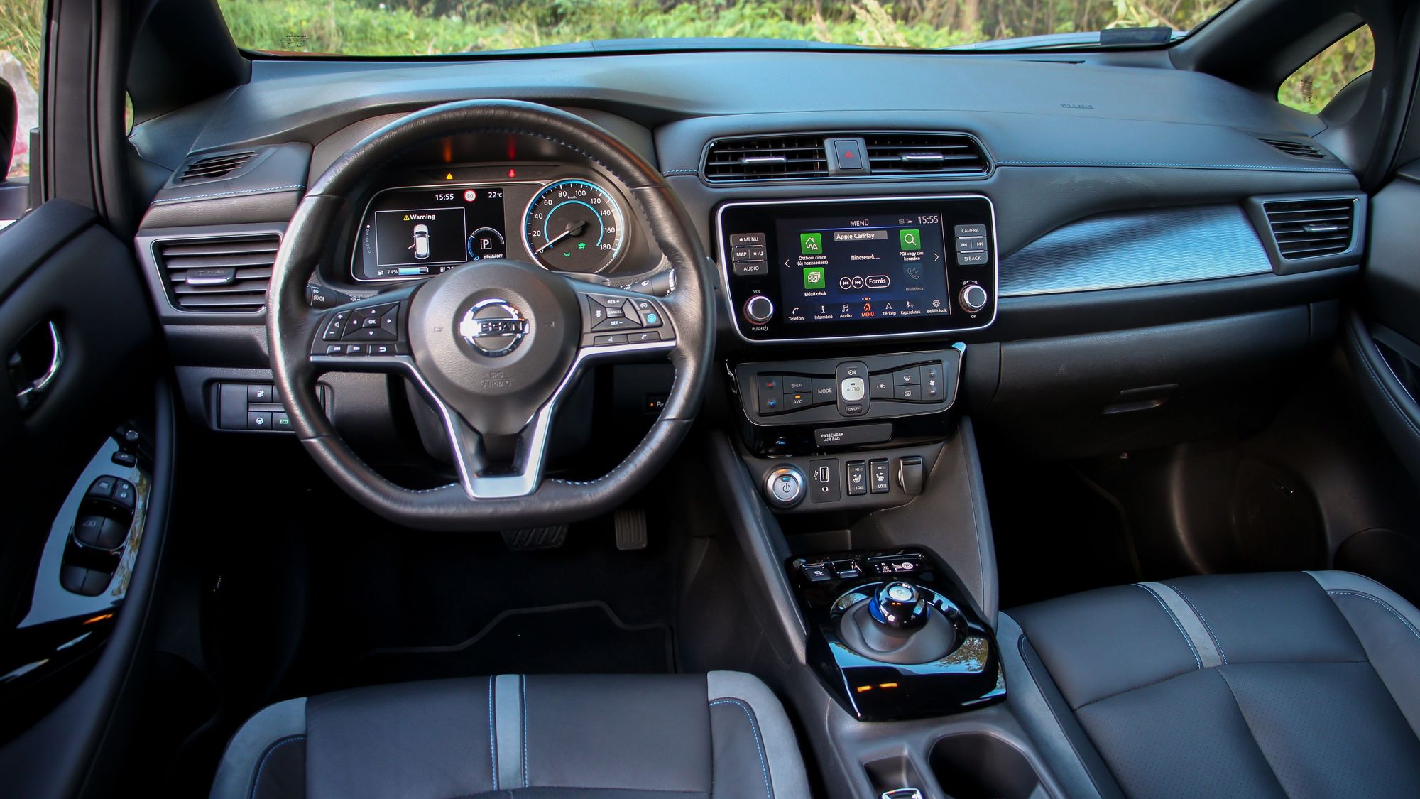 A megszokott félgömb kapcsolóval választható a menetirány és a fokozott visszatöltést adó B mód, a rögzítőfék elektronikus és automata, a klíma hőszivattyús, az opciós parkolóasszisztensnek nincs sok értelme, bőven elég segítség a felülnézeti képet adó 360 fokos kamerarendszer