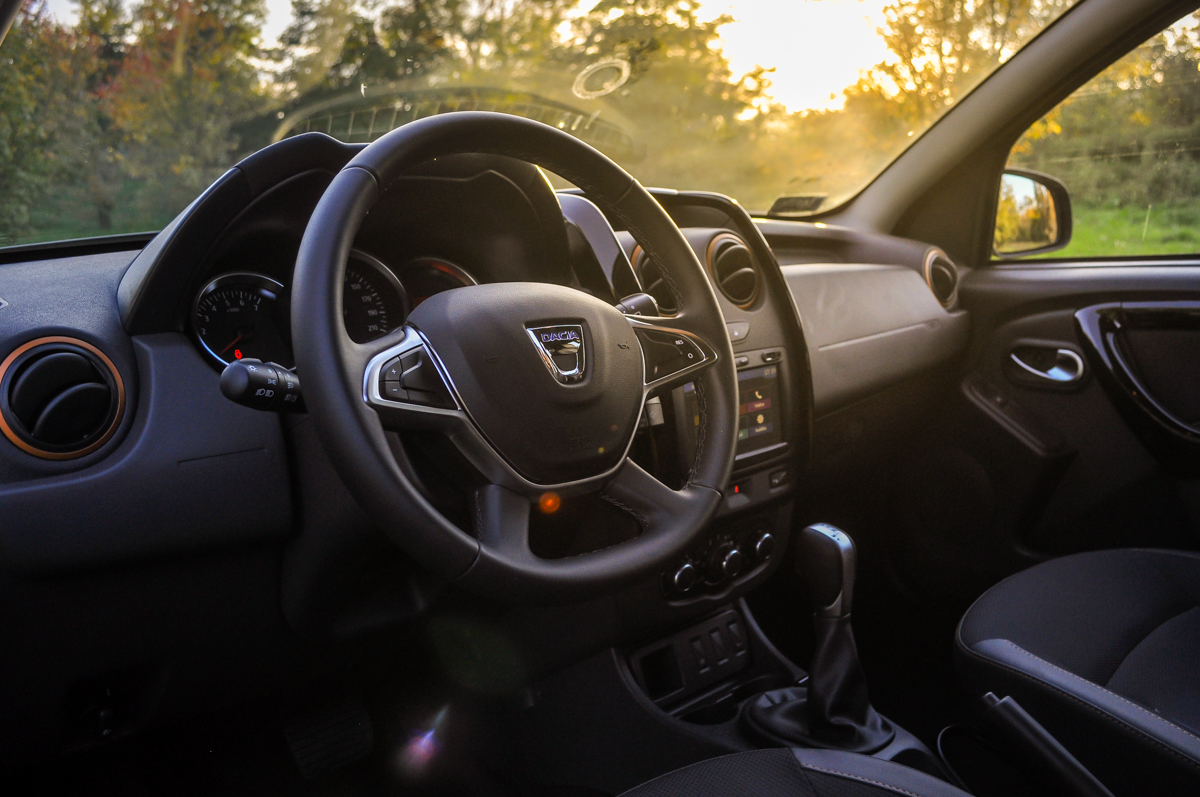 Frissítése óta már odafigyeltek olyan finomságokra, mint a jobb fogású bőrkormány – ami egyébként egész mutatós is – vagy éppen a narancs légbeömlőkarimák. Utóbbi színt egyébként örökölheti a 150 000 forintos felárat jelentő félbőr ülések varrása is, amik ugyan továbbra is rövid ülőlapot adnak, de egész kényelmesek. Még Duster felirat is jutott rájuk. Ez igen! Itt már egész egyszerűen nem nyomasztó a környezet és ezt igenis értékelni kell. Ahogy a szögegyszerű, néhol puritán lemezét mutató, de öblös 475 literrel ellátott csomagteret is. Ilyen ársávban amúgy se legyen nagy igényünk.