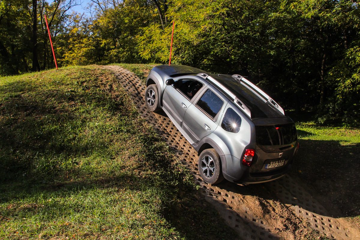 Apropó terepezés, döbbent arccal álltunk a Groupama Tanpályán, mikor Katona Csaba megmutatta nekünk, hogy miért is lenyűgöző szegmensében a Duster 29,3 fokos első, 34,9 fokos hátsó és 23 fokos átlépő terepszöge. A puritán közvetlenség ezen a terepen jött igazán jól, a nehézkes szervójú kormányban a talaj minden rezdülését érezni, a futómű pedig meglepő puhasággal lendített át a korántsem barátságos terepen. Mintha Daciáék a SUV kézikönyv helyett véletlenül a terepjárókét kapták volna le a polcról. Úgyhogy jól bedobták a pótkereket is a váz alá, mert az úgy menő. Ennél durvább tereppel pedig jó eséllyel nem sűrűn találkozik egy kompakt szabadidő-autó. Az a tapasztalat, hogy csak évi pár alkalommal veszik igazán hasznát a feláras összkerékhajtásnak, a Dusternél pedig szinte nem is indokolt költeni rá. Egyébként éppen ekkor járt nálunk a Lada 4X4 Urban is, amivel össze is vetettük, de erről majd egy későbbi anyagban.