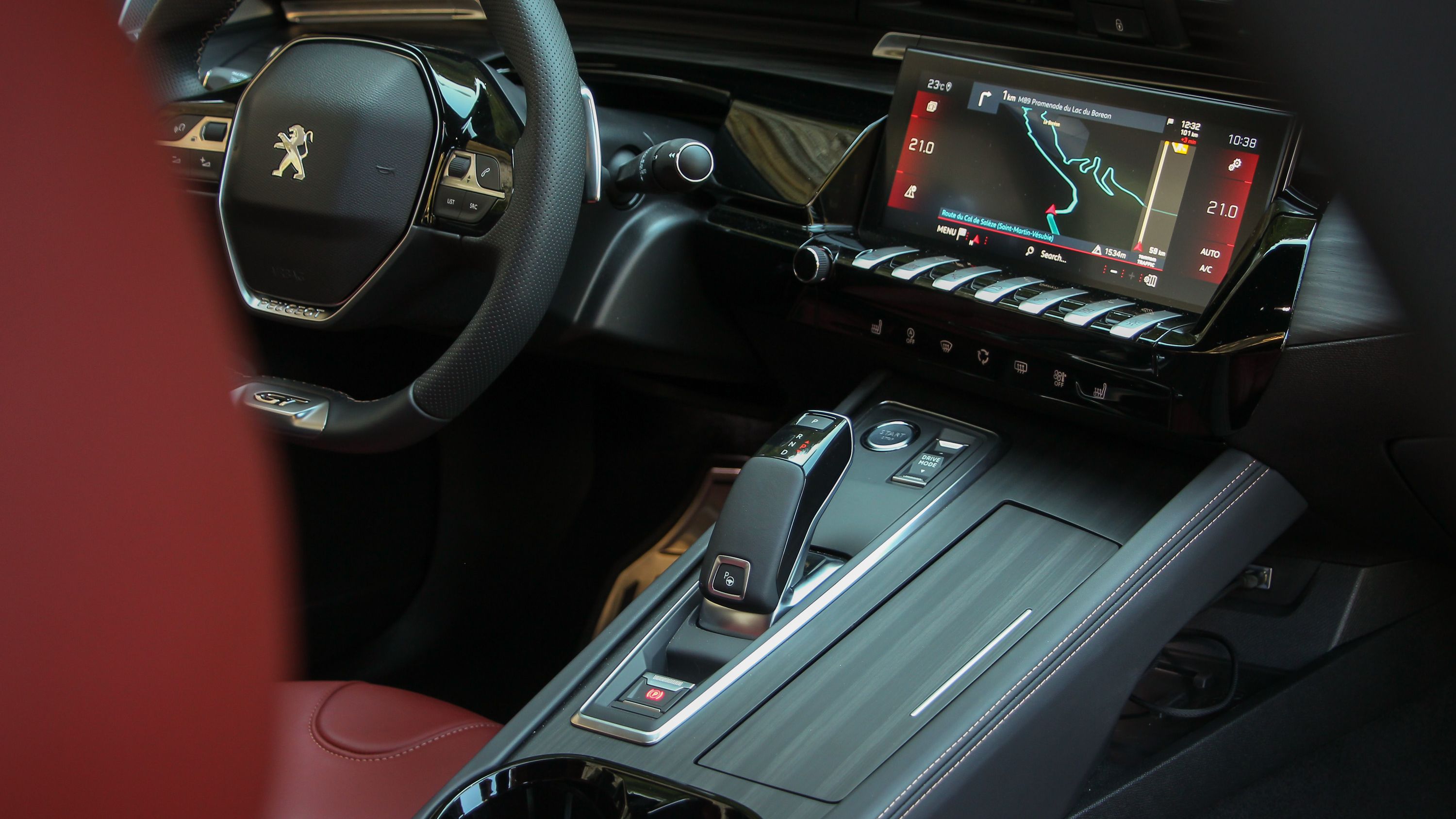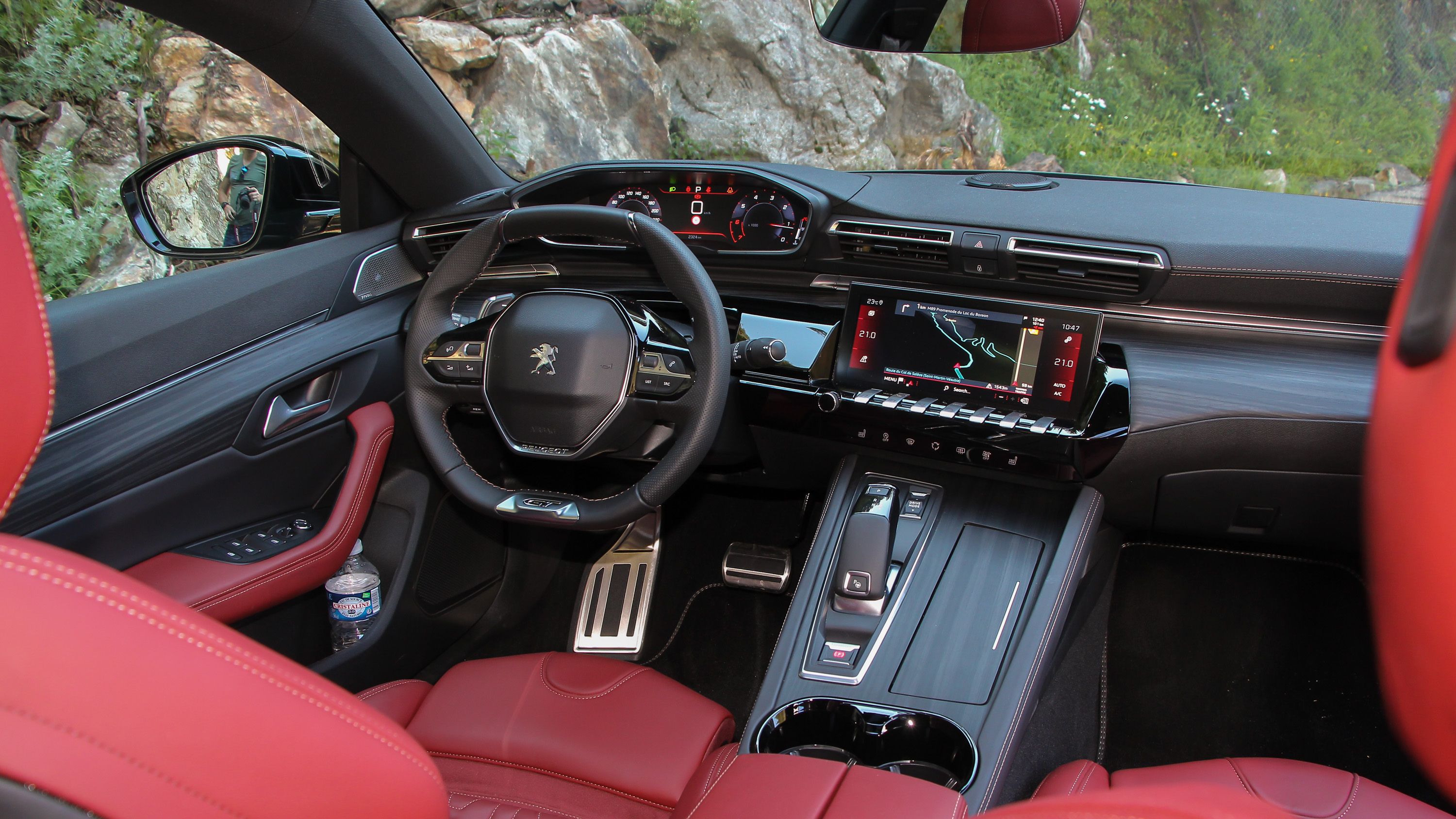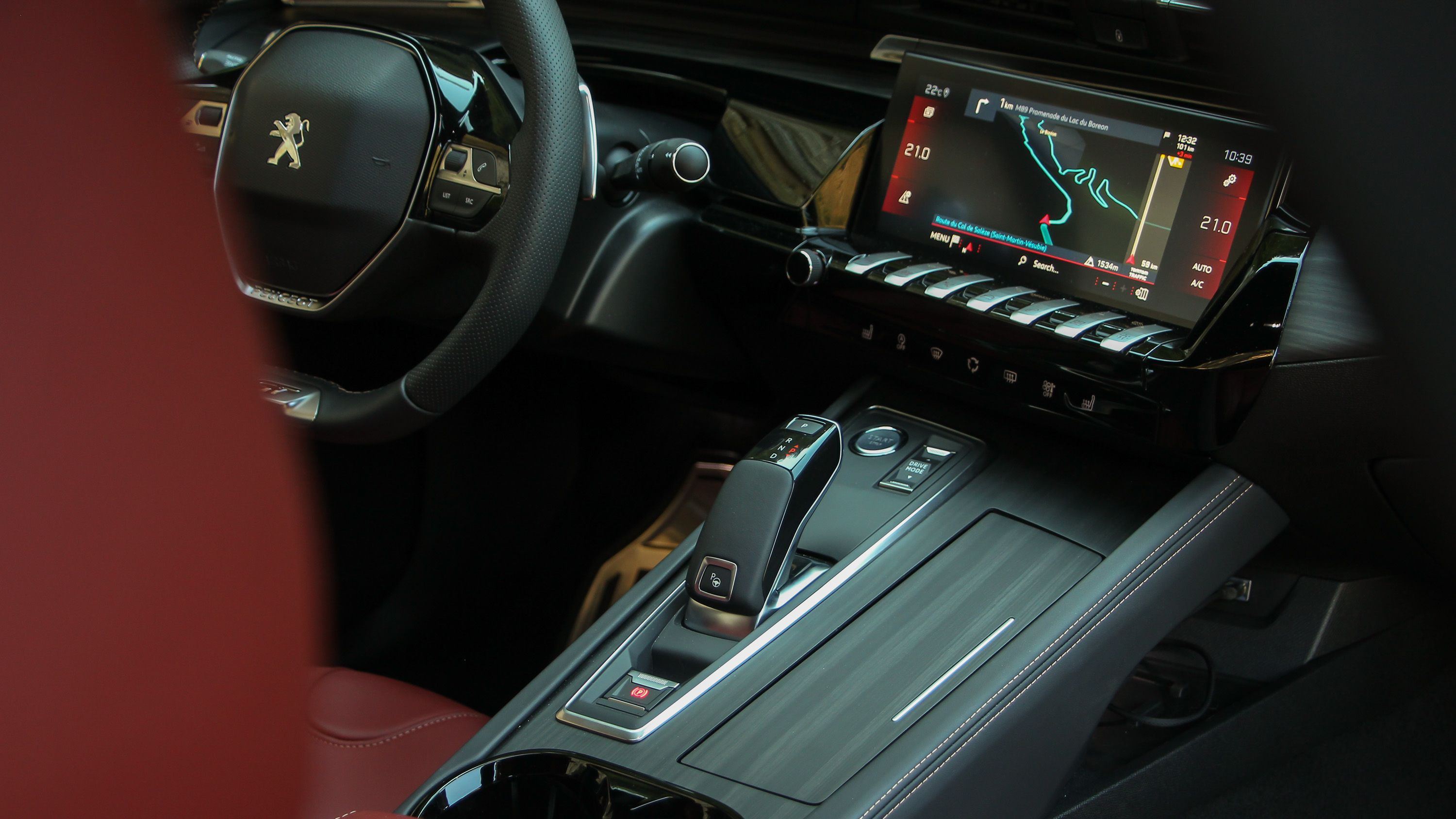 Az ötödik utas kivételével mindenki kényelmes üléseket kap, az elsők akár AGR tanúsítványosak és masszázsfunkciósak, szabályozható deréktámaszúak és laphosszúságúak. Nem csak jó, egyenesen kényeztető bennük hosszú távon ülni. Nagy plusz pont, hogy a kárpitválaszték (akár mogyoróbarna vagy bordó bőrrel, alcantarával) prémiumgyártókat idéző, ami nem is véletlen. A Peugeot a tömeggyártók között a csúcsra kíván törni, angolul high-end generalist brand-ként aposztrofálják magukat. Passzol ehhez a magasra emelt műszerblokkos és alul-felül csapott kormányos i-Cockpit, aminél a sofőr előtti 12,3 colos, HD minőségű kijelző 6 különböző megjelenítést kínál, valamint a márkánál és a kategóriában először éjjellátó rendszer képét is megjelenítheti. A 3008 és 5008 modellektől ismerős a középkonzol 8, vagy az Allure szinttől már 10 colos kapacitív érintőkijelzője, ami hét darab billentyűs gombbal közvetlen elérést ad egyebek mellett az audiorendszerhez, a klímához, a navigációhoz és a telefonhoz is, amit a sima Bluetooth-kapcsolaton túl Apple CarPlay és Android Auto alkalmazásokkal is csatlakoztathatunk.
