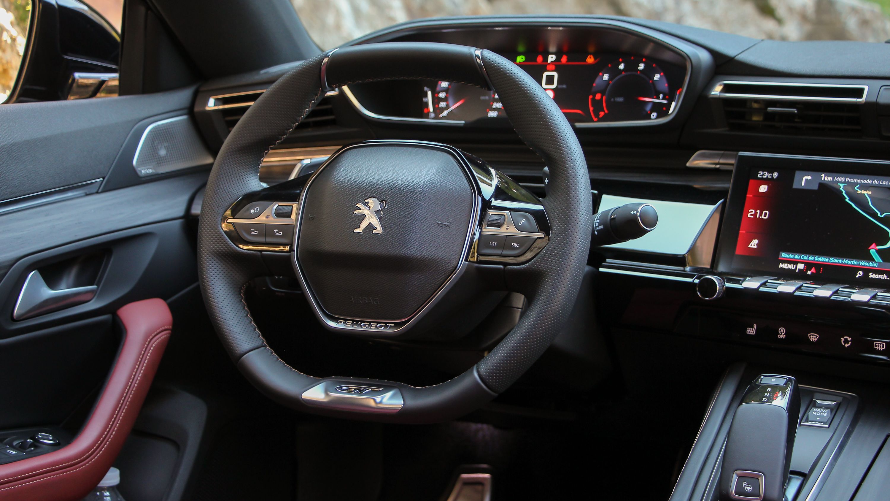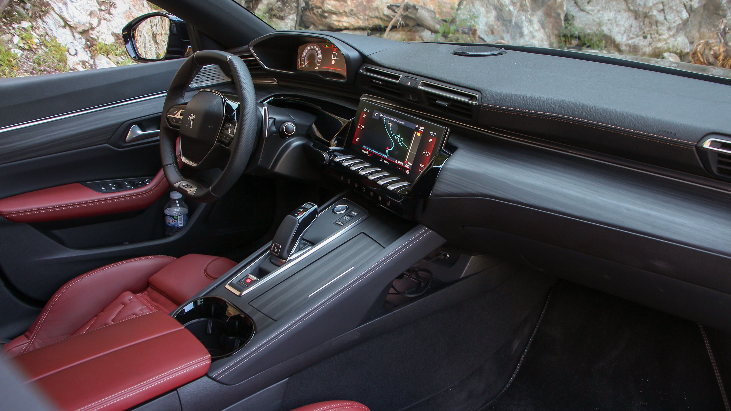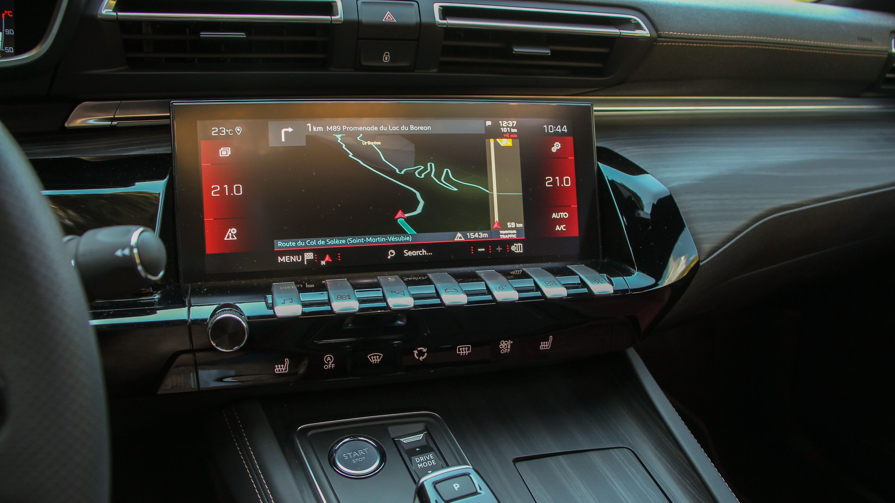 Az ötödik utas kivételével mindenki kényelmes üléseket kap, az elsők akár AGR tanúsítványosak és masszázsfunkciósak, szabályozható deréktámaszúak és laphosszúságúak. Nem csak jó, egyenesen kényeztető bennük hosszú távon ülni. Nagy plusz pont, hogy a kárpitválaszték (akár mogyoróbarna vagy bordó bőrrel, alcantarával) prémiumgyártókat idéző, ami nem is véletlen. A Peugeot a tömeggyártók között a csúcsra kíván törni, angolul high-end generalist brand-ként aposztrofálják magukat. Passzol ehhez a magasra emelt műszerblokkos és alul-felül csapott kormányos i-Cockpit, aminél a sofőr előtti 12,3 colos, HD minőségű kijelző 6 különböző megjelenítést kínál, valamint a márkánál és a kategóriában először éjjellátó rendszer képét is megjelenítheti. A 3008 és 5008 modellektől ismerős a középkonzol 8, vagy az Allure szinttől már 10 colos kapacitív érintőkijelzője, ami hét darab billentyűs gombbal közvetlen elérést ad egyebek mellett az audiorendszerhez, a klímához, a navigációhoz és a telefonhoz is, amit a sima Bluetooth-kapcsolaton túl Apple CarPlay és Android Auto alkalmazásokkal is csatlakoztathatunk.