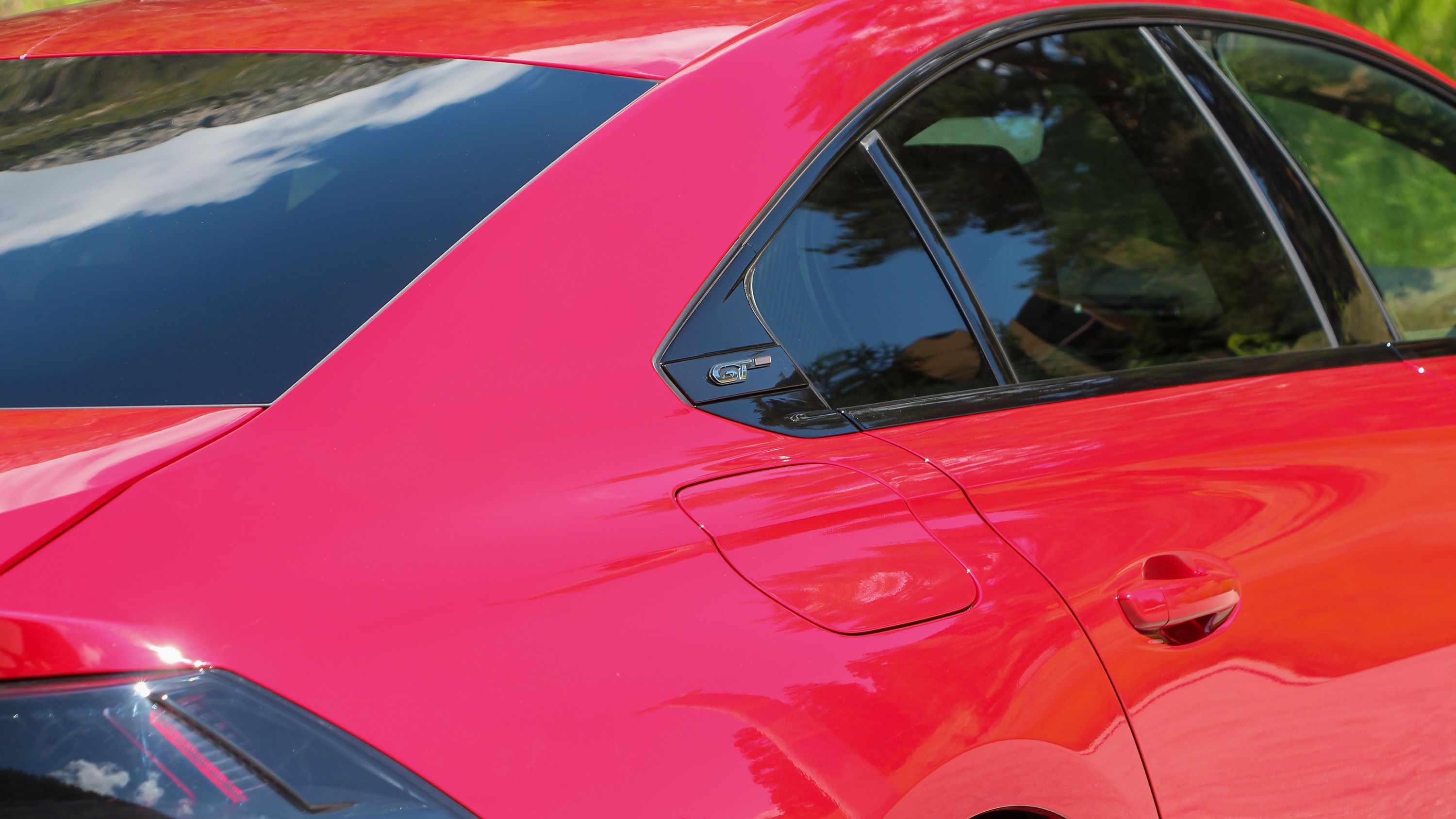 Az ennyire szűkre húzott lámpák alatt megmaradó nagy húsos rész (főleg pirosban) nem annyira szép, nem tetszik ahogy domborodik a műanyag, sötétebb színben sem sikerül ezt eltüntetni teljesen. A pirosnál ráadásul pont ezen a területen található a parkradar-szenzor is, még inkább szembetűnő.
