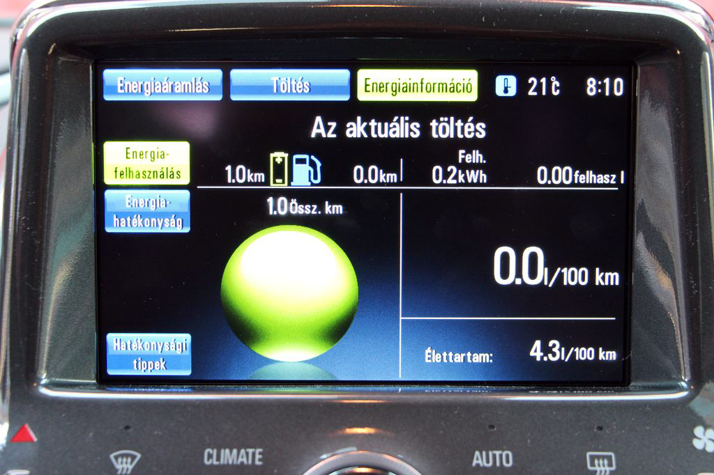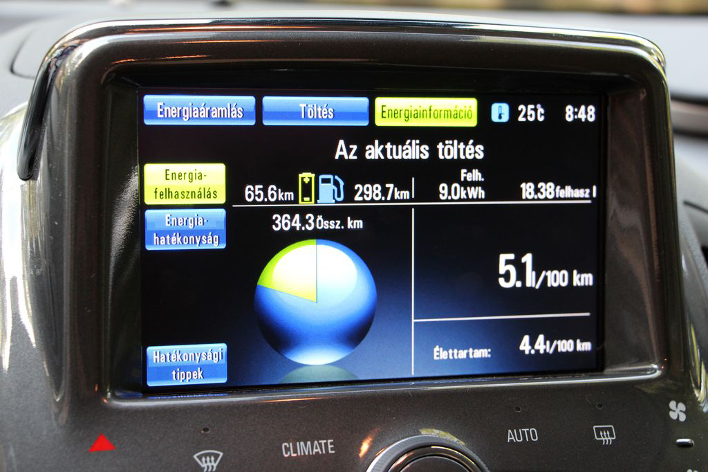 A bonyolult rendszerből a sofőrnek nem sokat kell tudnia, de annyit igen, hogy autópályán könnyedén az akku fenekére lehet tapsolni, így ha utunk városon is keresztül fog vinni, érdemes oda tartalékolni a konnektorból betöltött áramot, a sok elindulással járó városi araszolásban ugyanis a villanyüzem a sokkalta takarékosabb. Az átlagosnál több autózást hozó teszthét első napján 74,5 városi, elektromosan megtett kilométer után ugyanis döbbenetes fogyasztási értéket kaptunk, további 10 kilométerre csaknem 1 liter benzint égetett el az Ampera. A természetesen stop-start funkciós, csak hajtáskor járó benzinmotor egyébiránt csendes, városban a hangja csak nagyobb gázt adva erősödik hallhatóvá, s autópályán is visszafogottan duruzsol. Logikus, hogy a hosszú „áramtermelés” gazdaságosabb, mint az időszakosan megállított, újraindított, autópályás üzemben így a városinál sokkalta kedvezőbb, 100 kilométerenként 6,5 literes, áramtermelési költséget kaptunk. Ha azt vesszük, hogy egy gazdagon felszerelt, 1,6 tonnánál nehezebb, kényelmes utazóautó ilyen étvággyal 35 literes üzemanyagtartályával csaknem 540kilométert meg tud tenni két tankolás között, már boldogak lehetünk. Két tankolás között azonban temérdek idő és kilométer múlhat el, ugyanis a 16 Amperes töltéssel akár mindössze 3, de legrosszabb esetben is csupán 10 órás akkutáplálással azonban temérdekszer 40-80 kilométer nyerhető.
