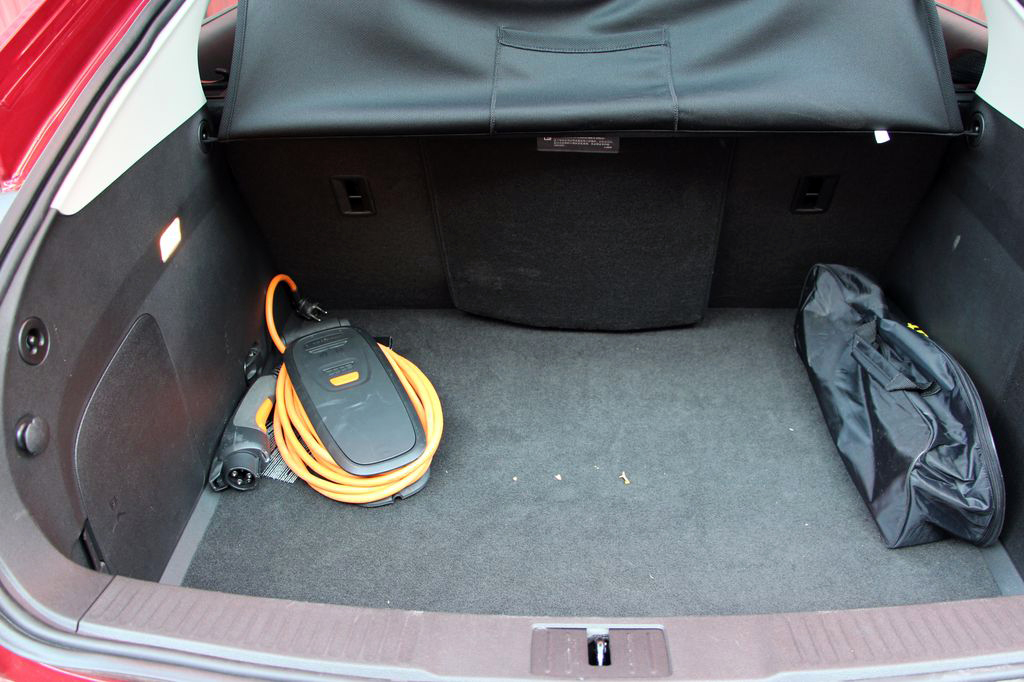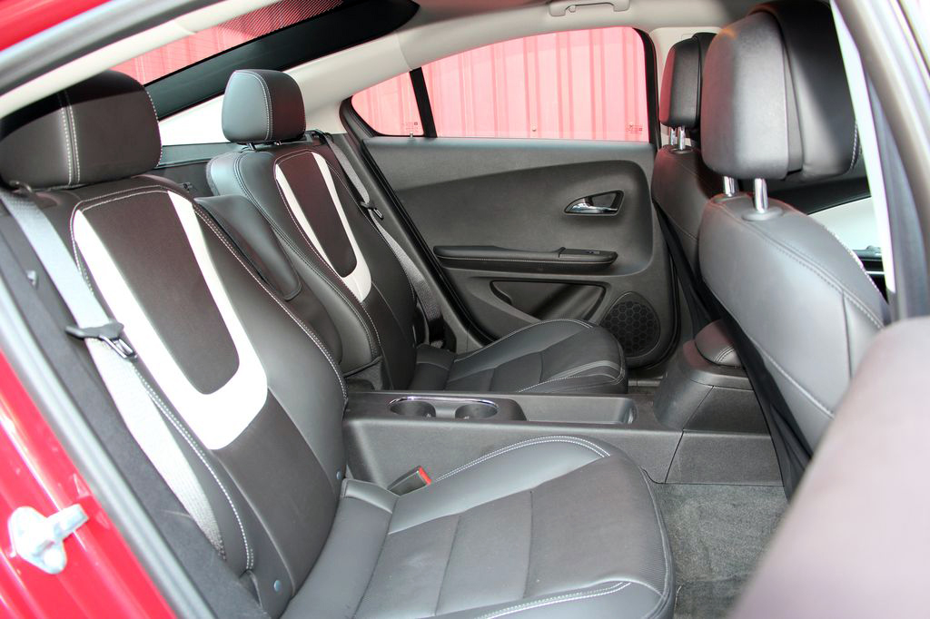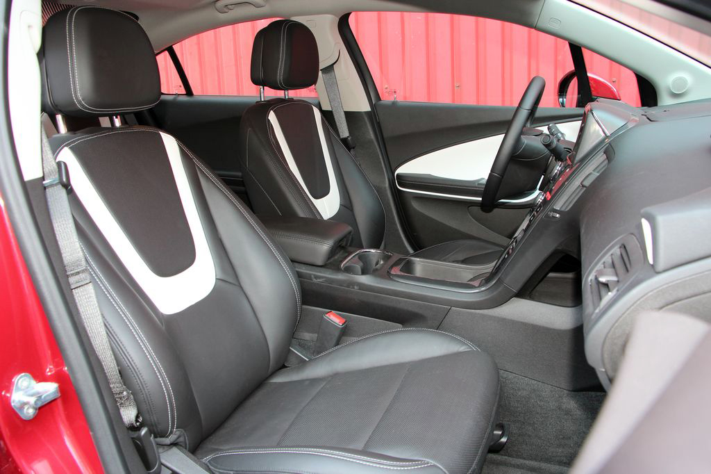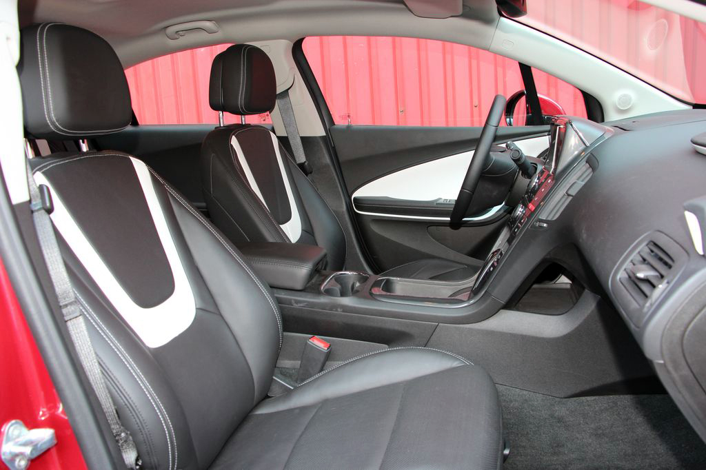 Utasterébe a fentiekből következően mélyre kell ülni, ott azonban az ülés - magassága is - tág határok között állítható. Mivel a 16 kWh-s, T-alakú lítium-ion akkumulátor a karosszéria egészén végigfut a képzeletbeli kardán-alagútban, s a hátsó ülések alatt alkotja a betű vízszintes gerendáját, az ülések elöl-hátul jelentősen szeparáltak, s logikusan hátul is csak kettő van. Azok viszont az elsőkhöz hasonlóan kényelmesek, átlagtermetű felnőttből négy gond nélkül fér el az Amperában. Gyerekből pedig akár hármat is gond nélkül beültethet a sofőr, elöl kikapcsolható az utaslégzsák, hogy babahordozó – menetiránynak háttal – az utasülésre kerülhessen, hátul van Isofix-csatlakozó, illetve a biztonsági öves rögzítés sem gond, ilyen hosszú hevederekkel egyetlen autóban sem találkoztunk még. Talán az amerikaiakra méretezték, s vélhetően az egész utasteret is az ő ízlésük szerint alakították ki. Így kerülhetett például bőrülés a spórolásról és a környezetbarátságról szóló autóba. Pohártartó középen, palackrekesz az ajtókon minden utasnak jár.
