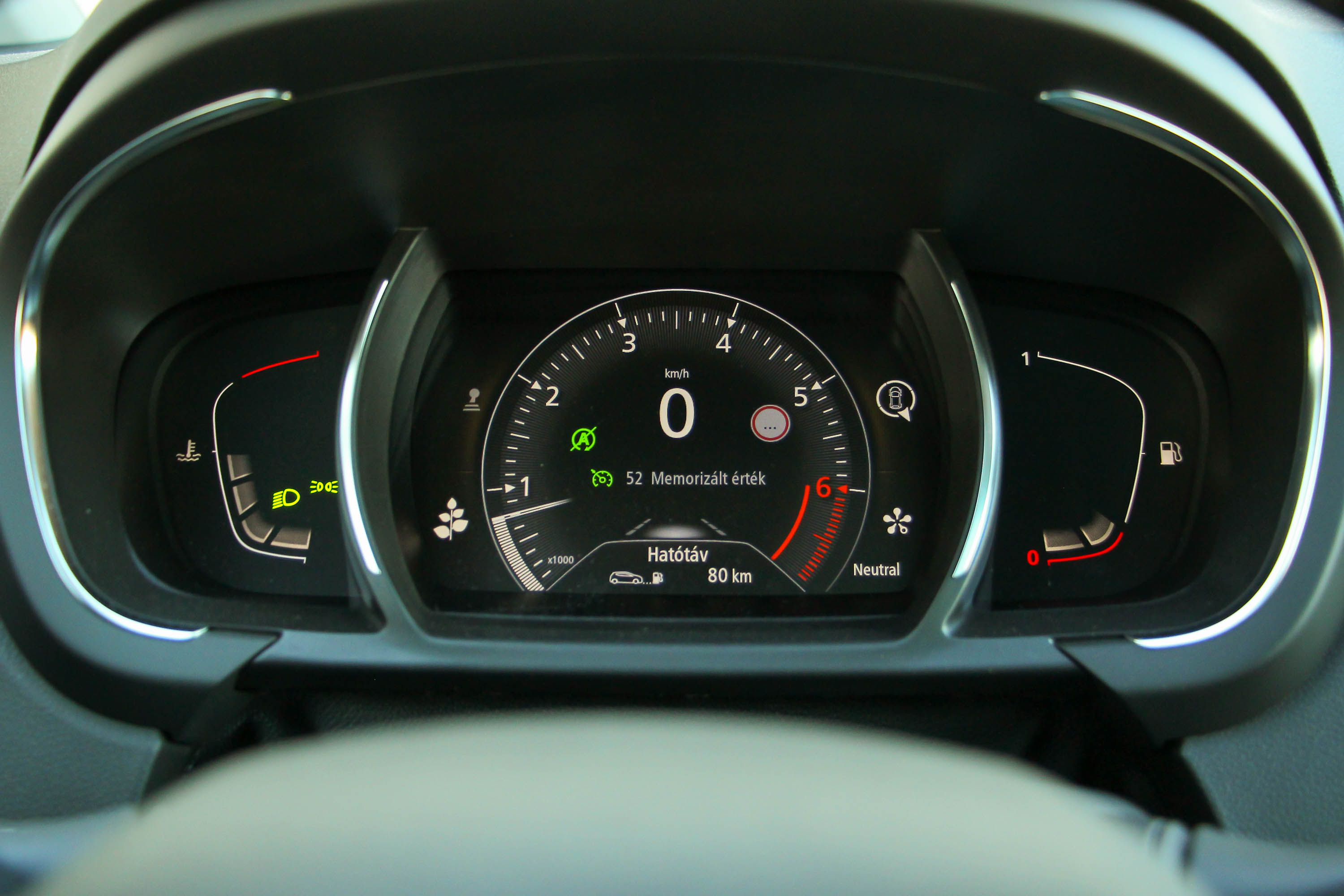 Okosodott. Naná, hogy húzós a tesztautó ára, hiszen van benne kanyarkövető LED fényszóró. Erősen világít, automata relfektorkapcsolgatásával jelentősen könnyíti az éjszaki országúti vezetést, egyetlen hibája, hogy vetített képe egy kissé élesen ér véget, ennek ellenére azt mondom: megéri az Intens szinten 300 ezer forintos felárát, pláne, hogy a head-up displayjel együtt adják. Utóbbin az itt már alapáras navigáció parancsai is megjelenhetnek, az persze az óriási, némi felárért akár 8,7, amúgy 7 colos középkonzoli kijelzőn is követhető. Alapvetően jól dolgozik, de azért nagyobb városokban, például Szegeden is bevitt volna néhány behajtani tilos táblán, így mellette azért ajánlott a Waze futtatása okostelefonról, amihez összesen 4 darab USB-töltőcsatlakozót találunk a fedélzeten. Szerepelhet holttérfigyelő, táblafelismerő, sávelhagyásra figyelmeztetés, az 1.2 TCe motor kivételével távolságtartós tempomat is, ide csak követési távolságra és ráfutásveszélyre figyelmeztetés jutott. Utóbbi is hasznos, ahogyan a precízen dolgozó, párhuzamos, merőleges és halszálka-parkolásra is képes asszisztens is.