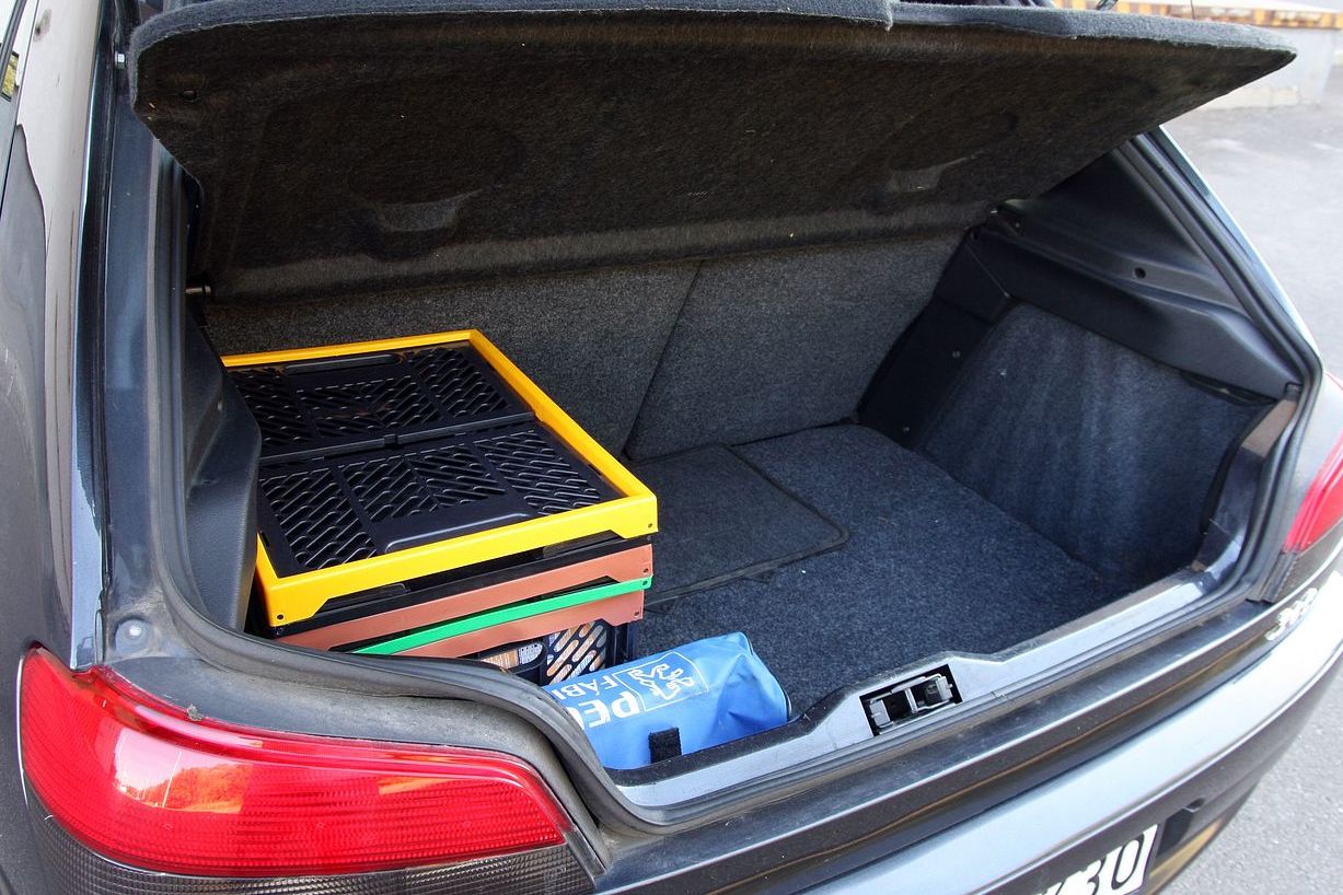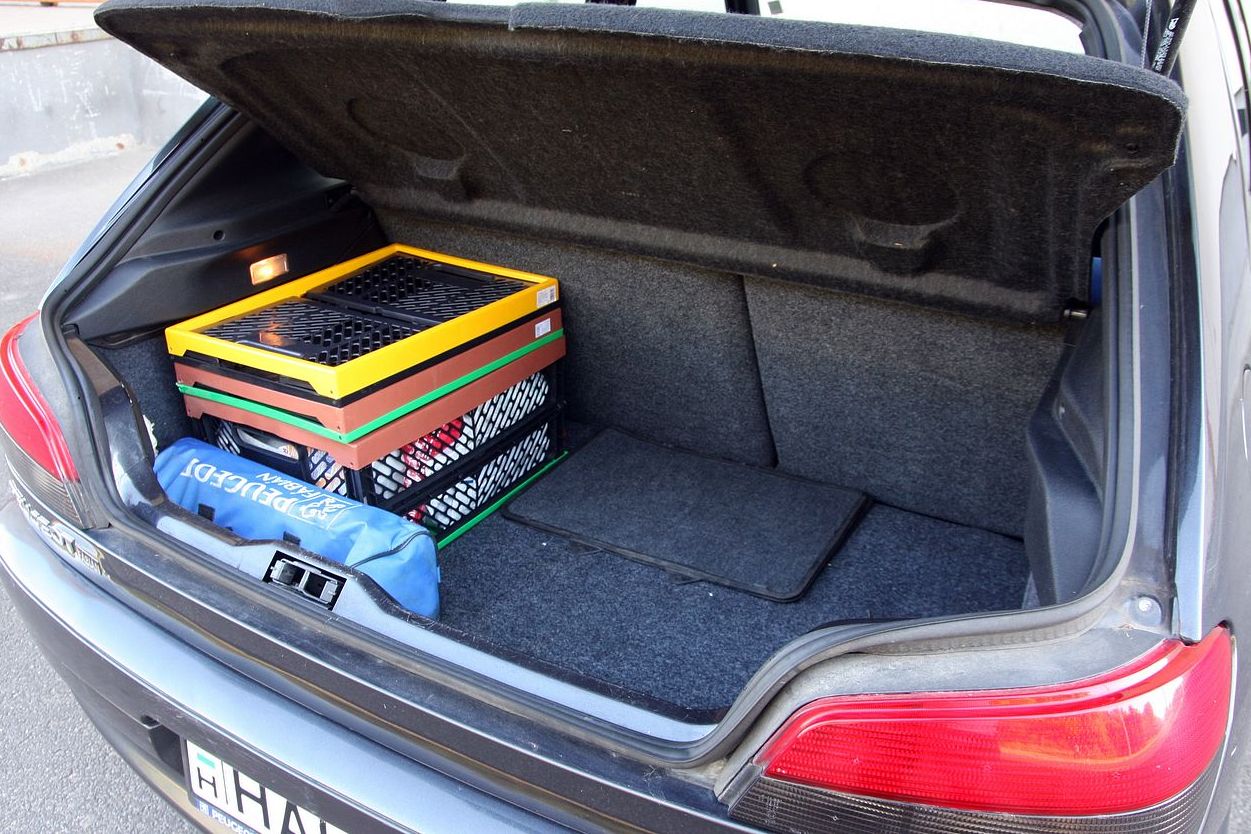 A hétköznapi életben nem vizsgázik rosszul az autó. Az ajtózsebek nem túl nagyok, de pici erőszakkal befogadják a félliteres palackot is, a középkonzolban van egy apró mélyedés alul, a váltókar mögött, és mivel nincs utas oldali légzsák, ennek helyén filccel bélelt, fedéllel zárható tárolót alakítottak ki a kesztyűtartó felett. Az első ülések háttámláján gumírozott zsebbe lehet pakolni, és nagyon könnyen variálható a csomagtartó – az ülőlap kis textilfüllel hajtható fel, a fejtámla kivétele könnyed mozdulat, és már dőlhet is a támla. Maga az utastér négy felnőttnek egészen kényelmes, hátul három személlyel viszont csak rövidtávon vállalható. A kék színű kárpitozás a Husky jellegzetessége, az ülések franciásan, puhán tömöttek, de az elsők formázása nem igazán szerencsés, a támlák nem elég magasak, és oldaltartásról legfeljebb álmodni lehet. A kormány magasságában állítható, és ez sokat segít a kényelmes vezető pozíció megtalálásában. A külső tükrök képe nagyon kicsi, ez a mai, osztott látóterű visszapillantókhoz képest megszokást igényel. Bár a legtöbb nemzetközi használtautós forrás úgy ír 306-os belsejéről, hogy rosszak az anyagok, és kifogásolható az összeszerelés, ebben a 100 ezret futott példányban nincsenek nagy galibák. Rossz minőségű úton sem rezonál kellemetlenül a bútorzat, nem kotyog, lötyög, vagy zörög semmi sem zavaró mértékben, minden elem a helyén van.