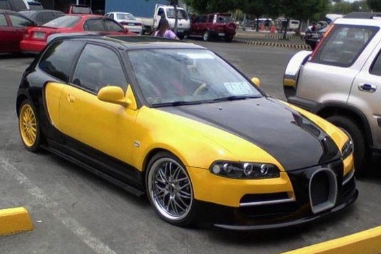Hogy a képen látható Honda Civic eladó lenne-e, arról nincs hír, csupán a világhálóra került fel ez a fotó. Az ötödik generációs, 1992-95 közötti modell kétszínű, sárga-fekete fényezése még nem is lenne olyan feltűnő, de szemből nézve már egyértelmű, hogy miért így került dukkózásra a háromajtós karosszéria. A frontrész a Bugatti Veyronra hajaz! Őszintén szólva, az új fényszórókkal és a patkó alakú hűtőmaszkkal nem is olyan giccses a Civic, mint azt az ember látatlanul gondolná, de azért ismerve az eredeti konstrukciót, kissé gnóm szülemény a "Honda Veyron". Ja, és valószínűleg nem képes elérni a 408 km/órás végsebességet sem.