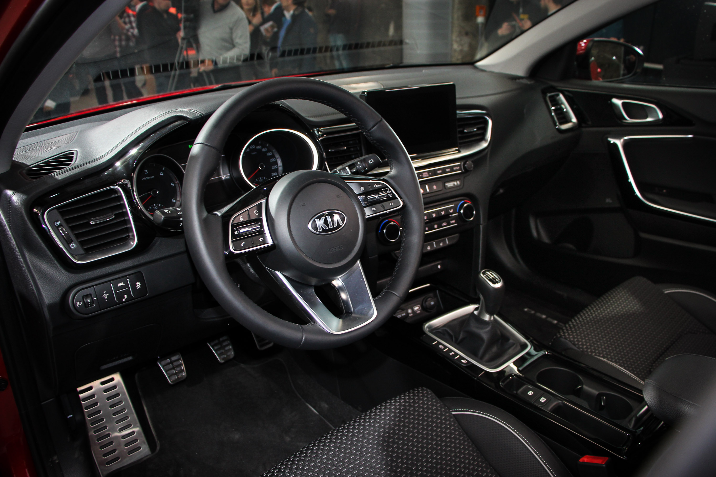 Újfajta bőrt használnak, valójában ugyanaz, mint amit az Optimában már láttunk, valamint van műbőr is a kínálatban, ez elég műanyag hatású, de a középső szövet betéttel teljesen vállalható. A szövet elég szép, bár a bőrülésekhez előre kérhető szellőztetés is, hátra viszont fűtés a szövetben is lehet. Az alacsonyabb tető miatt lejjebb került az ülés, a műszerfal csöppet följebb, így az üléspozíció nagyautókat idéző, mindenesetre sportosabb, mint volt, a kilátás változását majd a júniusi közúti teszteken fogjuk szemügyre venni. Rengeteg a kapcsoló – már a rendesen felszerelt kivitelekben – amik mindegyike ismerős lehet vagy a Kia, vagy a Hyundai modelljeiből. A magasabb felszereltségnél elérhető 5, vagy 7 colos multimédiás rendszer kijelzője elég hangsúlyosan trónol a pult tetején, navigácóval ez már 8 colos. Tabletes a megoldás, viszont a márkához hűen nem fényes, hanem matt, a rajta futó rendszert viszont még nem próbálhattuk a müncheni bemutatón. Ha nem költünk sokat Ceedre, akkor sem járunk rosszul, hiszen minden esetben alapfelszereltség a Bluetooth kapcsolatos rádió, a szürkületérzékelős fényszórókapcsolás és a másoknál kényelmi extrának számító kulcs nélküli nyitás-indítás.Szerencsére a kijelző matt, használatáról csak később tudunk beszámolni. Az üléspozíció alacsonyabb, a műszerfal magasabb, nagyautósabb és sportosabb az összhatás