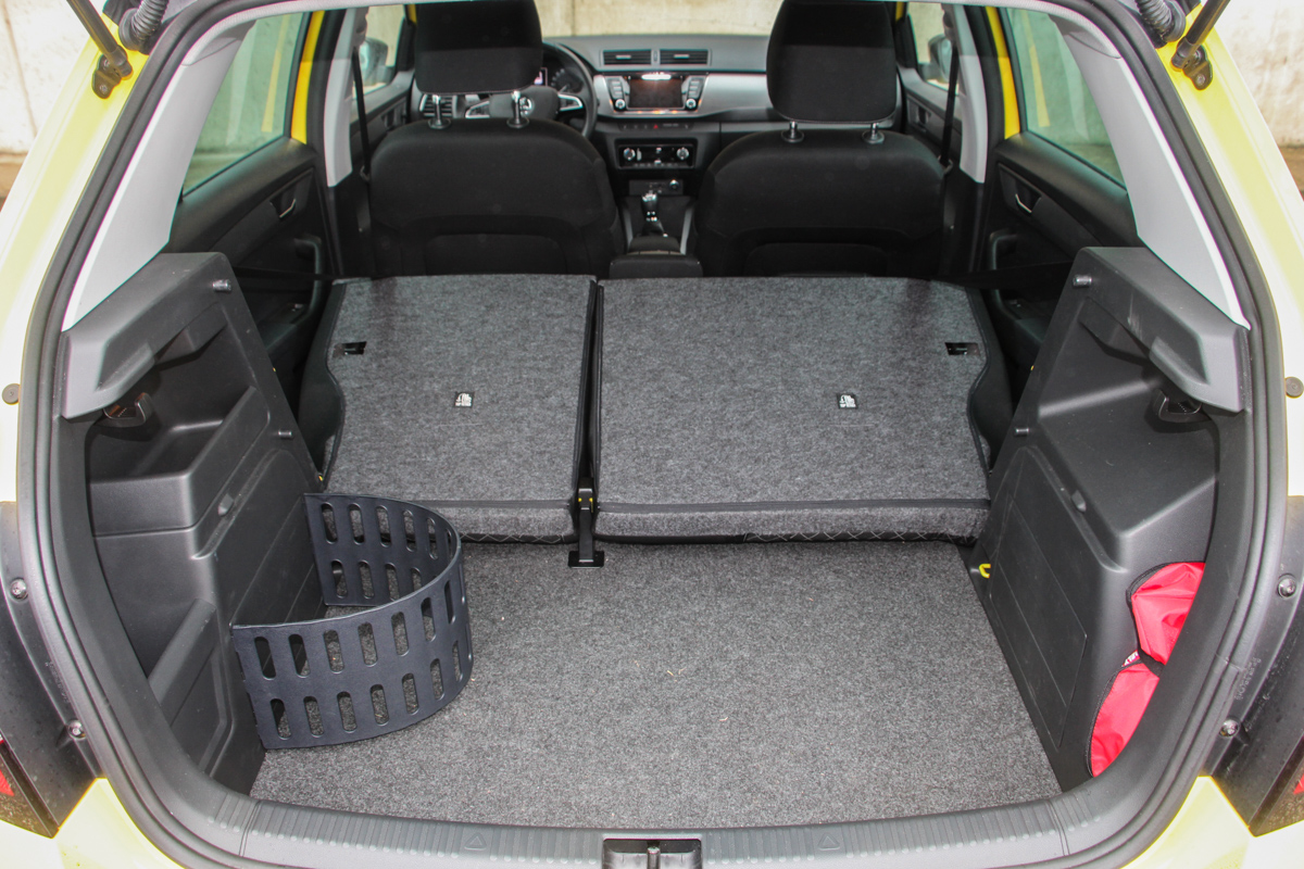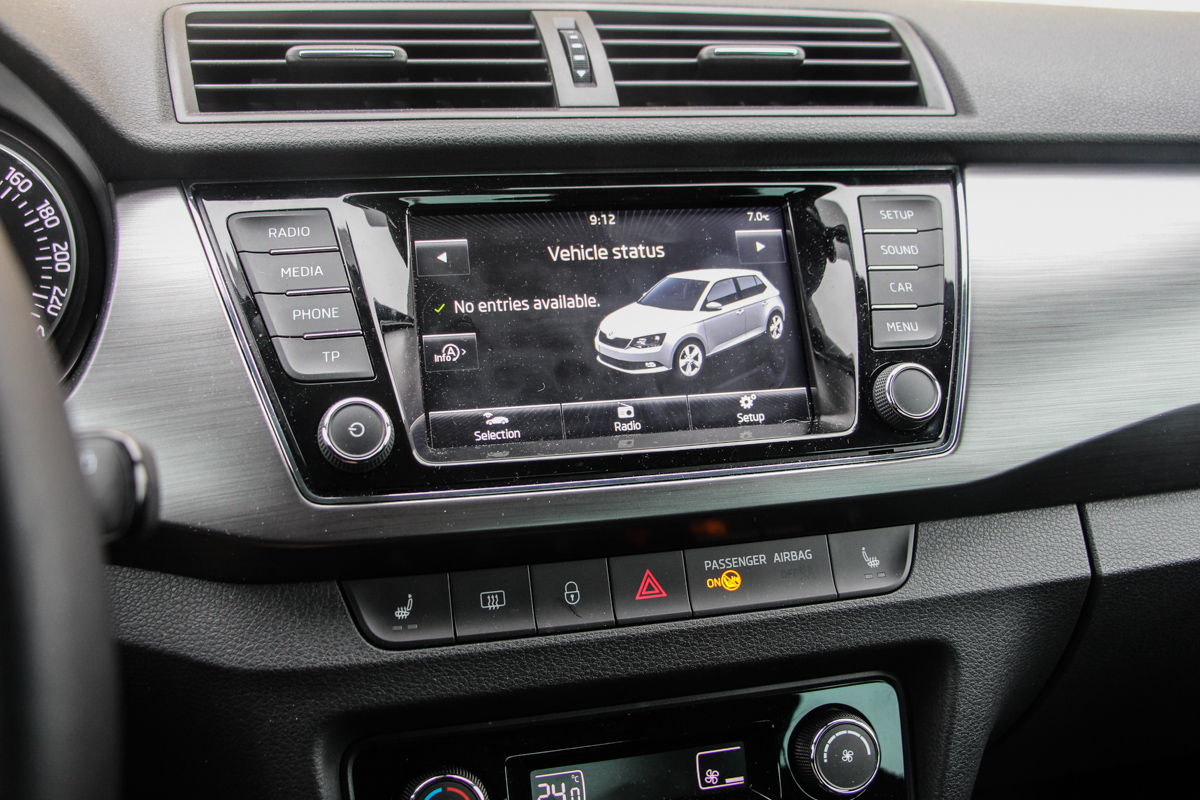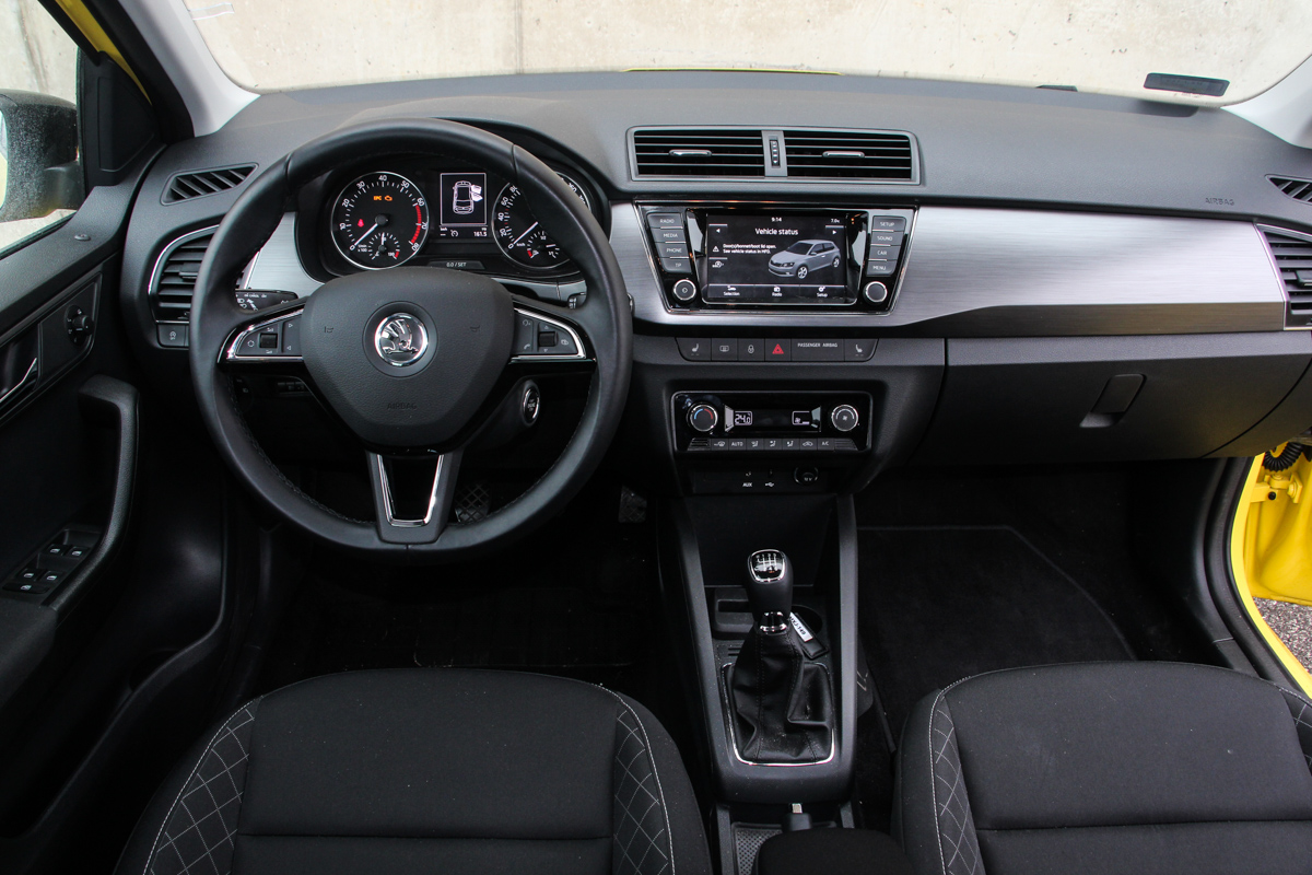 Praktikus. Ahhoz képest, hogy a Fabia kisautó, rengeteg tárolóhelyet találunk benne. Elöl hátul az ajtózsebek átlag feletti mérettel rendelkeznek, elöl akár egy 1,5 literes palack is elfér. A középkonzol alatt szintén van egy nagyobb rekesz és két pohártartó. Ezek közül az egyikben kivehető telefontartó van, amelybe állítva lehet elhelyezni a készüléket, anélkül, hogy az önálló életre kelne lassításkor és kanyarodáskor. A felnyitható, állítható első könyöklő szintén szolgálhat tárolásra. A magasabb kategóriákban ismert MirrorLink támogatást a Fabia is megkapta, mellyel az Andorid/iOS alapú okostelefonok képernyőjét teljes egészében klónozhatjuk a központi 7 colos kijelzőre. Ez egy rendkívül jó extra, hiszen amellett, hogy a telefonunk az USB kapcsolat révén töltődik, a kedvenc navigációnkat használhatjuk vagy utasként akár Facebookozhatunk, internetezhetünk is.