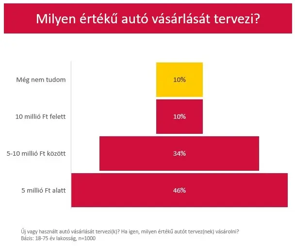 Idehaza tízből hárman terveznek autóvásárlást, többségük 3 éven belül. A vételt fontolgatók közel kétharmada használt gépjárműben gondolkodik, felük 5 éves vagy fiatalabb típust szerezne be. Egyötödük nyitott arra, hogy elektromos autóra váltson. Az autóvásárlást tervezők közel fele (46%) 5 millió forintnál olcsóbb kocsit venne, minden harmadik (34%) 5-10 milliós autót nézne ki magának, tizedük pedig a 10 millió forint feletti példányokból válogatna. A magyarok mindössze töredéke (16%) merne online vásárolni autót, míg a megkérdezettek közel harmada használna mesterséges intelligenciát a következő gépkocsi kiválasztásakor. Autóvásárlásnál a magyarok számára a legfontosabb az ár, a megbízhatóság, a fogyasztási és a fenntartási költségek. Csak ezután következnek olyan szempontok, mint a méret és praktikum, a biztonság, kényelem és felszereltség, a márka, a dizájn vagy a környezetbarát működés.