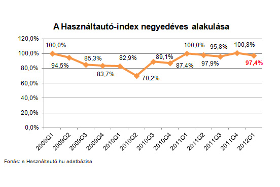 Negyedévente adja ki a kínálatával a piac több mint 80 százalékát lefedő Használtautó.hu a Használtautó-indexet, mellyel az elmúlt időszak kínálatát és teljesítményét jellemzi. Az index egy arányszám, amely az adott időszakban elkelt használtautók aktuális összértékét viszonyítja a válság kezdetekor, 2009 első negyedévében mért szinthez. Mindenkori 100 százalék körüli, de inkább alatti állapota azt jelzi, hogy a használtautó-piac lendülete egyelőre nem tudta érdemben meghaladni a bázisnak tekintett időszak teljesítményét. Ez a szám először a tavalyi negyedik negyedévben tudott pozitív változást, 100 százalék feletti értéket mutatni, ám az idei első negyedévben - annak ellenére, hogy hajszálnyit emelkedett az újautó-eladások száma, és jelentősen nőtt a külföldről behozott autók száma - ismét csökkenést mutatva 97,4 százalékos lett, s a kínálati átlagár is apadt hajszálnyit, aktuális értéke 1,591 millió forint. [BANNER type="1"]