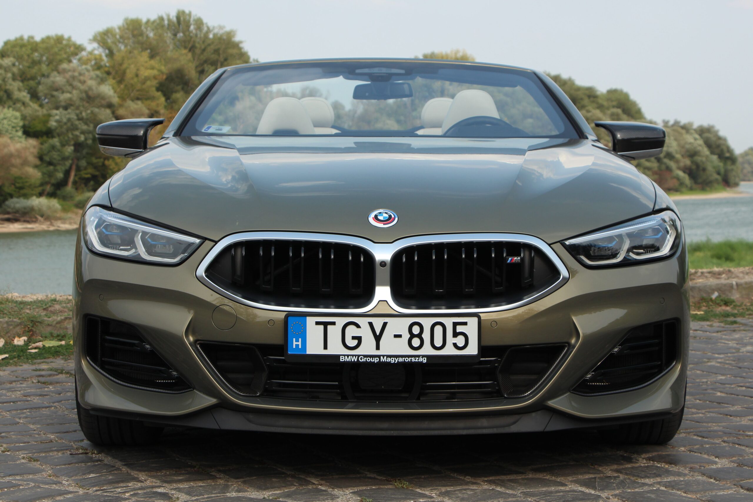 Az igazán különleges zöld fényezés a fehér (elefántcsont) bőr belsővel magával ragadó látvány. Ja, és persze az üveg díszbetétek tovább fokozzák mindezt. Természetesen ennek szépen meg is kérik az árát. A fehér bőrkárpit 1,2 millió forintos extra, az üveg díszítőelemek 253 ezer forintba kerülnek, míg a szénszálas díszbetétek kicsit olcsóbbak, hiszen csak 168 ezer forintot kérnek értük. Az ülések persze fűthetőek, de a hűthetőségért már 287 ezer forintot kell fizetni, míg a Bowers & Wilkins hifiért 1,3 millió forintot. Egy kicsit a külsőre is kanyarodjunk vissza, ha már így belelendültem a hedonizmus taglalásába, mert a tesztautón külső karbon díszek is láthatók, ami 1,4 millió forintos tétel. Viszont van egy különleges részlet, amiért nem kell fizetni, ez pedig az egyedi embléma, ami az M-részleg 50 éves jubileuma előtt tiszteleg.