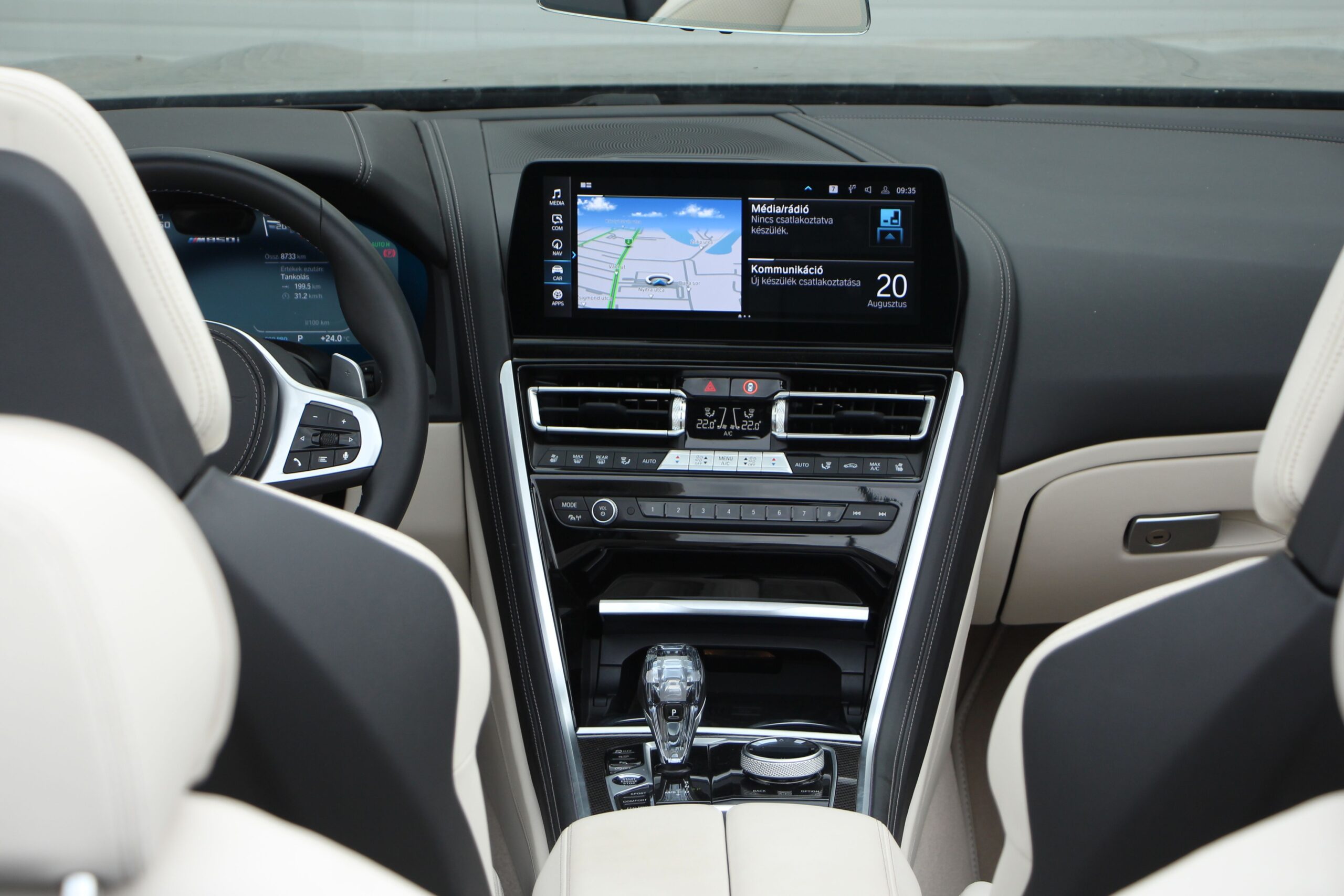 De vissza az utastérbe. Egyszerűen nem lehet betelni vele. Nézzétek csak meg közelről a kormánykerék bőrburkolatát! Az M-divízió színeivel varrták. Egyszerűen imádni valóak ezek a részletek, amik megmutatják a BMW igényességét és ötletességét. Ez az autó az értő közönség számára készült. De, ha valakit hidegen hagynak ezek az apróságok, még ő is örülni fog a nyakfűtős üléseknek (219 ezer forintért), vagy épp az iDrive multimédiás rendszer 7. generációjának, amit a 12,3 colos érintőképernyőt nyomkodva, vagy épp a továbbra is zseniális megoldásnak számító tekerőgombbal lehet vezérelni.