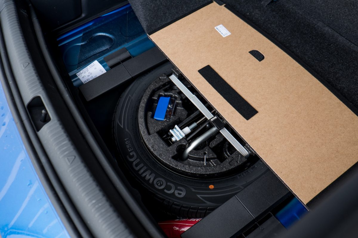 Nagyra nyílik a 415 literes csomagtér fedele, ezzel kell lehúzni. A padló alatt teljes értékű pótkereket is kaphatunk, vannak akasztók és kis oldalsó rekeszek is