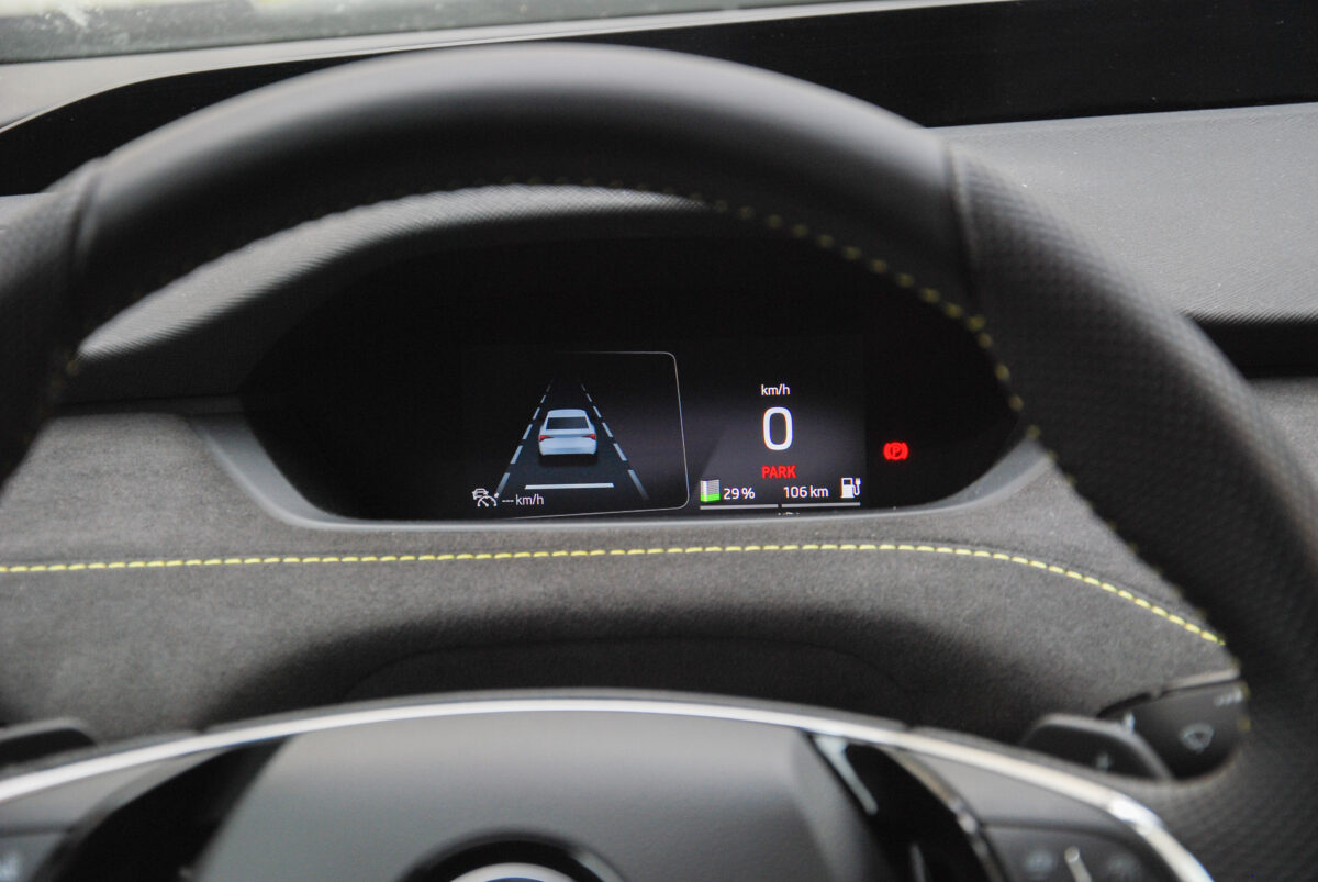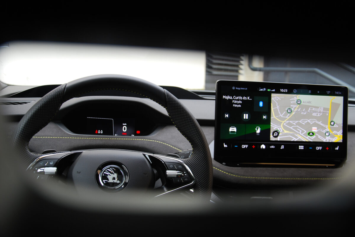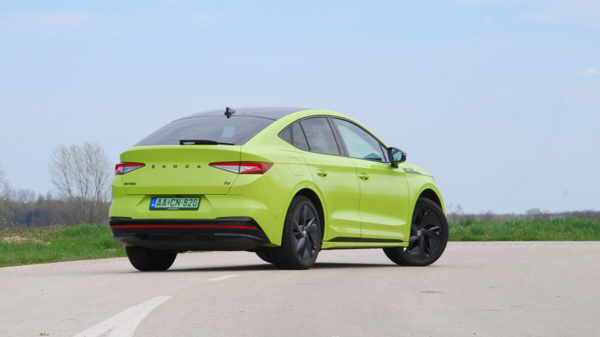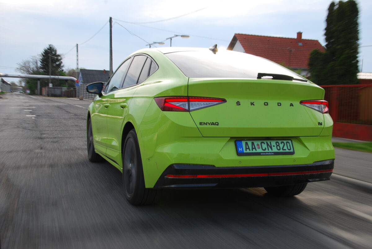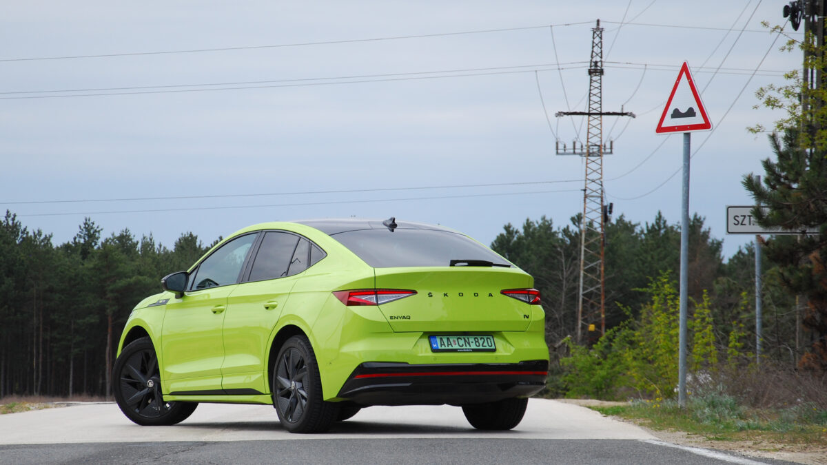Persze, felmerül a kérdés: miért is lenne könnyű egy ekkora monstrum egy 82 kilowattórás akkucsomaggal? Legalábbis logikus alapon ez lenne a kérdés, ám vezetve inkább az, hogy miért lenne nehéz valami, ami ennyire könnyűnek és agilisnek érződik. Merthogy az Enyaq Coupé RS igenis jól mozog, és nagyon jól leplezi a tömegét. Feszes a futóműve, illetve villanyautóhoz képest annyira még nem is túlszervózott a kormánya, és akkor még erre jön rá a játékos hátsó rész is, ami kis gyakorlással még könnyebben teszi irányba az autót a szűkös kanyarokban.