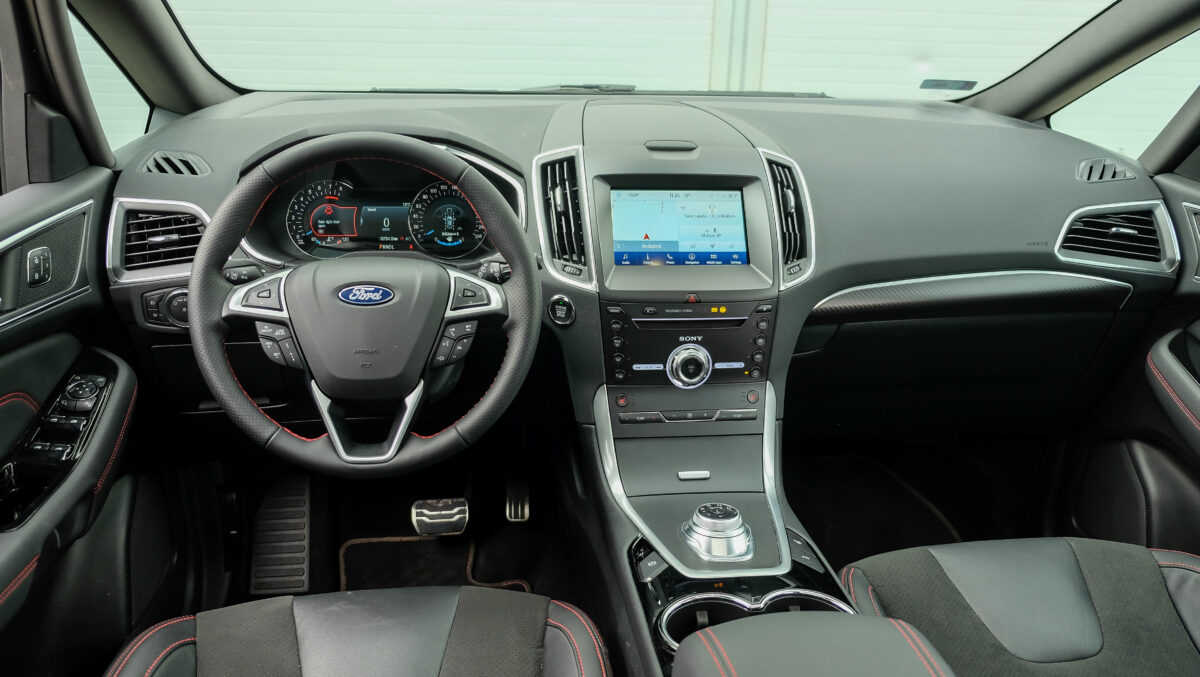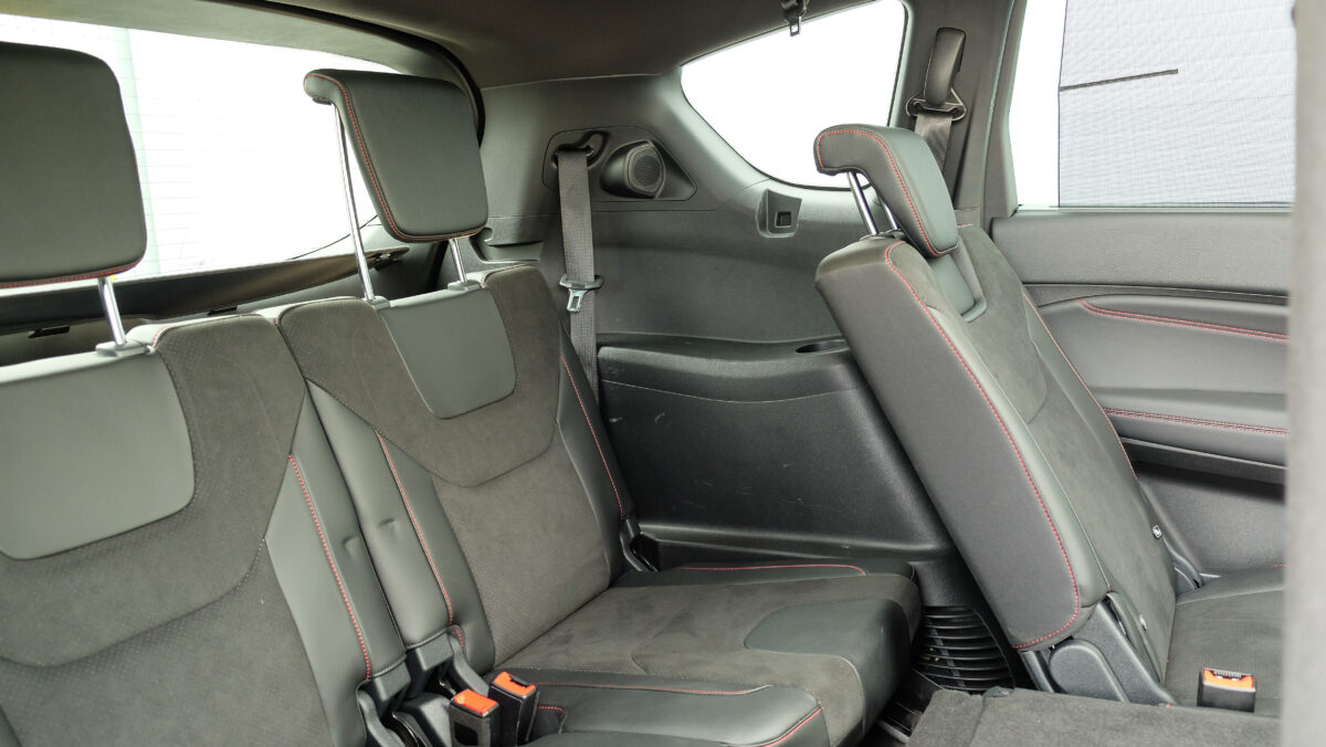 A műszerblokk részint digitális, de dizájnjával nagyjából 10 évvel ezelőtti. A kormánykerék szintén a 3-as Focust idéző, ami egyébként nem baj, teljesen logikus, kapcsolói odapillantás nélkül érezhetőek, ugyanez elmondható a klímapanelről is, ami a régi-vágásúan süllyesztett középső kijelzőn keresztül kommunikál. Utóbbi felett is találunk egy tárolót, az első ülések közötti könyöklőben kettőt is, az ST-Line verzió továbbá piros cérnás varrásokkal teszi izgalmassá az amúgy funkcionális belteret. Elöl-hátul kényelmesek az ülések, a második sor független székei is egyenként változtatható támladőlésűek, mindhárom isofixes, lábtér is van annyi, hogy egyáltalán nem büntetés középre ülni. A harmadik sor padlóba fektetett ülései leginkább gyerekeknek elegendő méretűek, de rövidebb távokra felnőttek is beültethetők, a második sor gigászi lábteréből lehet adni oda is, ráadásul akkor is van egy kisautónyi, 285 literes csomagterünk, ha hétülésesként használjuk az S-MAX-ot. Öt ülés mögött 700 litert tölthetünk meg, az ülések ráadásul hátulról gombnyomással fektethetők síkba, magyarán egyszerűbb és praktikusabb nem is lehetne a bővítés, ami után 2020 literes, 2 méter hosszú rakteret kapunk.