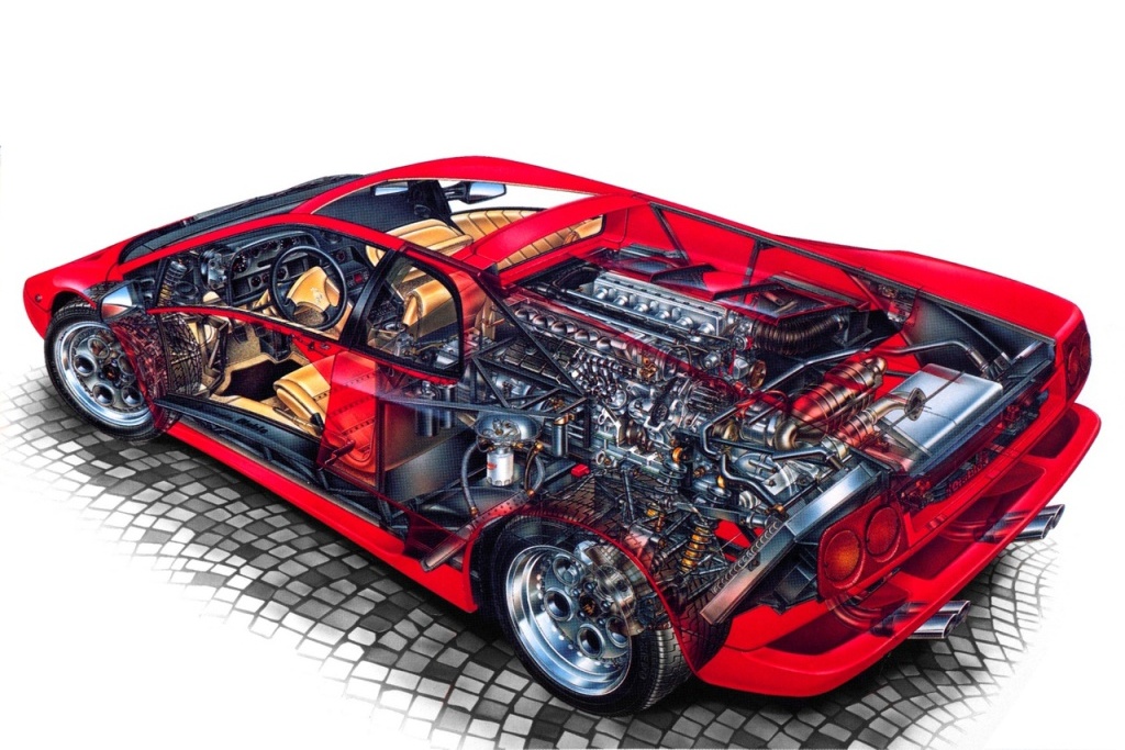 A Diablo minden porcikáját úgy tervezték, hogy igazi szupersportkocsi legyen. Ilyen a motor is, amire a 12 henger gyújtási sorrendjét is ráírták. Itt nem vicc a felirat, hogy "Vigyázat, forró!"