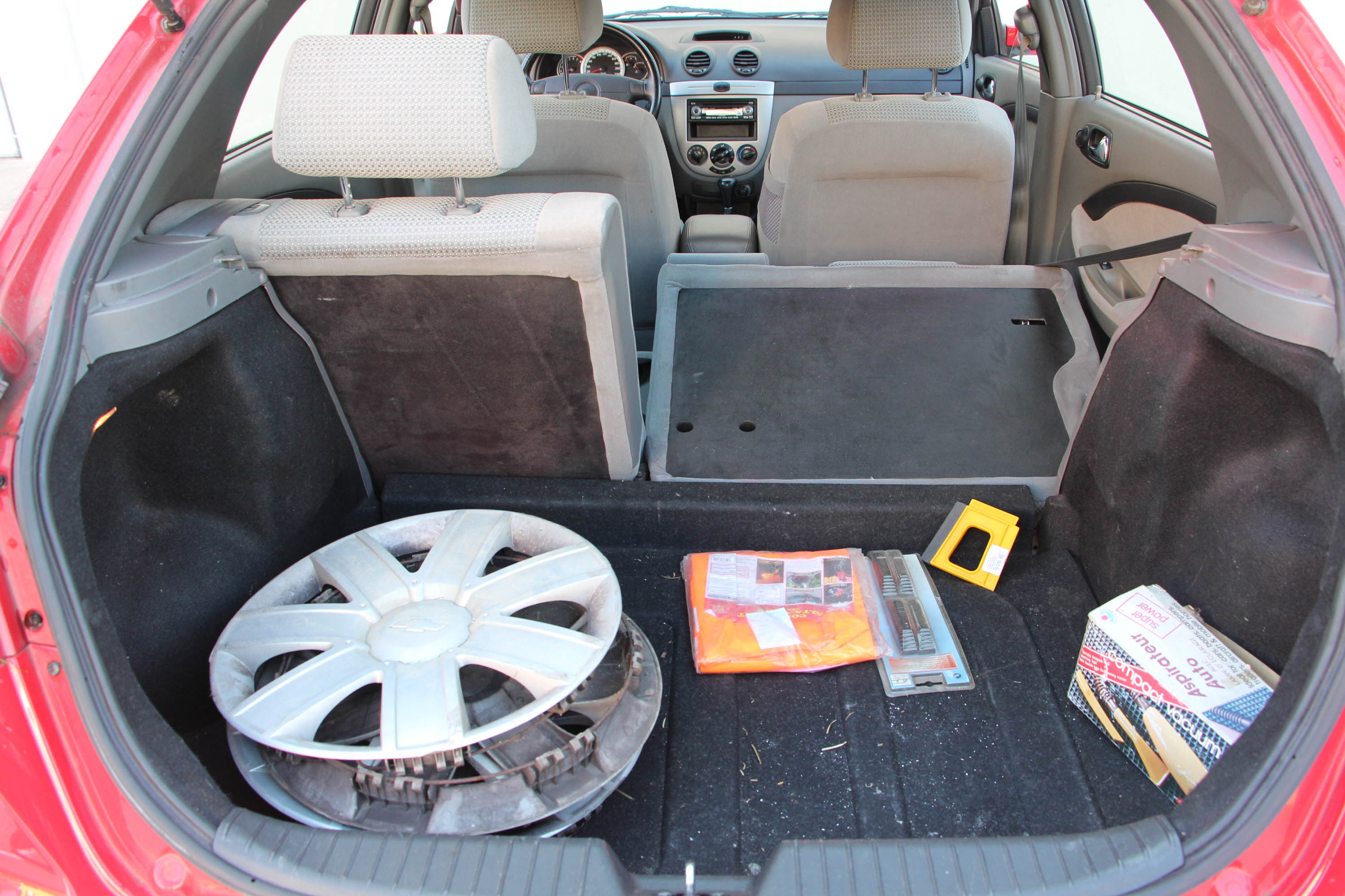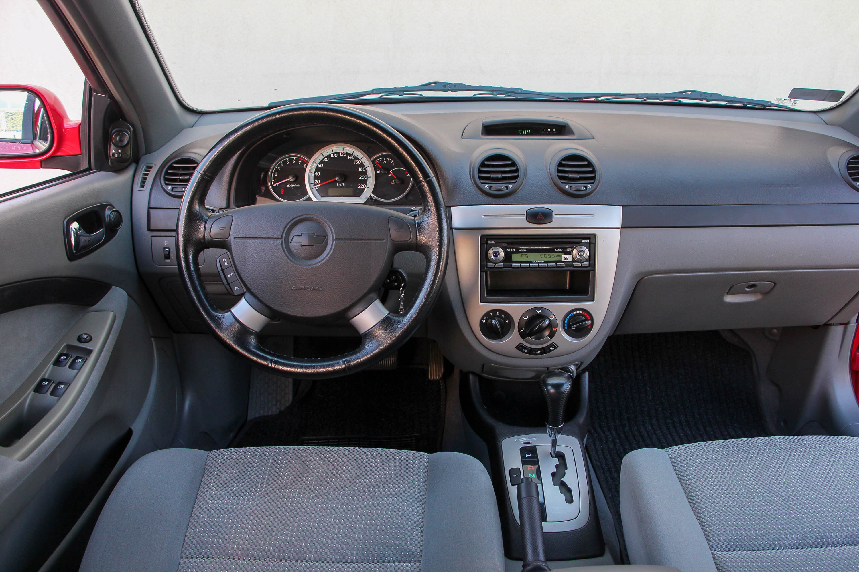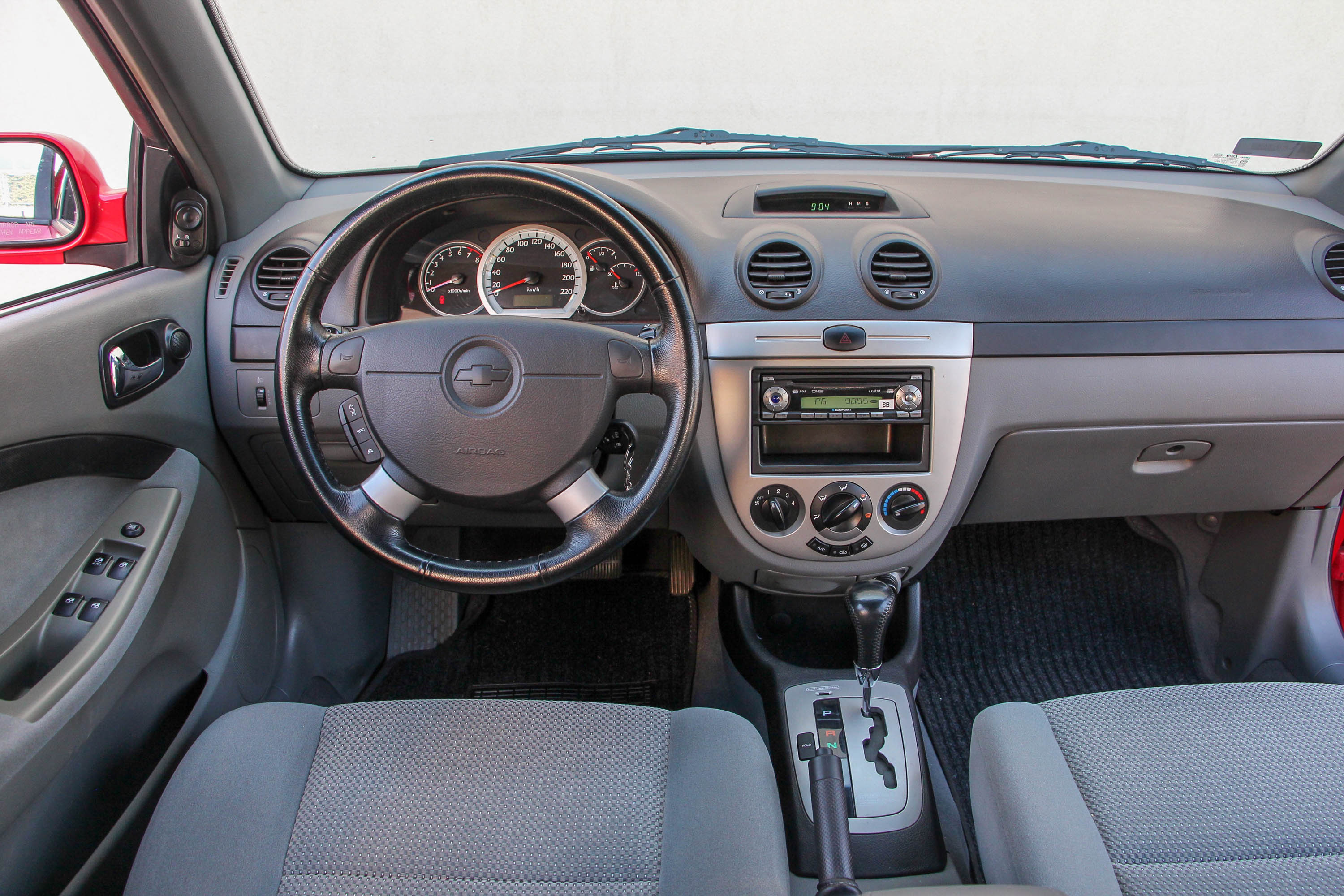 Hiába van persze mutatós alufelni a nyári gumiabroncsokban, ez a Lacetti nem egy villantós autó, sokkal inkább "belső értékei" adhatják el. Még akkor is, ha kor- és koreai autó-jellemzőként az összes utastéri plasztik kemény. A műszerfalon többféle világosabb árnyalatot is találunk, a középkonzol matt ezüstje egészen gusztusos, a kormánykerék és a váltógomb pedig még bőrbe is van burkolva. Olcsó autósan nem a legjobb minőségűbe, hiszen már a 70 ezer kilométert futott autóban is fényesednek a bőrök, de ezeket leszámítva a beltér gyakorlatilag újszerű. Nem is rosszak a gyári kód szerint "Super Deluxe II" plüsskárpitos ülések, és a zsebet elöl-hátul hordó ajtókra is jutott a plüssös anyagból. A klíma csak manuális, de villanymotor mozgatja az ablakokat (csak a sofőrét automatán), valamint a külső tükröket is, amelyekről természetesen nem maradhatott el a felirat "Objects in mirror are closer then they appear", ami arra utal, hogy a tükör kicsinyít, tessék vigyázni vele. Míg azonban a tükörben a dolgok a valódinál kisebbnek tűnnek, a Lacettiben a beltér a vártnál nagyobbnak. Már elöl ülve is megdöbbentő a lábtér, de hátul is elegendő ahhoz a hely, hogy négy felnőtt is együtt utazhasson, gyerekek pedig lábteret bőven kapnak, Isofix-ülésrögzítőt természetesen csak a szélső helyekre. Ami a családiautó-jellemzőket illeti még, bár katalógusérték szerint a csomagtér csak 275 literes, szemre elegendő, osztott támladöntéssel bővíthető.