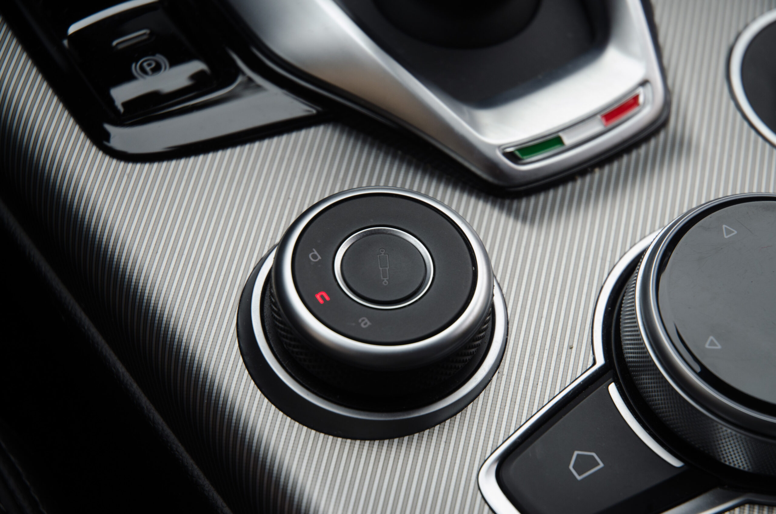 Balra a Tonale üzemmódválasztója látható, középen a Giulia Quadrifoglio ugyanezen alkatrésze, jobb oldalon pedig a tesztalany Competizione tekerője: nem hiányzik valami az utolsó képről?