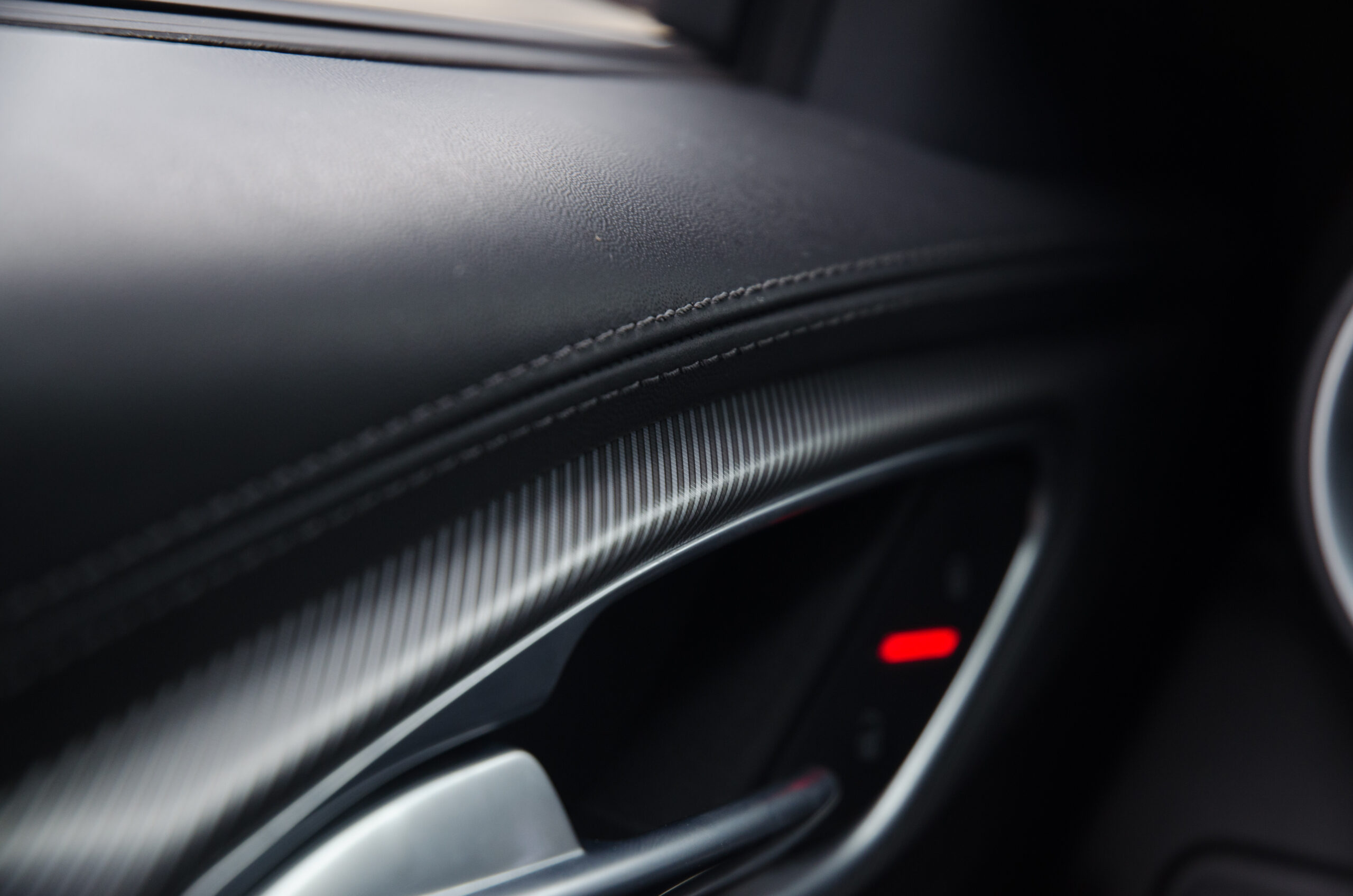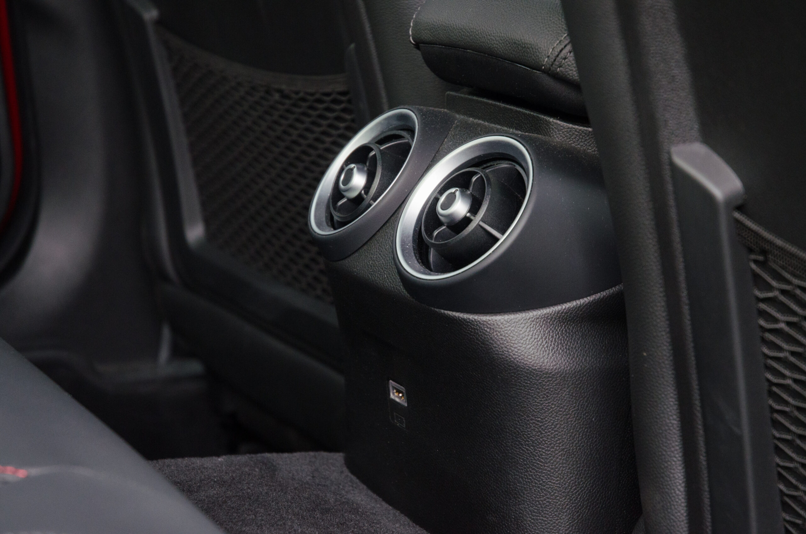 A térérzet az első sorban teljesen rendben van, ahogy az ergonómia is. Könnyű tökéletes üléspozíciót találni, ám hozzá kell tenni, hogy nagyon alacsonyan kell helyet foglalni a Giuliában. Hátul már kevésbé felhőtlen a helyzet, a beltér egyértelműen 4 főre szabott. Ennek fő oka a meglepően magas kardánalagút, itt is látszik, hogy a hibrid rendszerek befogadására is alkalmatlan Giorgio platform mennyire a múlt elvei alapján készült. Az említett két felnőttnek azonban hátul is korrekt lábteret és minden téren megfelelő kényelmet ad a Giulia, illetve egy 480 literes csomagtartóval is rendelkezik, így akár még kisebb családi autónak is elmehet másodállásban.