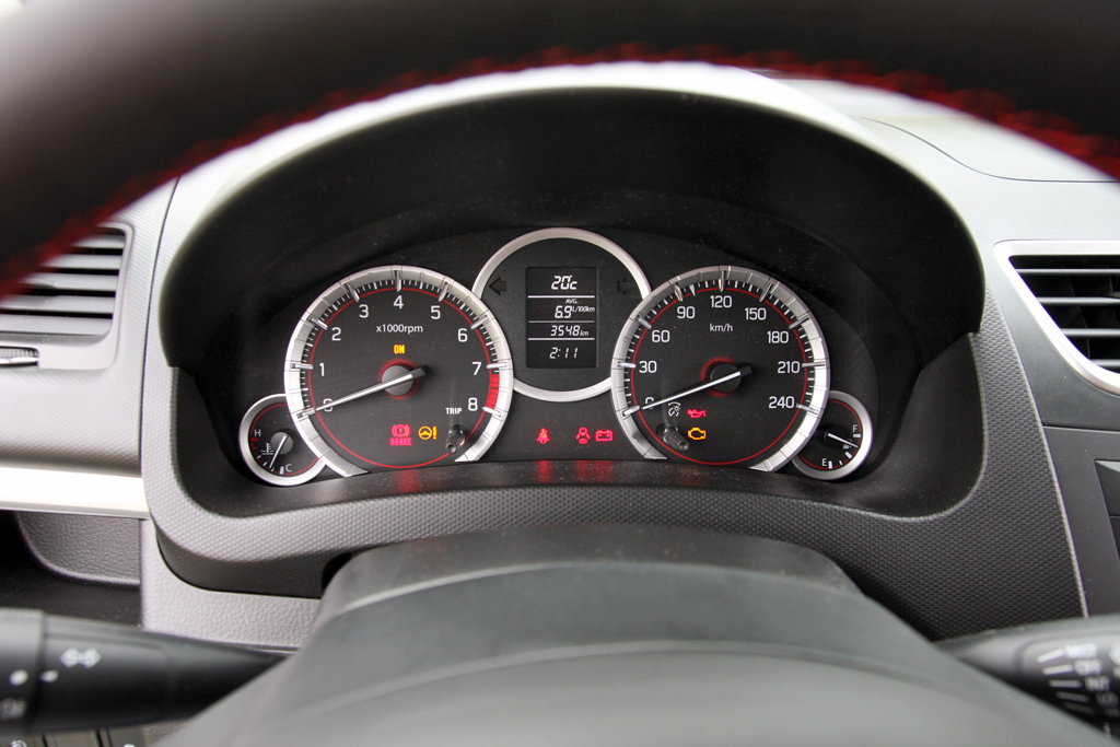 Hogy a csomagtartó aprócska, mindössze 211 literes és bővítve sem öblös: általános Swift-betegség. A gyógyír akár erre, akár másra, hogy nem kell a jeladóval matatni, az okoskulcs széria a Sportnál, mint egyebek mellett a xenon, az automata klíma, az ülésfűtés, a tempomat, a telefonkihangosító, az USB-csatlakozó is. Az ESP, a 7 légzsák szintén. Ja, LED-es a kiegészítő féklámpa, a vezető oldalán meg fölfelé is automata az ablakemelő. A tükör elektromosan behajtható, a hátsó ülés támlája osztottan dönthető (nem úgy, mint a 3 ajtósnál). Tárolórekeszből amennyi és amekkora szükséges, van. Az ergonómia megfelelő, a kormányoszlop tengelyirányban is állítható. Szépséghiba, hogy a fedélzeti számítógép lapozójához át kell nyúlni a bőrbe varrt, piros cérnás volánon. A kijelzők lehetnének divatosabbak, lehetnének, igen. Majd lesznek a modellváltáskor. A kilométeróra 30-as osztását szokni kell, idővel nem zavaró. Tőle balra a másik óra mutatóját bezzeg időről időre kötelező tiltásig űzni, hogy legyen értelme a dolognak.