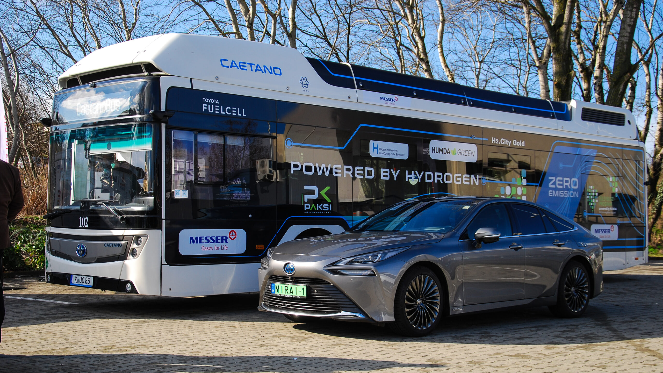 Hasonló technológia, teljesen más méretben: a képen látható Toyota Mirai sem kicsi, csak annak tűnik a 12 méteres busz mellé álltva