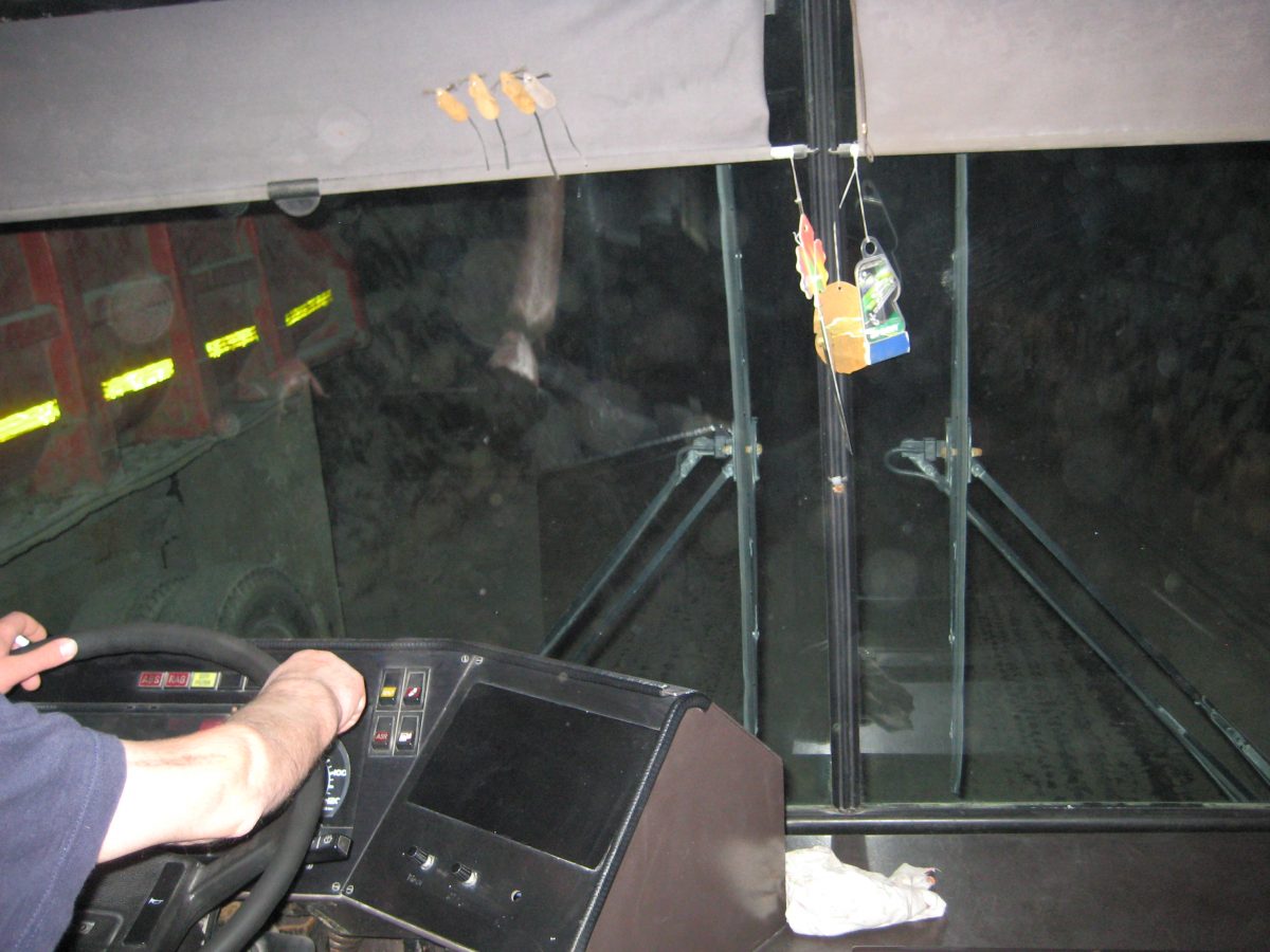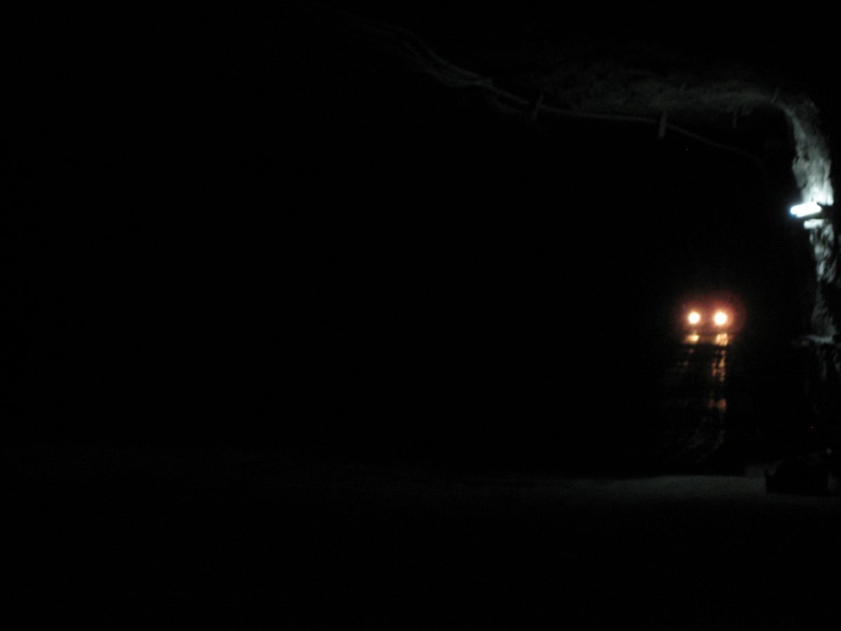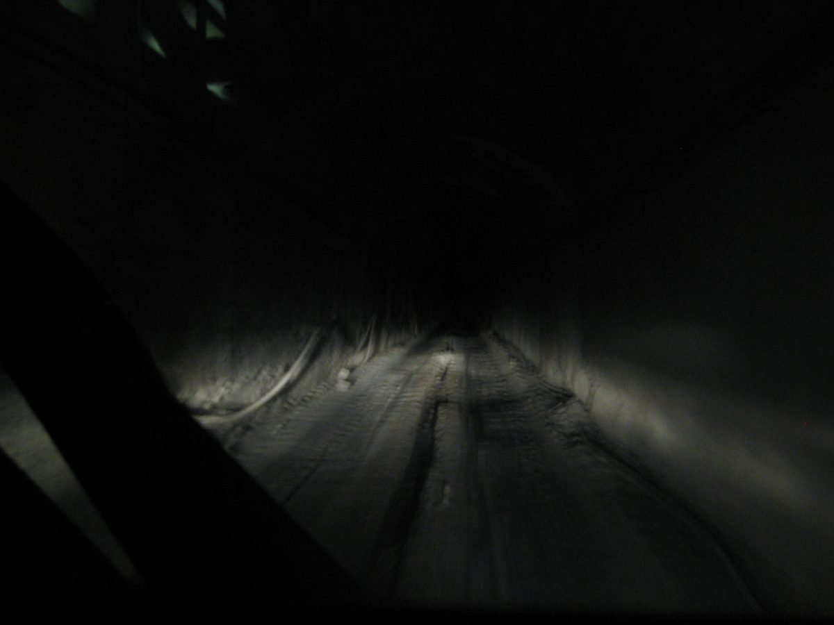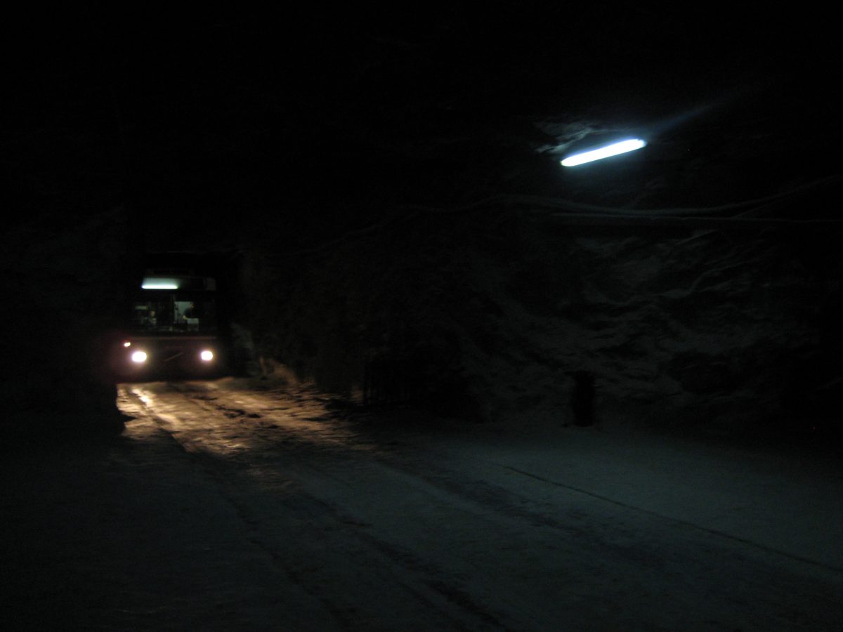 A padlólemezen át érezni a kimustrált dízelmotor minden egyes rezdülését, amely leírhatatlan szaggal párosul. Aztán egyszer csak záródnak az ajtók, s a busz kövér gázzal a bánya bejárata felé veszi az irányt. Határozottan mozog, egyenesen és gyorsan haladunk a föld alatt egy vaksötét, másfél kilométeres szűk alagútban jó néhány percen át. Gyanítom, hogy a sofőr álmából felébresztve is ismeri már az alagút minden egyes törését, de azért nem örülnék neki, ha kiégnének a fényszórók. Ráadásul úgy fest, csupán centiméterek vannak az ablak és a fal közt, az első szélvédőn kinézve látni a göröngyös útfelületet - amin nap mint nap, a forgalomhoz igazítva jár a bányavállalat flottája.