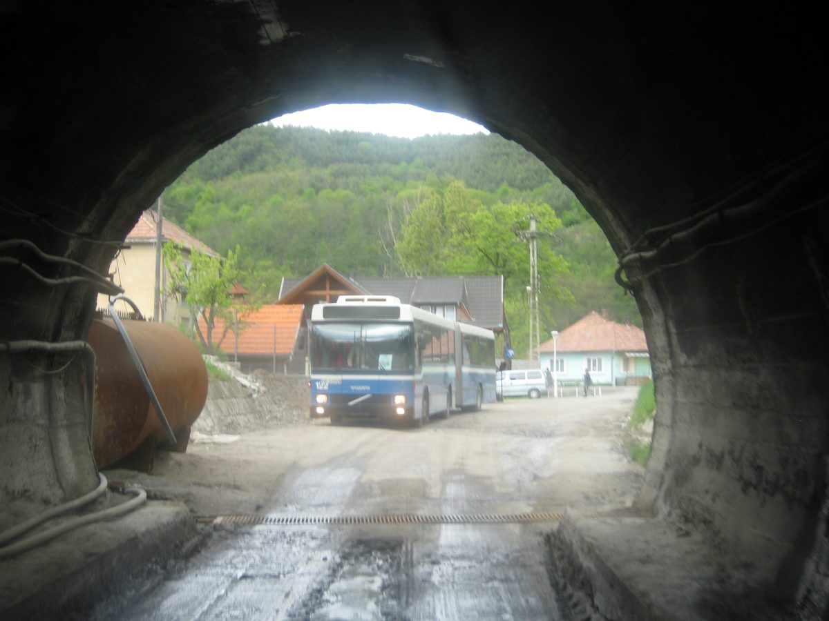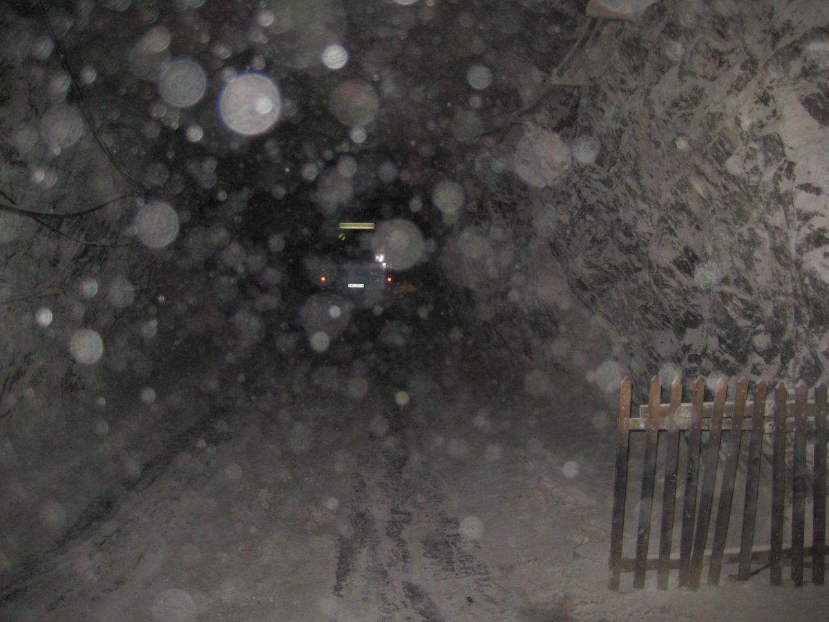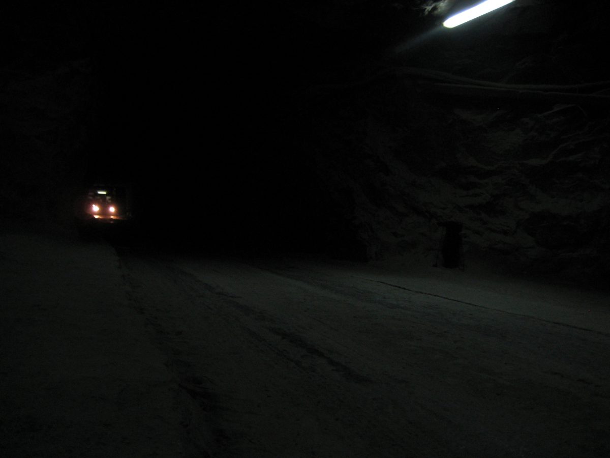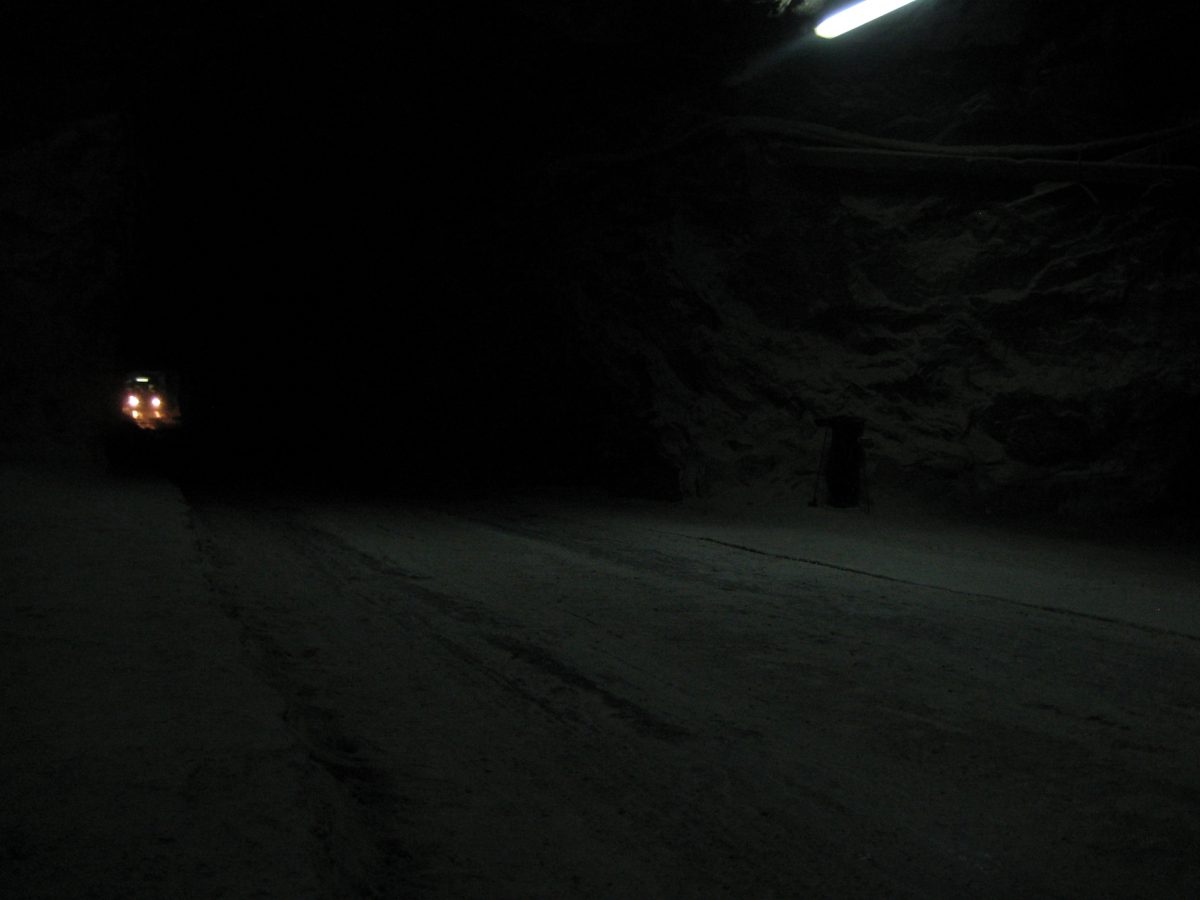A padlólemezen át érezni a kimustrált dízelmotor minden egyes rezdülését, amely leírhatatlan szaggal párosul. Aztán egyszer csak záródnak az ajtók, s a busz kövér gázzal a bánya bejárata felé veszi az irányt. Határozottan mozog, egyenesen és gyorsan haladunk a föld alatt egy vaksötét, másfél kilométeres szűk alagútban jó néhány percen át. Gyanítom, hogy a sofőr álmából felébresztve is ismeri már az alagút minden egyes törését, de azért nem örülnék neki, ha kiégnének a fényszórók. Ráadásul úgy fest, csupán centiméterek vannak az ablak és a fal közt, az első szélvédőn kinézve látni a göröngyös útfelületet - amin nap mint nap, a forgalomhoz igazítva jár a bányavállalat flottája.