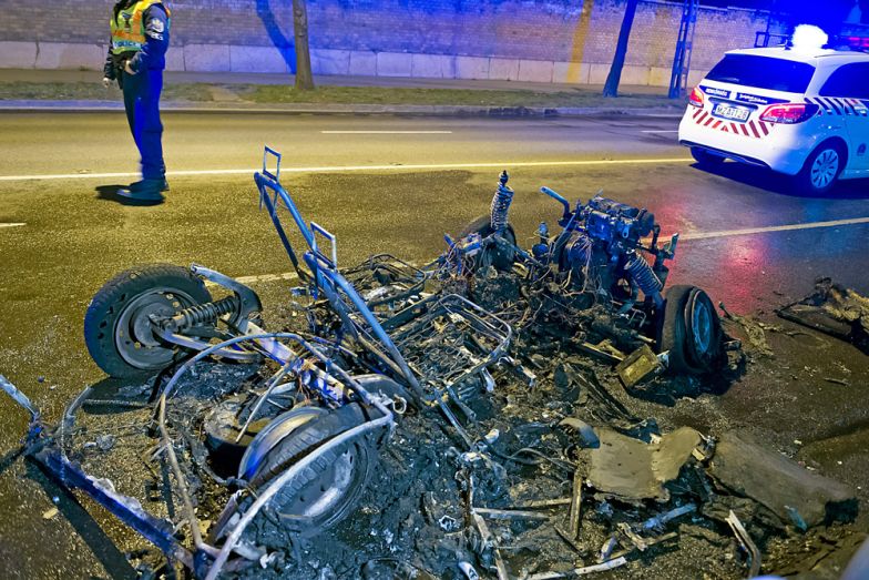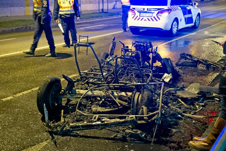 A roncsok alapján nem egy szupersportautóról lehet szó, hiszen a gumik nem túl szélesek és a motor is maximum négyhengeres lehet (Fotó: MTI)