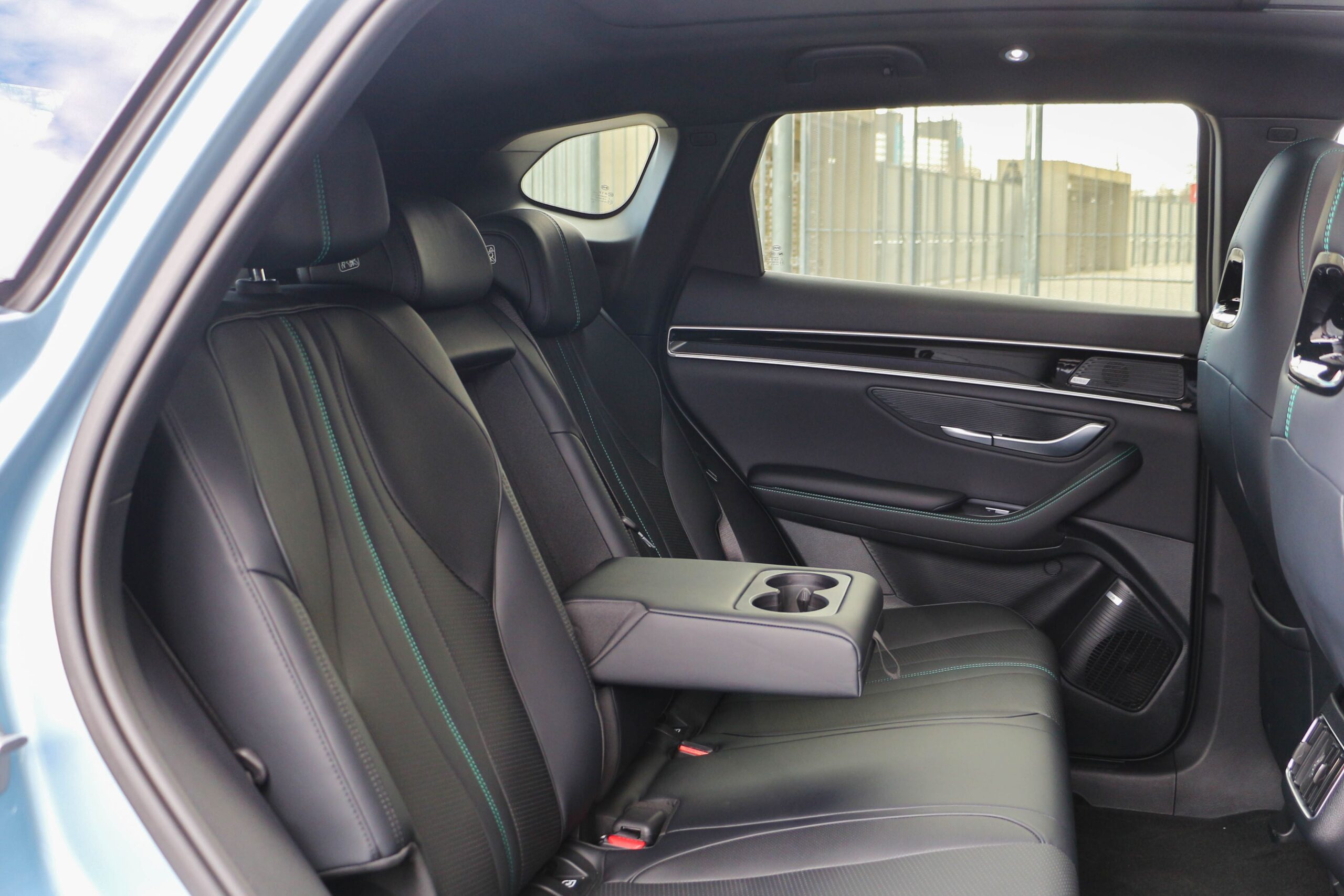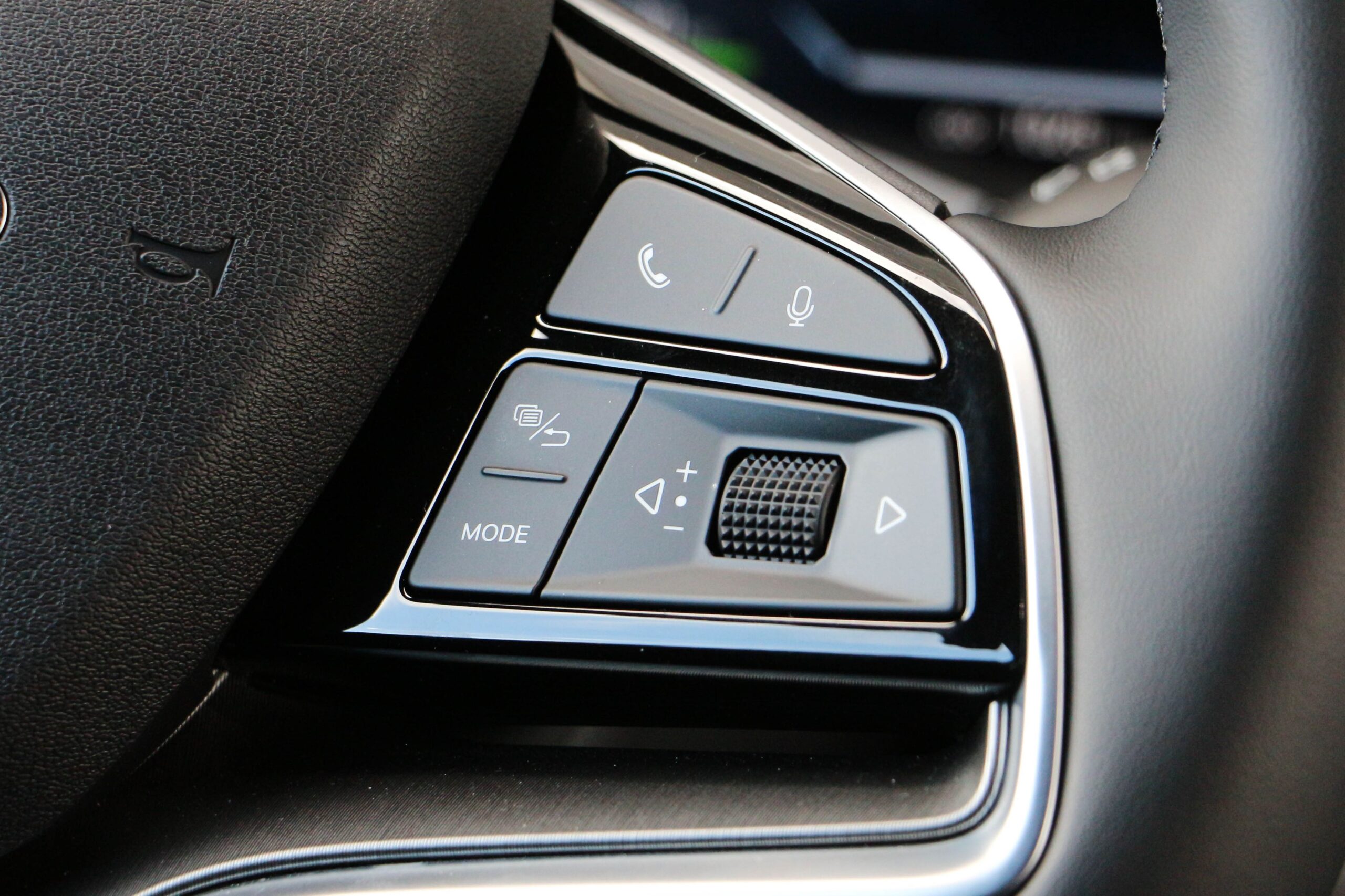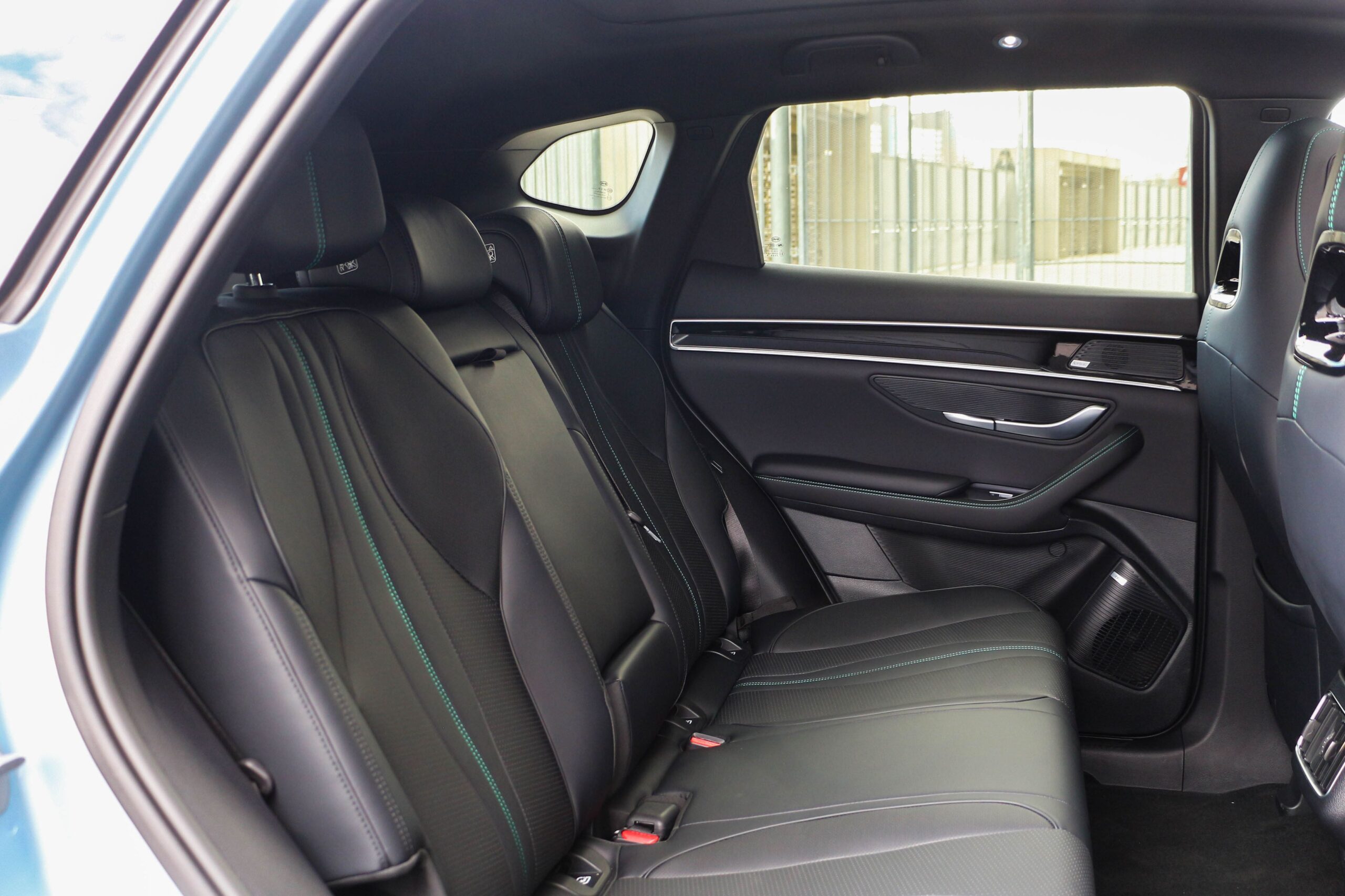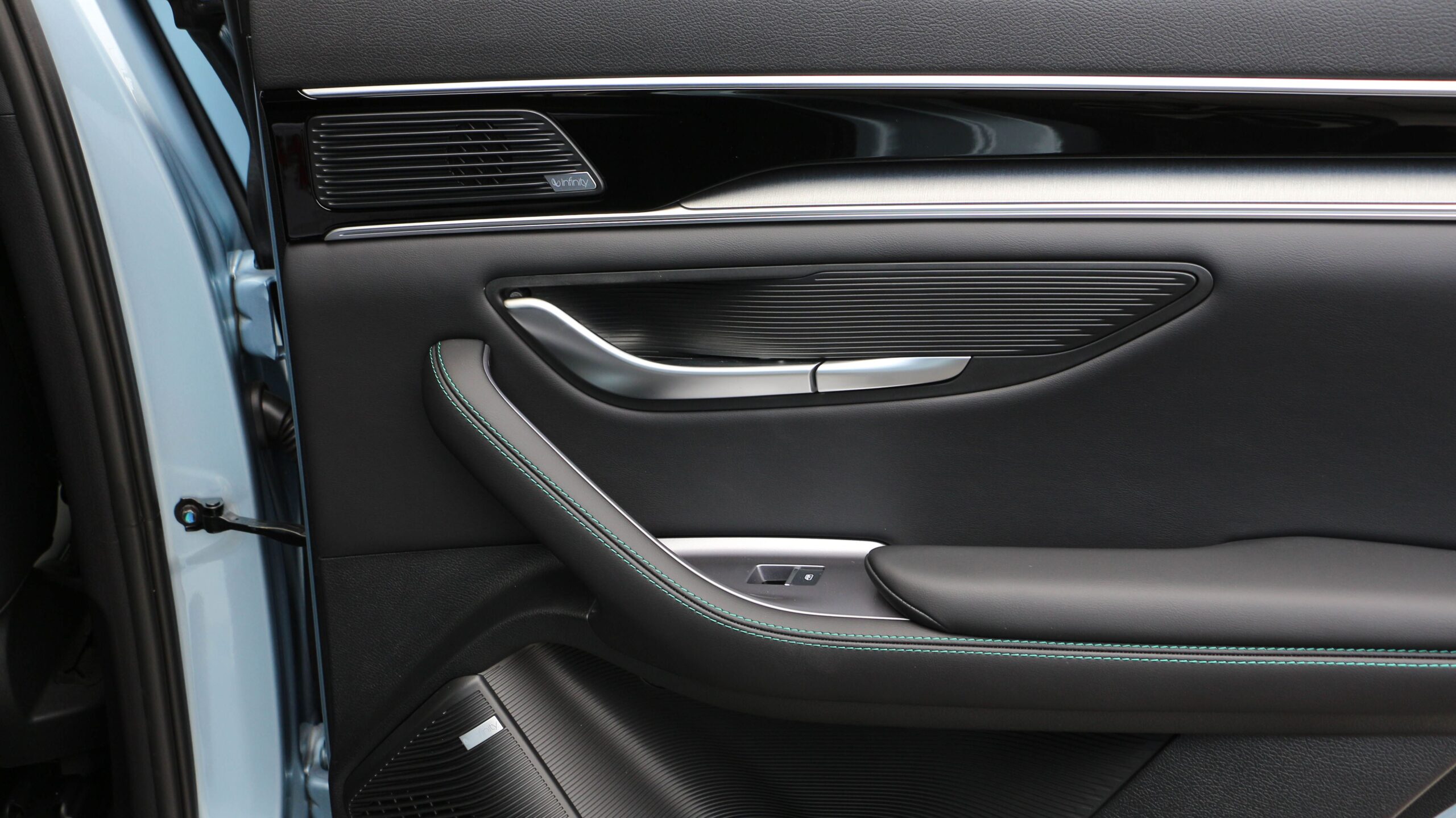 Az utastér a külsőhöz hasonlóan az óceán tematikát követi, például a bőrkárpitokat zöldeskék cérnával varrták, amely ugyancsak utalás a vízre, illetve a belső térben végighúzott vonalak is az víz hullámzását hivatottak szimbolizálni. A színház mellett nyilván a praktikumra is törekedtek, hiszen a vegán bőrből készített ülések – amellett hogy jól néznek ki – nagyon kényelmesek, talán csak az oldaltartásuk lehetne jobb. Az anyaghasználat minőségi, a műszerfalon egy hatalmas, 15,6 colos kijelző kapott helyet (Design kivitelbe, mert a Comfortban ez csupán 12,8 colos), a vezető előtt pedig 12,3 colos digitális műszeregység található, amely természetesen személyre is szabható. Ha valakinek még ez is kevés lenne, akkor adott a HUD is. Az infotainment rendszer gyors, nagyon jól használható, és van néhány fizikai gomb is a középkonzolon, de többnyire a központi képernyőn lehet állítgatni mindent, illetve hangvezérléssel, igaz ezt egyelőre csak angolul, viszont a kezelőfelület kapott magyar fordítást.