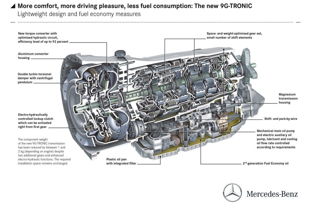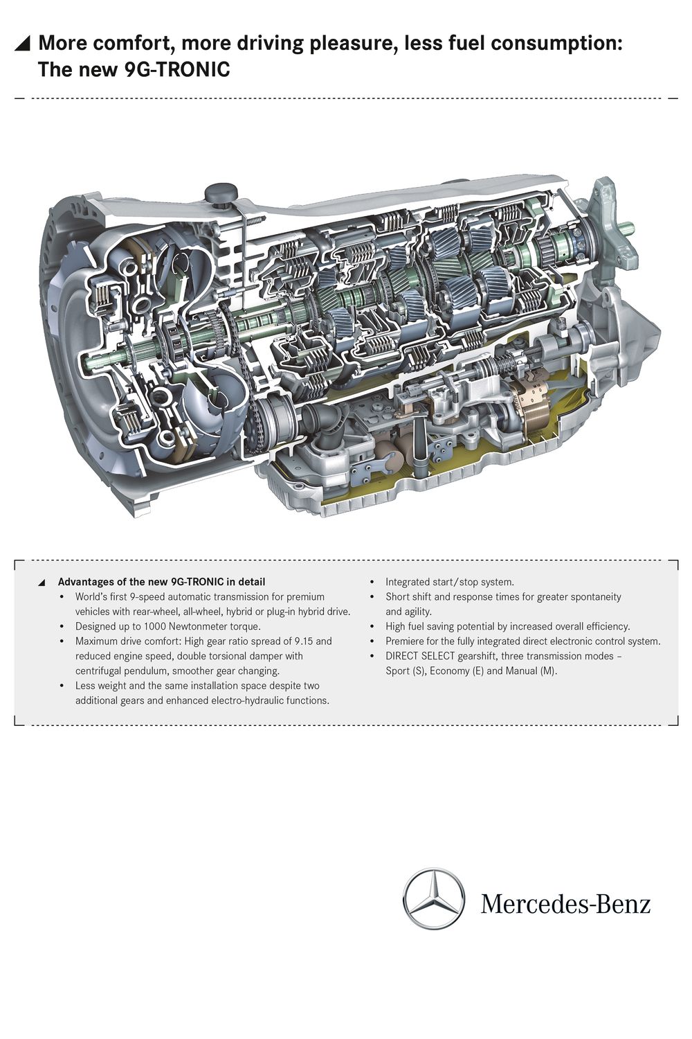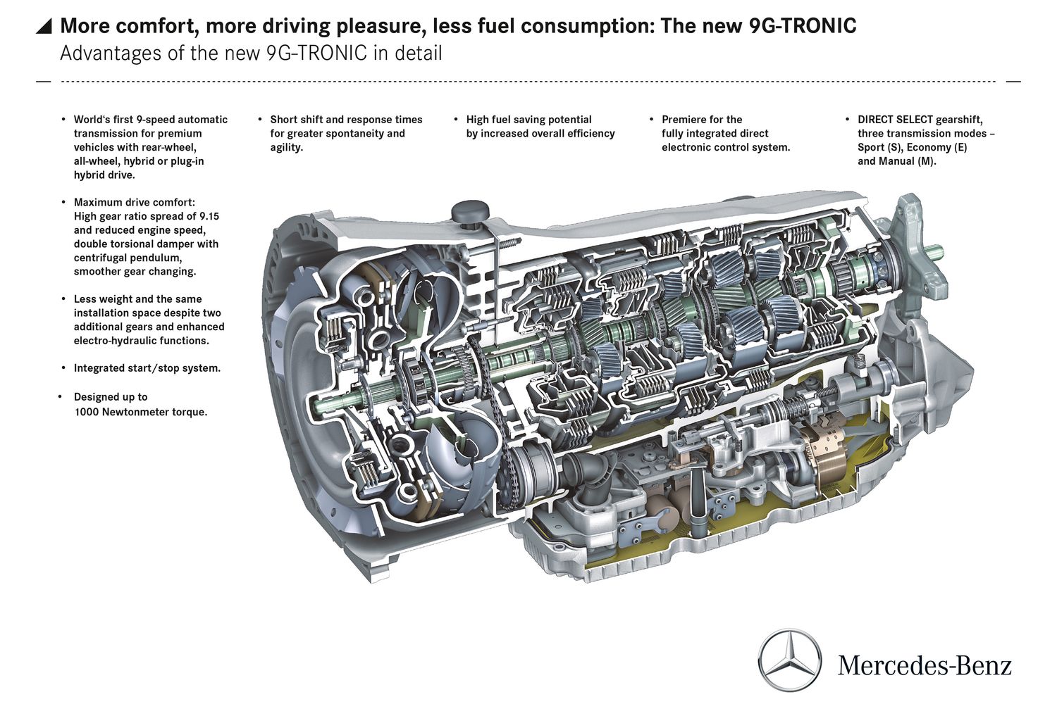 A motor átlagos fordulatszámának csökkentésével javul az NVH - kényelem (zaj, vibráció, keménység), s a hosszabb áttételezés a külső zajt is csökkenti akár 4 dB(A) értékkel, mérsékelve a környezetre jutó terhelést. A 9 fokozat áttételének 9,15-ös az aránya, ami döntő jelentőséggel bír a magas fokú hatékonyság és a menetkomfort szempontjából. A 9G-TRONIC sebesen és puhán kapcsol, 130 km/órás tempónál percenkénti 1500-as fordulat alatt pihenteti a motort. A bolygóműben elhelyezett kettős turbinás torziós csillapítás és a centrifugális (röpsúlyos) erőinga kivételes vezetési kényelemről gondoskodik, ugyanakkor a két extra fokozat és az akár 1000 Nm-es maximális bemeneti forgatónyomaték ellenére az új váltó épp olyan kis helyre beépíthető, mint elődje, miközben annál alacsonyabb tömegű. A kétrészes váltóház-kialakítás megmaradt: a nyomaték-átalakító háza alumíniumból készül, a váltóház pedig, amelyhez optimalizált súlyú műanyag olajteknő tartozik, még könnyebb magnézium ötvözetből áll.