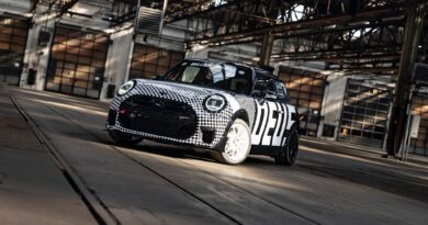 Az éjszakai fények különösen kihozzák az egyediségét. Hiába sokkal nagyobb, mint ikonikus őse, a Mini – kabrióként is- még mindig csupán 3,85 méter hosszú