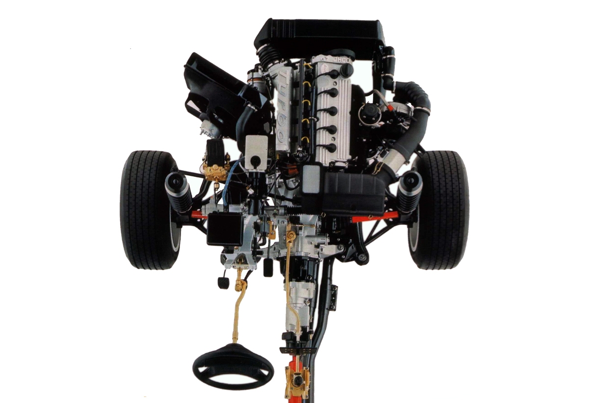 Ahogy a vázrajz is mutatja, az ős DKW-k óta a jellegzetes hosszában beépített soros motor jó alap volt a négykerékhajtás kialakításához. A quattro persze öthengeres és turbós is