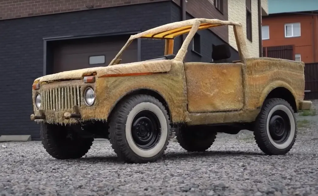 Ezúttal hegesztő- helyett ragasztópisztolyhoz nyúlt az orosz Garage54 csapata, hogy megalkossa a világ első ragasztóból épített Niváját. Előtte azért a flexet is elővették, a szebb napokat látott terepjáró fém karosszériáját eltávolították, helyet adva ezzel a folyékony matériának. Ebben az esetben a munka nem fizikailag volt megterhelő, inkább mentálisan, a rétegek száradása és a lassan csordogáló ragasztó borzasztó időigényessé és unalmassá tette az „autógyártás”. Niva lévén a tesztet terepen végezték, ahol kiválóan vizsgázott az autó. Az orosz 4x4-est egyáltalán nem kímélték, ennek ellenére egyben maradt, így egész biztosan viszontlátjuk még a csatornán.
