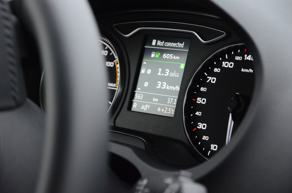 A váltó olyan simán kapcsol, hogy semmit sem venni észre. A fordulatszámmérő hiányában itt már nem látni a fordulatszám esést váltáskor, emiatt nem lehet megmondani, hogy mikor történt a kapcsolás. Mindez akkor igaz, ha tisztán elektromos üzemben autózunk. Annyira folyamatos, szakadás nélküli és rángatásmentes a gyorsulás, mintha repülőgépen ülne az ember. Erőteljes gázadáskor viszont beröffen a négyhengeres benzines és előtör a jól megszokott hang a motortérből. Az egyes üzemállapotokról a középső MMI kijelzőn kapunk információt. Színekkel és nyílfolyamokkal tájékoztat az A3-as arról, hogy melyik motor dolgozik és az energia áramlásának irányát is jelzi.