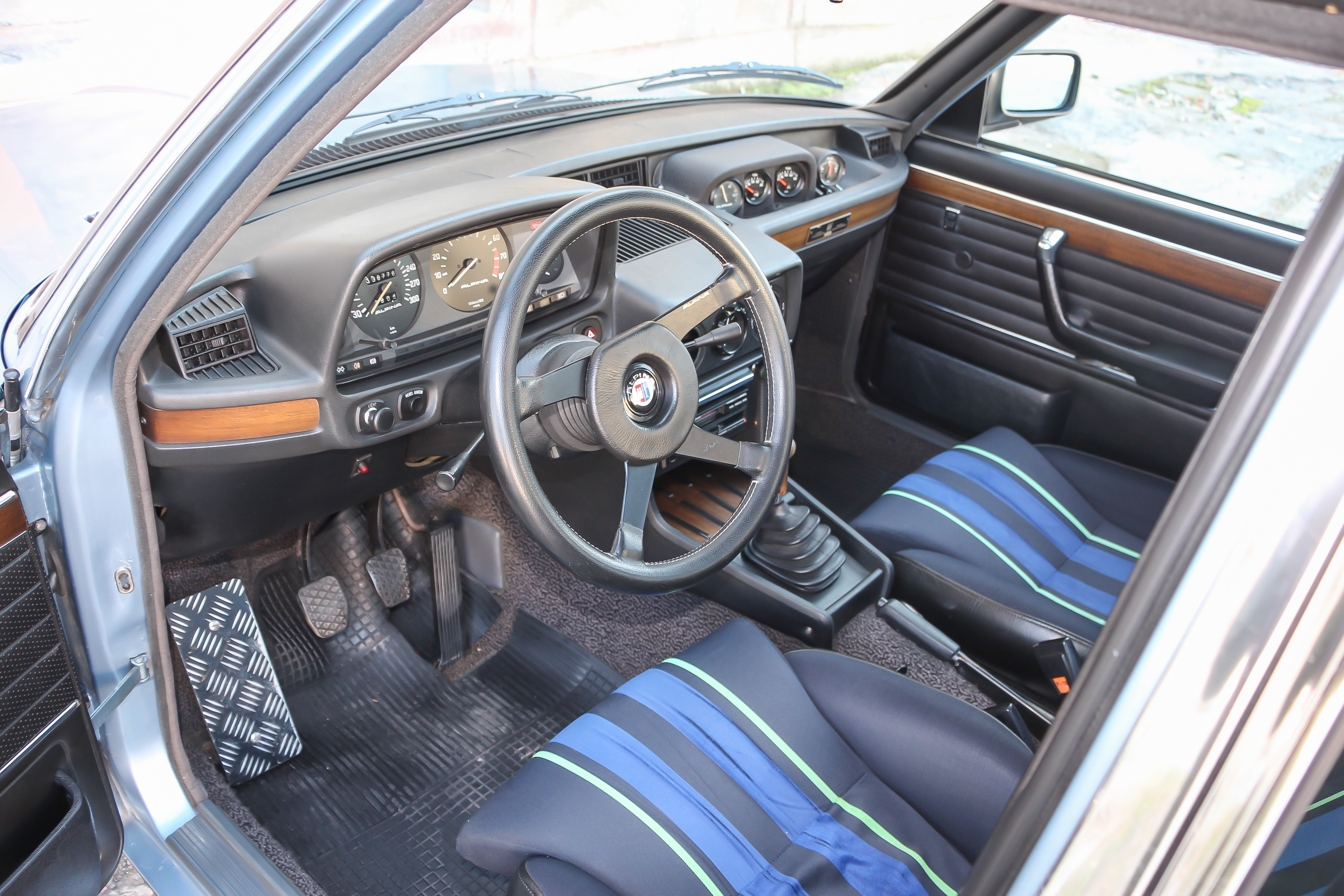 Minden Alpina 5-ösnél alapfelszereltség volt a napfénytető, a két elektromos ablak és a központi zár is. Ezek ekkoriban még mind elég menő dolgok voltak. A taposó Alpina tartozék, a váltógomb és a sportkormány széria. Apropó váltó, fordított kiosztású és ötsebességes - azaz az egyes balra lent van, a négy magasabb fokozatot meg H-rendszerben kapcsolhatjuk, kettes középen fönt, hármas lent, és így tovább, a hátramenetet a BMW-knél szokott helyen, a határolót átnyomva balra elöl találjuk. Az Alpina tuningnak elengedhetetlen korszakos eleme az önzáró differenciálmű, ami itt - gondolva az igénybevételre - külön hűtést is kapott.