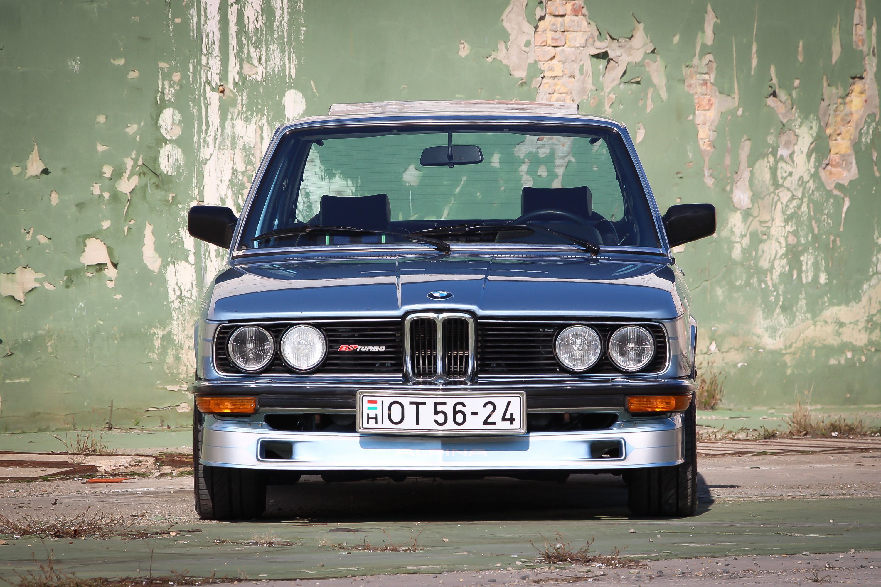 Az első fejezet az alig 149 példányban készült, eredeti '78-as Alpina. Nézegessük kicsit ezt a gleccserkék kocsit! Nem BMW, azaz persze BMW-nek indult, de végül sokkal több lett. Egy kis bajor község, Buchloe dicsekedhet egy Nobel-díjassal, de mégis a legnagyobb nevezetessége az 1965-ben indult BMW tuningcég, az Alpina Burkard Bovensiepen GmbH & Co. KG. Mai autócsodánk meg egy Alpina B7 Turbo, ami még valóban tuning BMW-nek született, de mivel 1983 óta a német hatóságok elismerték önálló gyártónak a kis manufaktúrát, nevezzük csak nyugodtan a saját nevén. Maga az alap kocsi a BMW E12-es szériája, azaz az első generációs 5-ös. A sorozat 1976-ban lett átdolgozva, külsején a nagyobb és a már domború motorházba nyúló vesék, meg az átrajzolt és nagyobb hátsó lámpák jelentették a változást. A tankbetöltő átkerült a hátsó rendszám jobbjáról a jobb hátsó sárvédőre. Ezen a konkrét autón már króm helyett műanyagok a külső tükrök is.