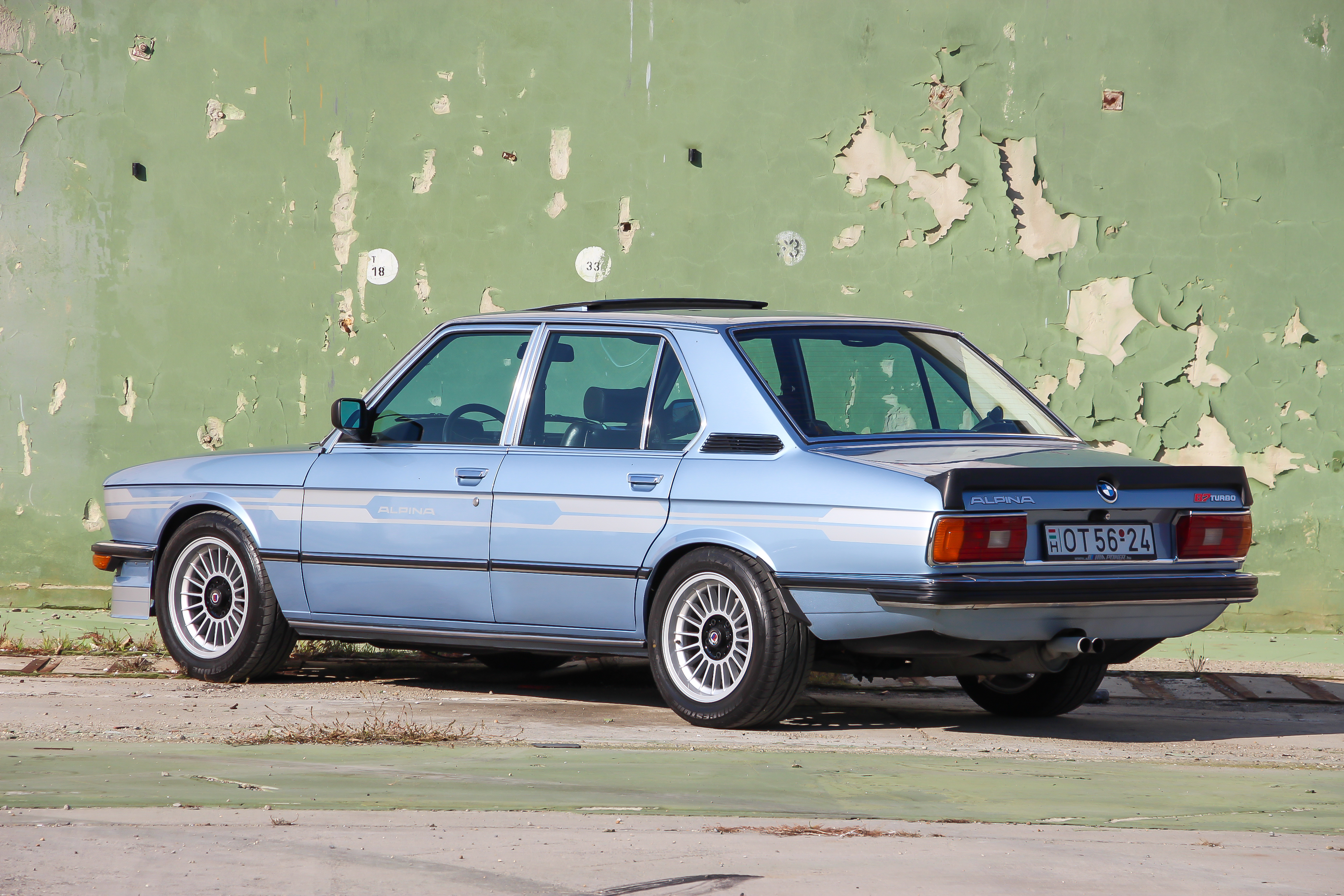 A matrica korabeli gyári eredeti, közelről nézve van benne pár patinás színeltérés, hiszen elfekvő tétel volt három évtizeden át, de az értékét nem is lehet egy utángyártottéhoz hasonlítani. Ilyen alapokkal nem volt nehéz átlépdelni a veteránvizsgán. Mivel egy összesen csupán 149 példányban épült kis széria tagjáról van szó, így kifejezetten érdekes, hogy a 99. példány is kész lett 1978-ra. 1981-ig készültek a BMW E12 alapú Alpinák, 1980-ban álltak át a még erősebb, már 3,5 literes és 330 lóerős B7 Turbo S-re. 1978-ban ez volt a világ leggyorsabb négyajtós limuzinja, ezért bekerült a Guinness Rekordok könyvébe is. Sokáig meg is tartotta ezt a címet.